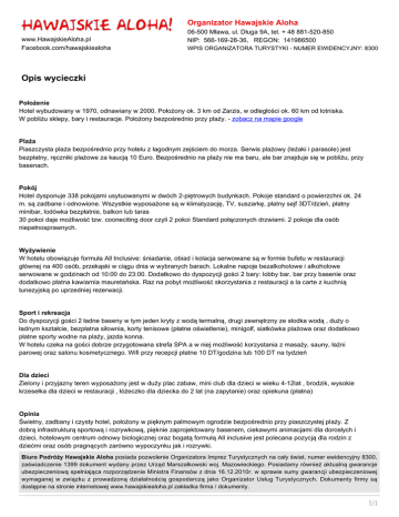 Organizator Hawajskie Aloha www.HawajskieAloha.pl Facebook.com/hawajskiealoha 06-500 Mława, ul. Długa 9A, tel. + 48 881-520-850 NIP: 566-169-28-36, REGON: 141986500 WPIS ORGANIZATORA TURYSTYKI - NUMER EWIDENCYJNY: 8300 Opis wycieczki Położenie Hotel wybudowany w 1970, odnawiany w 2000. Położony ok. 3 km od Zarzis, w odległości ok. 60 km od lotniska. W pobliżu sklepy, bary i restauracje. Położony bezpośrednio przy plaży. - zobacz na mapie google Plaża Piaszczysta plaża bezpośrednio przy hotelu z łagodnym zejściem do morza. Serwis plażowy (leżaki i parasole) jest bezpłatny, ręczniki plażowe za kaucją 10 Euro. Bezpośrednio na plaży nie ma baru, ale bar znajduje się w pobliżu, przy basenach. Pokój Hotel dysponuje 338 pokojami usytuowanymi w dwóch 2-piętrowych budynkach. Pokoje standard o powierzchni ok. 24 m. są zadbane i odnowione. Wszystkie wyposażone są w klimatyzację, TV, suszarkę, płatny sejf 3DT/dzień, płatny minibar, lodówka bezpłatnie, balkon lub taras 30 pokoi daje możliwość tzw. cooneciting door czyli 2 pokoi Standard połączonych drzwiami. 2 pokoje dla osób niepełnosprawnych. Wyżywienie W hotelu obowiązuje formuła All Inclusive: śniadanie, obiad i kolacja serwowane są w formie bufetu w restauracji głównej na 400 osób, przekąski w ciągu dnia w wybranych barach. Lokalne napoje bezalkoholowe i alkoholowe serwowane w godzinach od 10:00 do 23:00. Dodatkowo do dyspozycji gości 2 bary: lobby bar, bar przy basenie oraz dodatkowo płatna kawiarnia mauretańska. Raz na pobyt możliwość skorzystania z restauracji a la carte z kuchnią tunezyjską po uprzedniej rezerwacji. Sport i rekreacja Do dyspozycji gości 2 ładne baseny w tym jeden kryty z wodą termalną, drugi zewnętrzny ze słodka wodą , duży o ładnym kształcie, bezpłatna siłownia, korty tenisowe (płatne oświetlenie), minigolf, siatkówka plażowa oraz dodatkowo płatne sporty wodne na plaży, jazda konna. W hotelu czeka na gości dobrze przygotowana strefa SPA a w niej możliwość korzystania z masaży, sauny, łaźni parowej oraz salonu kosmetycznego. Wifi przy recepcji płatne 10 DT/godzina lub 100 DT na tydzień Dla dzieci Zielony i przyjazny teren wyposażony jest w duży plac zabaw, mini club dla dzieci w wieku 4-12lat , brodzik, wysokie krzesełka dla dzieci w restauracji , łóżeczko dla dziecka do 2 lat (na zapytanie) oraz opiekuna (płatna) Opinia Świetny, zadbany i czysty hotel, położony w pięknym palmowym ogrodzie bezpośrednio przy piaszczystej plaży. Z dobrą infrastrukturą sportową i rozrywkową, pięknie zaprojektowany basenem, ciekawymi animacjami dla dorosłych i dzieci, hotelowym centrum odnowy biologicznej oraz bogatą formułą All inclusive jest polecana pozycją dla rodzin z dziećmi oraz osób pragnących zarówno wypoczynku jak i rozrywki. Biuro Podróży Hawajskie Aloha posiada pozwolenie Organizatora Imprez Turystycznych na cały świat, numer ewidencyjny 8300, zaświadczenie 1399 dokument wydany przez Urząd Marszałkowski woj. Mazowieckiego. Posiadamy również aktualną gwarancje ubezpieczeniową spełniająca rozporządzenie Ministra Finansów z dnia 16.12.2010r. w sprawie sumy gwarancji ubezpieczeniowej wymaganej w związku z prowadzoną działalnością gospodarczą jako Organizator Usług Turystycznych. Dokumenty firmy są dostępne na stronie internetowej www.hawajskiealoha.pl zakładka firma / dokumenty. 1/1