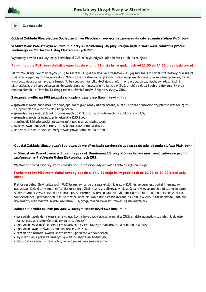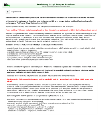 Powiatowy Urząd Pracy w Strzelinie http://pupstrzelin.pl/wydarzenie/93/zaproszenie Zaproszenie Oddział Zakładu Ubezpieczeń Społecznych we Wrocławiu serdecznie zaprasza do odwiedzenia stoiska PUE-room w Starostwie Powiatowym w Strzelinie przy ul. Kamiennej 10, przy którym będzie możliwość założenia profilu zaufanego na Platformie Usług Elektronicznych ZUS. Wystarczy dowód osobisty, żeby konsultanci ZUS założyli indywidualne konto od ręki na miejscu. Punkt mobilny PUE-room zlokalizowany będzie w dniu 21 maja br. w godzinach od 12.00 do 14.00 przed salą obrad. Platforma Usług Elektronicznych (PUE) to zestaw usług dla wszystkich klientów ZUS. Jej sercem jest portal internetowy pue.zus.pl. Dzięki tej wygodnej formie kontaktu z ZUS można zrealizować większość spraw związanych z ubezpieczeniami społecznymi bez wychodzenia z domu – przez Internet. W ten sposób nie tylko dostaje się informacje o ubezpieczeniach, świadczeniach i płatnościach, ale i sprawdza wszelkie swoje dane zamieszczone na koncie w ZUS, a także składa i odbiera dokumenty oraz rozlicza składki (e-Płatnik). Tą drogą można również umówić się na wizytę w ZUS. Założenie profilu na PUE pozwala w każdym czasie użytkownikowi m.in.: ● ● ● ● ● ● sprawdzić swoje dane oraz stan swojego konta jako osoby ubezpieczonej w ZUS, a także sprawdzić czy płatnik składek zgłosił naszych członków rodziny do ubezpieczeń, sprawdzić wysokość składek przekazanych do OFE oraz zgromadzonych na subkoncie w ZUS, sprawdzić swoje zaświadczenie lekarskie ZUS ZLA, prześledzić historię swoich ubezpieczeń i pobieranych świadczeń, wyliczyć swoja przyszłą emeryturę w kalkulatorze emerytalnym, śledzić stan swoich spraw i otrzymywać powiadomienia na e-mail. Oddział Zakładu Ubezpieczeń Społecznych we Wrocławiu serdecznie zaprasza do odwiedzenia stoiska PUE-room w Starostwie Powiatowym w Strzelinie przy ul. Kamiennej 10, przy którym będzie możliwość założenia profilu zaufanego na Platformie Usług Elektronicznych ZUS. Wystarczy dowód osobisty, żeby konsultanci ZUS założyli indywidualne konto od ręki na miejscu. Punkt mobilny PUE-room zlokalizowany będzie w dniu 21 maja br. w godzinach od 12.00 do 14.00 przed salą obrad. Platforma Usług Elektronicznych (PUE) to zestaw usług dla wszystkich klientów ZUS. Jej sercem jest portal internetowy pue.zus.pl. Dzięki tej wygodnej formie kontaktu z ZUS można zrealizować większość spraw związanych z ubezpieczeniami społecznymi bez wychodzenia z domu – przez Internet. W ten sposób nie tylko dostaje się informacje o ubezpieczeniach, świadczeniach i płatnościach, ale i sprawdza wszelkie swoje dane zamieszczone na koncie w ZUS, a także składa i odbiera dokumenty oraz rozlicza składki (e-Płatnik). Tą drogą można również umówić się na wizytę w ZUS. Założenie profilu na PUE pozwala w każdym czasie użytkownikowi m.in.: ● ● ● ● ● ● sprawdzić swoje dane oraz stan swojego konta jako osoby ubezpieczonej w ZUS, a także sprawdzić czy płatnik składek zgłosił naszych członków rodziny do ubezpieczeń, sprawdzić wysokość składek przekazanych do OFE oraz zgromadzonych na subkoncie w ZUS, sprawdzić swoje zaświadczenie lekarskie ZUS ZLA, prześledzić historię swoich ubezpieczeń i pobieranych świadczeń, wyliczyć swoja przyszłą emeryturę w kalkulatorze emerytalnym, śledzić stan swoich spraw i otrzymywać powiadomienia na e-mail.