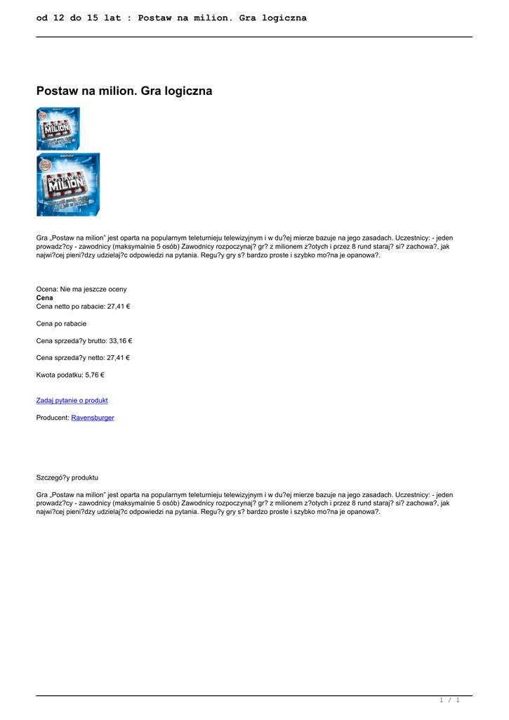 od 12 do 15 lat : Postaw na milion. Gra logiczna Postaw na milion. Gra logiczna Gra „Postaw na milion” jest oparta na popularnym teleturnieju telewizyjnym i w du?ej mierze bazuje na jego zasadach. Uczestnicy: - jeden prowadz?cy - zawodnicy (maksymalnie 5 osób) Zawodnicy rozpoczynaj? gr? z milionem z?otych i przez 8 rund staraj? si? zachowa?, jak najwi?cej pieni?dzy udzielaj?c odpowiedzi na pytania. Regu?y gry s? bardzo proste i szybko mo?na je opanowa?. Ocena: Nie ma jeszcze oceny Cena Cena netto po rabacie: 27,41 € Cena po rabacie Cena sprzeda?y brutto: 33,16 € Cena sprzeda?y netto: 27,41 € Kwota podatku: 5,76 € Zadaj pytanie o produkt Producent: Ravensburger Szczegó?y produktu Gra „Postaw na milion” jest oparta na popularnym teleturnieju telewizyjnym i w du?ej mierze bazuje na jego zasadach. Uczestnicy: - jeden prowadz?cy - zawodnicy (maksymalnie 5 osób) Zawodnicy rozpoczynaj? gr? z milionem z?otych i przez 8 rund staraj? si? zachowa?, jak najwi?cej pieni?dzy udzielaj?c odpowiedzi na pytania. Regu?y gry s? bardzo proste i szybko mo?na je opanowa?. 1 / 1 Powered by TCPDF (www.tcpdf.org)