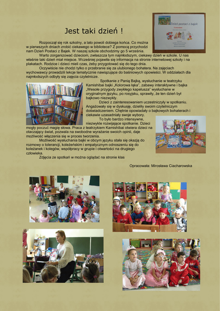 Jest taki dzień ! Rozpoczął się rok szkolny, a lato powoli dobiega końca. Co można w pierwszych dniach zrobić ciekawego w bibliotece? Z pomocą przychodzi nam Dzień Postaci z Bajek. W naszej szkole obchodzimy go 5 września. Warto zorganizować dzieciom, zwłaszcza tym najmłodszym, ciekawy dzień w szkole. U nas właśnie taki dzień miał miejsce. Wcześniej pojawiła się informacja na stronie internetowej szkoły i na plakatach. Rodzice i dzieci mieli czas, żeby przygotować się do tego dnia. Oczywiście nie chodzi tylko o przebranie się za ulubionego bohatera. Na zajęciach wychowawcy prowadzili lekcje tematycznie nawiązujące do baśniowych opowieści. W oddziałach dla najmłodszych odbyły się zajęcia czytelnicze. Spotkanie z Panią Bajką, wysłuchanie w teatrzyku Kamishibai bajki „Kolorowa łąka”, zabawy interaktywne i bajka „Wesołe przygody zwykłego kapelusza” wysłuchane w oryginalnym języku, po rosyjsku, sprawiły, że ten dzień był bajkowo niezwykły. Dzieci z zainteresowaniem uczestniczyły w spotkaniu. Angażowały się w dyskusję, dzieliły swoim czytelniczym doświadczeniem. Chętnie opowiadały o bajkowych bohaterach i ciekawie uzasadniały swoje wybory. To było bardzo intensywne, niezwykle rozwijające spotkanie. Dzieci mogły poczuć magię słowa. Praca z teatrzykiem Kamishibai otwiera dzieci na otaczający świat, pozwala na swobodne wyrażanie swoich opinii, daje możliwość włączenia się w proces tworzenia. Możliwość wysłuchania bajki w obcym języku stała się okazją do rozmowy o tolerancji, koleżeńskim i empatycznym odnoszeniu się do koleżanek i kolegów, współpracy w grupie i otwartości na drugiego człowieka. Zdjęcia ze spotkań w można oglądać na stronie klas Opracowała: Mirosława Ciacharowska
