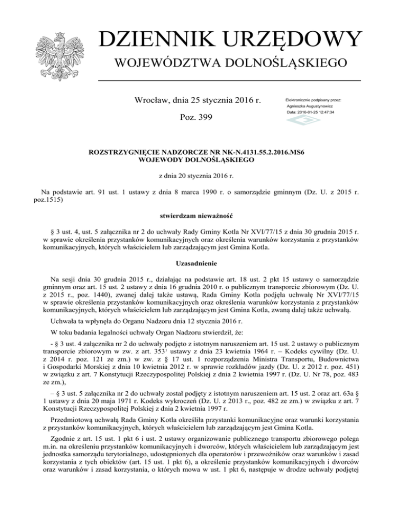 DZIENNIK URZĘDOWY WOJEWÓDZTWA DOLNOŚLĄSKIEGO Wrocław, dnia 25 stycznia 2016 r. Elektronicznie podpisany przez: Agnieszka Augustynowicz Poz. 399 Data: 2016-01-25 12:47:34 ROZSTRZYGNIĘCIE NADZORCZE NR NK-N.4131.55.2.2016.MS6 WOJEWODY DOLNOŚLĄSKIEGO z dnia 20 stycznia 2016 r. Na podstawie art. 91 ust. 1 ustawy z dnia 8 marca 1990 r. o samorządzie gminnym (Dz. U. z 2015 r. poz.1515) stwierdzam nieważność § 3 ust. 4, ust. 5 załącznika nr 2 do uchwały Rady Gminy Kotla Nr XVI/77/15 z dnia 30 grudnia 2015 r. w sprawie określenia przystanków komunikacyjnych oraz określenia warunków korzystania z przystanków komunikacyjnych, których właścicielem lub zarządzającym jest Gmina Kotla. Uzasadnienie Na sesji dnia 30 grudnia 2015 r., działając na podstawie art. 18 ust. 2 pkt 15 ustawy o samorządzie gminnym oraz art. 15 ust. 2 ustawy z dnia 16 grudnia 2010 r. o publicznym transporcie zbiorowym (Dz. U. z 2015 r., poz. 1440), zwanej dalej także ustawą, Rada Gminy Kotla podjęła uchwałę Nr XVI/77/15 w sprawie określenia przystanków komunikacyjnych oraz określenia warunków korzystania z przystanków komunikacyjnych, których właścicielem lub zarządzającym jest Gmina Kotla, zwaną dalej także uchwałą. Uchwała ta wpłynęła do Organu Nadzoru dnia 12 stycznia 2016 r. W toku badania legalności uchwały Organ Nadzoru stwierdził, że: - § 3 ust. 4 załącznika nr 2 do uchwały podjęto z istotnym naruszeniem art. 15 ust. 2 ustawy o publicznym transporcie zbiorowym w zw. z art. 353¹ ustawy z dnia 23 kwietnia 1964 r. – Kodeks cywilny (Dz. U. z 2014 r. poz. 121 ze zm.) w zw. z § 17 ust. 1 rozporządzenia Ministra Transportu, Budownictwa i Gospodarki Morskiej z dnia 10 kwietnia 2012 r. w sprawie rozkładów jazdy (Dz. U. z 2012 r. poz. 451) w związku z art. 7 Konstytucji Rzeczypospolitej Polskiej z dnia 2 kwietnia 1997 r. (Dz. U. Nr 78, poz. 483 ze zm.), – § 3 ust. 5 załącznika nr 2 do uchwały został podjęty z istotnym naruszeniem art. 15 ust. 2 oraz art. 63a § 1 ustawy z dnia 20 maja 1971 r. Kodeks wykroczeń (Dz. U. z 2013 r., poz. 482 ze zm.) w związku z art. 7 Konstytucji Rzeczypospolitej Polskiej z dnia 2 kwietnia 1997 r. Przedmiotową uchwałą Rada Gminy Kotla określiła przystanki komunikacyjne oraz warunki korzystania z przystanków komunikacyjnych, których właścicielem lub zarządzającym jest Gmina Kotla. Zgodnie z art. 15 ust. 1 pkt 6 i ust. 2 ustawy organizowanie publicznego transportu zbiorowego polega m.in. na określeniu przystanków komunikacyjnych i dworców, których właścicielem lub zarządzającym jest jednostka samorządu terytorialnego, udostępnionych dla operatorów i przewoźników oraz warunków i zasad korzystania z tych obiektów (art. 15 ust. 1 pkt 6), a określenie przystanków komunikacyjnych i dworców oraz warunków i zasad korzystania, o których mowa w ust. 1 pkt 6, następuje w drodze uchwały podjętej Dziennik Urzędowy Województwa Dolnośląskiego –2– Poz. 399 przez właściwy organ danej jednostki samorządu terytorialnego. Uchwała taka stanowi akt prawa miejscowego, gdyż zgodnie z art. 40 ust. 1 ustawy o samorządzie gminnym na podstawie upoważnień ustawowych gminie przysługuje prawo stanowienia aktów prawa miejscowego obowiązujących na terenie gminy. Jak wynika z przepisów ustawy o publicznym transporcie zbiorowym, zarówno operator, jak i przewoźnik są podmiotami uprawnionymi do świadczenia usług w zakresie przewozu osób, jeśli spełniają warunki do podejmowania i wykonywania działalności w zakresie przewozu osób określone w przepisach ustaw wymienionych w art. 6 ust. 2 ustawy. Operator wykonuje przewozy o charakterze użyteczności publicznej na podstawie umowy o świadczenie usług w zakresie publicznego transportu zbiorowego, a w przypadku samorządowego zakładu budżetowego, na podstawie aktu wewnętrznego, określającego warunki wykonywania usług przewozowych (art. 4 ust. 1 pkt 8 ustawy o publicznym transporcie zbiorowym), natomiast przewoźnik wykonuje przewozy „komercyjne” niebędące przewozami o charakterze użyteczności publicznej na podstawie potwierdzenia zgłoszenia przewozu (art. 4 ust. 1 pkt 11 ustawy o publicznym transporcie zbiorowym). Określenie warunków w tym konkretnym przypadku oznacza wskazanie czynników, od których uzależnione jest korzystanie z przystanków (np. wymóg posiadania stosownej umowy). Uregulowanie zasad oznacza natomiast określenie adresatów norm i reguł postępowania w przypadku korzystania przez nich z udostępnionych przystanków. Zarówno warunki, jak i zasady korzystania, o których mowa w normie kompetencyjnej wyznaczają pewien obszar, w ramach którego Rada może je swobodnie kształtować. Nie oznacza to jednak dowolności, albowiem Rada ma obowiązek ściśle trzymać się ram wyznaczonych zarówno przez ustawę, jak i naturę materii, którą w ramach danego upoważnienia ustawowego reguluje. W § 3 ust. 4 załącznika nr 2 do uchwały Rada Gminy Kotla postanowiła, że: „Umieszczenie tablicy z rozkładem jazdy oraz jej utrzymanie w należytym stanie technicznym należy do przedsiębiorcy (operatora, przewoźnika)”. Zdaniem Organu Nadzoru wskazanym przepisem załącznika nr 2 do uchwały Rada Gminy Kotla przesądziła faktycznie o tym, kto ponosił będzie koszty związane z zamieszczaniem informacji dotyczących rozkładów jazdy na przystankach. Niewątpliwie bowiem umieszczanie i utrzymanie w należytym stanie technicznym tablic z rozkładem jazdy będzie wiązało się z ponoszeniem odpowiednich kosztów. Kwestionowanym zapisem uchwały zdecydowano więc (w sposób dorozumiany), że stosowne koszty ponosić będzie korzystający z przystanku operator lub przewoźnik. W ocenie organu nadzoru postanowienie § 3 ust. 4 załącznika nr 2 do uchwały wykracza poza zakres upoważnienia przyznanego Radzie na podstawie art. 15 ust. 2 ustawy, co uzasadnia stwierdzenie jego nieważności. Przytoczony przepis uchwały nie