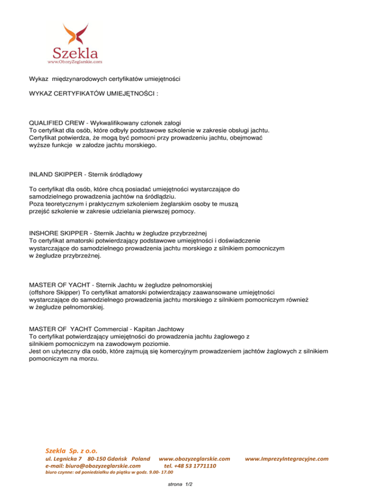 TCPDF and FPDI Wykaz międzynarodowych certyfikatów umiejętności WYKAZ CERTYFIKATÓW UMIEJĘTNOŚCI : QUALIFIED CREW - Wykwalifikowany członek załogi To certyfikat dla osób, które odbyły podstawowe szkolenie w zakresie obsługi jachtu. Certyfikat potwierdza, że mogą być pomocni przy prowadzeniu jachtu, obejmować wyższe funkcje w załodze jachtu morskiego. INLAND SKIPPER - Sternik śródlądowy To certyfikat dla osób, które chcą posiadać umiejętności wystarczające do samodzielnego prowadzenia jachtów na śródlądziu. Poza teoretycznym i praktycznym szkoleniem żeglarskim osoby te muszą przejść szkolenie w zakresie udzielania pierwszej pomocy. INSHORE SKIPPER - Sternik Jachtu w żegludze przybrzeżnej To certyfikat amatorski potwierdzający podstawowe umiejętności i doświadczenie wystarczające do samodzielnego prowadzenia jachtu morskiego z silnikiem pomocniczym w żegludze przybrzeżnej. MASTER OF YACHT - Sternik Jachtu w żegludze pełnomorskiej (offshore Skipper) To certyfikat amatorski potwierdzający zaawansowane umiejętności wystarczające do samodzielnego prowadzenia jachtu morskiego z silnikiem pomocniczym również w żegludze pełnomorskiej. MASTER OF YACHT Commercial - Kapitan Jachtowy To certyfikat potwierdzający umiejętności do prowadzenia jachtu żaglowego z silnikiem pomocniczym na zawodowym poziomie. Jest on użyteczny dla osób, które zajmują się komercyjnym prowadzeniem jachtów żaglowych z silnikiem pomocniczym na morzu. Szekla Sp. z o.o. ul. Legnicka 7 80-150 Gdańsk Poland e-mail: [email protected] www.obozyzeglarskie.com tel. +48 53 1771110 biuro czynne: od poniedziałku do piątku w godz. 9.00- 17.00 strona 1/2 www.ImprezyIntegracyjne.com TCPDF and FPDI 1. Program-szkolenia-na-Sternika-jachtowego.pdf 2. Zakres-programu-szkolenia-na-Inland-Skipper.pdf 3. Zakres-szkolenia-na-Qualified-Crew.pdf 4. zakres_szkolenia_inshore_skipper.pdf 5. zakres-szkolenia-zeglarz-jachtowy.pdf Szekla Sp. z o.o. ul. Legnicka 7 80-150 Gdańsk Poland e-mail: [email protected] www.obozyzeglarskie.com tel. +48 53 1771110 biuro czynne: od poniedziałku do piątku w godz. 9.00- 17.00 strona 2/2 Powered by TCPDF (www.tcpdf.org) www.ImprezyIntegracyjne.com