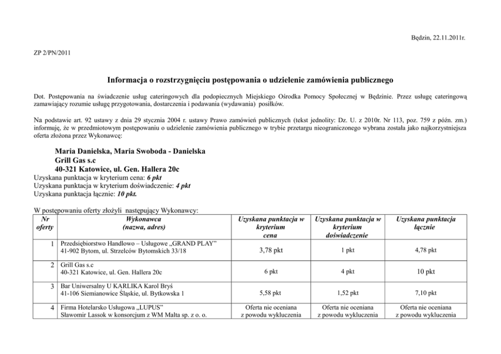 Będzin, 22.11.2011r. ZP 2/PN/2011 Informacja o rozstrzygnięciu postępowania o udzielenie zamówienia publicznego Dot. Postępowania na świadczenie usług cateringowych dla podopiecznych Miejskiego Ośrodka Pomocy Społecznej w Będzinie. Przez usługę cateringową zamawiający rozumie usługę przygotowania, dostarczenia i podawania (wydawania) posiłków. Na podstawie art. 92 ustawy z dnia 29 stycznia 2004 r. ustawy Prawo zamówień publicznych (tekst jednolity: Dz. U. z 2010r. Nr 113, poz. 759 z późn. zm.) informuję, że w przedmiotowym postępowaniu o udzielenie zamówienia publicznego w trybie przetargu nieograniczonego wybrana została jako najkorzystniejsza oferta złożona przez Wykonawcę: Maria Danielska, Maria Swoboda - Danielska Grill Gas s.c 40-321 Katowice, ul. Gen. Hallera 20c Uzyskana punktacja w kryterium cena: 6 pkt Uzyskana punktacja w kryterium doświadczenie: 4 pkt Uzyskana punktacja łącznie: 10 pkt. W postępowaniu oferty złożyli następujący Wykonawcy: Nr Wykonawca oferty (nazwa, adres) 1 Przedsiębiorstwo Handlowo – Usługowe „GRAND PLAY” 41-902 Bytom, ul. Strzelców Bytomskich 33/18 2 Grill Gas s.c 40-321 Katowice, ul. Gen. Hallera 20c 3 Bar Uniwersalny U KARLIKA Karol Bryś 41-106 Siemianowice Śląskie, ul. Bytkowska 1 4 Firma Hotelarsko Usługowa „LUPUS” Sławomir Lassok w konsorcjum z WM Malta sp. z o. o. Uzyskana punktacja w kryterium cena Uzyskana punktacja w kryterium doświadczenie Uzyskana punktacja łącznie 3,78 pkt 1 pkt 4,78 pkt 6 pkt 4 pkt 10 pkt 5,58 pkt 1,52 pkt 7,10 pkt Oferta nie oceniana z powodu wykluczenia Oferta nie oceniana z powodu wykluczenia Oferta nie oceniana z powodu wykluczenia 41-303 Dąbrowa Górnicza, ul. Kasprzaka 84 Wykonawcy z postępowania oraz odrzucenia oferty Wykonawcy z postępowania oraz odrzucenia oferty Wykonawcy z postępowania oraz odrzucenia oferty 3,90 pkt 2 pkt 5,90 pkt 4,74 pkt 2 pkt 6,74 pkt 5,04 pkt 1 pkt 6,04 pkt 8 P.P.H.U. „MIXER” S.C. Oferta nie oceniana z powodu wykluczenia Wykonawcy z postępowania oraz odrzucenia oferty Oferta nie oceniana z powodu wykluczenia Wykonawcy z postępowania oraz odrzucenia oferty Oferta nie oceniana z powodu wykluczenia Wykonawcy z postępowania oraz odrzucenia oferty 9 P. Dussmann sp. z o. o. Oferta nie oceniana z powodu odrzucenia Oferta nie oceniana z powodu odrzucenia Oferta nie oceniana z powodu odrzucenia 5 Firma Handlowo Usługowo Produkcyjna „LUNCH SERWICE” S.C. 42-600 Tarnowskie Góry, ul. Opolska 21 6 Przedsiębiorstwo Turystyczno – Usługowe „WALKER” Sp z o. o. 42-504 Będzin, ul. Pokoju 14 7 F.P.H.U. „SMAK” Bogusław Gawarecki 42-300 Myszków, ul. Hutników 4 43-600 Jaworzno, ul. Paderewskiego 8 02-733 Warszawa, ul. Kurpińskiego 55A Wykluczonych z postępowania wykonawców – 2 Oferta Nr 4 Firma Hotelarsko Usługowa „LUPUS” Sławomir Lassok w konsorcjum z WM Malta sp. z o. o. 41-303 Dąbrowa Górnicza, ul. Kasprzaka 84 Podstawa prawna – art. 24 ust 2 pkt 4 ustawy PZP Uzasadnienie formalne - Wykonawca nie wykazał spełniania warunku udziału w postępowaniu określonego w SIWZ dotyczącego doświadczenia tj. nie wykazał, że w okresie ostatnich 3 lat przed upływem terminu składania ofert, a jeśli okres prowadzenia działalności jest krótszy – w tym okresie, wykonał lub wykonuje co najmniej 1 usługę w zakresie realizacji odpowiadającym swoim rodzajem przedmiotowi zamówienia (usługi cateringu) o wartości nie mniejszej niż 260 000 zł. Oferta Nr 8 P.P.H.U. „MIXER” S.C. 43-600 Jaworzno, ul. Paderewskiego 8 Podstawa prawna – art. 24 ust. 2 pkt 4 ustawy PZP Uzasadnienie formalne - Wykonawca nie wykazał spełniania warunku udziału w postępowaniu określonego w SIWZ dotyczącego doświadczenia tj. nie wykazał, że w okresie ostatnich 3 lat przed upływem terminu składania ofert, a jeśli okres prowadzenia działalności jest krótszy – w tym okresie, wykonał lub wykonuje co najmniej 1 usługę w zakresie realizacji odpowiadającym swoim rodzajem przedmiotowi zamówienia (usługi cateringu) o wartości nie mniejszej niż 260 000 zł. Odrzuconych ofert – 3 Oferta Nr 4 Firma Hotelarsko Usługowa „LUPUS” Sławomir Lassok w konsorcjum z WM Malta sp. z o. o. 41-303 Dąbrowa Górnicza, ul. Kasprzaka 84 Podstawa prawna - art. 89 ust. 1 pkt 5 w nawiązaniu do art. 24 ust. 4 ustawy PZP Uzasadnienie formalne: Wykonawca wykluczony wcześniej nie z postępowania – nie wykazał na dzień upływu terminu składania ofert spełniania warunku udziału w postępowaniu określonego w SIWZ dotyczącego doświadczenia. Oferta Nr 8 P.P.H.U. „MIXER” S.C. 43-600 Jaworzno, ul. Paderewskiego 8 Podstawa prawna – art. 89 ust. 1 pkt 5 w nawiązaniu do art. 24 ust. 4 ustawy PZP Uzasadnienie formalne: Wykonawca wykluczony wcześniej z postępowania - nie wykazał na dzień upływu terminu składania ofert spełniania warunku udziału w postępowaniu określonego w SIWZ dotyczącego doświadczenia. Oferta Nr 9 P. Dussmann sp. z o. o. 02-733 Warszawa, ul. Kurpińskiego 55A Podstawa prawna – art. 89 ust. 1 pkt 1 oraz art. 89 ust. 1 pkt 8 ustawy PZP Uzasadnienie formalne: Na mocy art. 9 ust. 1 ustawy Prawo zamówień publicznych, ustanowiona została zasada pisemności postępowania o udzielenie zamówienia publicznego. Dotyczy ona wszystkich podmiotów uczestniczących w prowadzonym postępowaniu. Powyższy zapis pozostaje w korespondencji z art. 82 ust. 2 ww. ustawy zgodnie z którym, ofertę składa się, pod rygorem nieważności, w formie pisemnej chyba, że zamawiający wyraził zgodę na złożenie oferty w formie elektronicznej, opatrzoną bezpiecznym podpisem elektronicznym weryfikowanym przy pomocy ważnego kwalifikowanego certyfikatu. W przedmiotowym postępowaniu zamawiający nie wyraził zgody na składanie oferty w formie innej niż pisemna. Oferta została złożona w formie kserokopii w związku z powyższym nie wyczerpuje przesłanek art. 82 ust. 2 ustawy PZP – nie została zachowana forma pisemna