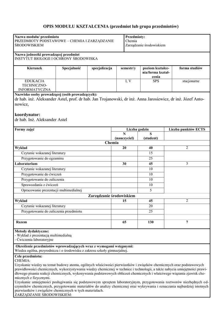 OPIS MODUŁU KSZTAŁCENIA (przedmiot lub grupa przedmiotów) Nazwa modułu/ przedmiotu PRZEDMIOTY PODSTAWOWE – CHEMIA I ZARZĄDZANIE ŚRODOWISKIEM Przedmioty: Chemia Zarządzanie środowiskiem Nazwa jednostki prowadzącej przedmiot INSTYTUT BIOLOGII I OCHRONY ŚRODOWISKA Kierunek Specjalność specjalizacja semestr/y EDUKACJA TECHNICZNOINFORMATYCZNA Nazwisko osoby prowadzącej (osób prowadzących): I, V poziom kształcenia/forma kształcenia SPS forma studiów stacjonarne dr hab. inż. Aleksander Astel, prof. dr hab. Jan Trojanowski, dr inż. Anna Jarosiewicz, dr inż. Józef Antonowicz, koordynator: dr hab. Inż. Aleksander Astel Formy zajęć Liczba godzin N S (nauczyciel) (student) Liczba punktów ECTS Chemia Wykład Czytanie wskazanej literatury Przygotowanie do egzaminu Laboratorium Czytanie wskazanej literatury Przygotowanie do ćwiczeń Przygotowanie do zaliczenia Sprawozdania z ćwiczeń Opracowanie prezentacji multimedialnej 40 15 25 45 10 10 10 10 5 2 15 45 20 25 2 65 130 7 20 30 3 Zarządzanie środowiskiem Wykład Czytanie wskazanej literatury Przygotowanie do zaliczenia przedmiotu Razem Metody dydaktyczne: - Wykład z prezentacją multimedialną - Ćwiczenia laboratoryjne Określenie przedmiotów wprowadzających wraz z wymogami wstępnymi: Wiedza ogólna, przyrodnicza i o środowisku z zakresu szkoły gimnazjalnej. Cele przedmiotu: CHEMIA: Uzyskanie wiedzy na temat budowy atomu, ogólnych właściwości pierwiastków i związków chemicznych oraz podstawowych prawidłowości chemicznych, wykorzystywania wiedzy chemicznej w technice i technologii, a także nabycia umiejętności prawidłowego pisania reakcji chemicznych, wykonywania podstawowych obliczeń chemicznych i właściwego wiązania zjawisk chemicznych z fizycznymi. Uzyskanie umiejętności posługiwania się podstawowym sprzętem laboratoryjnym, przygotowania roztworów niezbędnych odczynników chemicznych, przygotowanie materiałów do analizy chemicznej oraz wykrywania i oznaczania najbardziej istotnych pierwiastków i związków chemicznych w tych materiałach. ZARZĄDZANIE ŚRODOWISKIEM: Podniesienie świadomości oraz nabycie umiejętności uwzględniania aspektów ekologicznych oraz ochrony środowiska naturalnego przy realizacji zadań technicznych. Treści programowe: CHEMIA: Wykład: Podstawowe pojęcia i prawa chemiczne. Budowa atomu a układ okresowy. Elementy chemii kwantowej. Spektroskopia; Konfiguracja elektronowa i właściwości pierwiastków chemicznych; Wiązania chemiczne (jonowe, kowalencyjne, kowalencyjne spolaryzowane, koordynacyjne, metaliczne i wodorowe). Budowa cząsteczki; Związki nieorganiczne (wodorki, tlenki, wodorotlenki, kwasy, sole, związki kompleksowe) i ich właściwości. Zastosowanie związków nieorganicznych; Rodzaje reakcji chemicznych, stechiometria. Roztwory i ich stężenia; Dysocjacja elektrolityczna, roztwory elektrolitów, stopień dysocjacji, reakcje jonowe; Podstawy kinetyki chemicznej (równanie kinetyczne reakcji, czynniki wpływające na szybkość reakcji chemicznej); Równowaga chemiczna w roztworach elektrolitów ( stała równowagi reakcji chemicznej, stała dysocjacji, reguła przekory); Reakcje utleniania i redukcji. Elektrochemia (ogniwa, szereg elektrochemiczny metali, korozja, elektroliza, prawa Faradaya); Podstawy termodynamiki chemicznej (fazy układu, energia wewnętrzna, entalpia, entropia); Chemia węgla – węglowodory. Zjawisko izomerii. Alkany, alkeny, alkiny i areny; Alkohole, aldehydy, kwasy karboksylowe, estry i tłuszcze. Laboratorium: 1. Omówienie programu i realizacji ćwiczeń. Zapoznanie z przepisami BHP, regulaminem pracowni laboratoryjnej i instrukcją udzielania pierwszej pomocy. Zapoznanie się z aparaturą, sprzętem w tym szkłem laboratoryjnym. 2. Przygotowywanie roztworów o określonym stężeniu. 3. Reakcje charakterystyczne dla kationów K+, NH4+, 4. Reakcje charakterystyczne dla kationów Mg2+, Ca2+, Ba2+ . 5. Wykrywanie obecności w roztworze jonów K+, NH4+, Mg2+, Ca2+, Ba2+ . 6. Reakcje charakterystyczne dla anionów Cl-, J-, NO3-, SO42-, 7. Reakcje charakterystyczne dla anionów CO32-, PO43-, C2O42- . 8. Wykrywanie obecności w roztworze jonów Cl-, J-, NO3-, SO42-, CO32-, PO43- C2O42- . 9. 10. Alkacymetria: a) nastawianie miana zasady sodowej. b) oznaczanie molowości kwasu solnego. 11. 12. Redoksymetria – reakcje redoks 13.14. Argentometria: c) nastawianie miana roztworu azotanu (V) srebra, d) oznaczanie jonów chlorkowych. 15. Kolokwium sprawdzające wiadomości ZARZĄDZANIE ŚRODOWISKIEM: Wprowadzenie do problematyki ochrony środowiska oraz historia formowania się ruchu na rzecz środowiska; Koncepcja zrównoważonego rozwoju; Ochrona środowiska. Przemysł, infrastruktura a środowisko; Definicje, modele i systemy zarządzania środowiskiem i zarządzania środowiskowego; Systemy niesformalizowane i sformalizowane. Czystsza produkcja jako niesformalizowany system zarządzania środowiskowego; Czysta energia jako klucz do rozwiązania globalnych problemów ekosystemu; Systemy zarządzania środowiskowego według ISO serii 14000 i innych aktualnych krajowych i międzynarodowych norm; Ekonomiczne i prawne aspekty funkcjonowania systemów zarządzania. Najlepsze dostępne praktyki, techniki i technologie; Sektor naukowy, administracyjny i społeczny zarządzania środowiskiem. Efekty uczenia się Sposób zaliczenia oraz formy i podstawowe kryteria oceny/wymagania egzaminacyjne Wiedza: W_01 Omawia zależności pomiędzy budową atomów i mechanizmami tworzenia z nich związków chemicznych i ich cechami A. Sposób zaliczenia Zaliczenie z oceną B. Formy i kryteria zaliczenia W_02 Opisuje podstawowe typy reakcji i procesów chemicznych zachodzących w roztworach i mieszaninach substancji Zaliczenie pisemne Kolokwia pisemne i ustne Ocena pisemnej pracy kontrolnej, prezentacji W_03 multimedialnej Opisuje aspekty ekologiczne i chemiczne zagrożenia środowiska towarzyszą- Ocena sprawozdań z przeprowadzonych doce ant