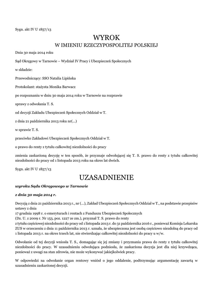 Sygn. akt IV U 1857/13 WYROK W IMIENIU RZECZYPOSPOLITEJ POLSKIEJ Dnia 30 maja 2014 roku Sąd Okręgowy w Tarnowie – Wydział IV Pracy i Ubezpieczeń Społecznych w składzie: Przewodniczący: SSO Natalia Lipińska Protokolant: stażysta Monika Barwacz po rozpoznaniu w dniu 30 maja 2014 roku w Tarnowie na rozprawie sprawy z odwołania T. S. od decyzji Zakładu Ubezpieczeń Społecznych Oddział w T. z dnia 21 października 2013 roku nr(...) w sprawie T. S. przeciwko Zakładowi Ubezpieczeń Społecznych Oddział w T. o prawo do renty z tytułu całkowitej niezdolności do pracy zmienia zaskarżoną decyzję w ten sposób, że przyznaje odwołującej się T. S. prawo do renty z tytułu całkowitej niezdolności do pracy od 1 listopada 2013 roku na okres lat dwóch. Sygn. akt IV U 1857/13 UZASADNIENIE wyroku Sądu Okręgowego w Tarnowie z dnia 30 maja 2014 r. Decyzją z dnia 21 października 2013 r., nr (...), Zakład Ubezpieczeń Społecznych Oddział w T., na podstawie przepisów ustawy z dnia 17 grudnia 1998 r. o emeryturach i rentach z Funduszu Ubezpieczeń Społecznych (Dz. U. z 2009 r. Nr 153, poz. 1227 ze zm.), przyznał T. S. prawo do renty z tytułu częściowej niezdolności do pracy od 1 listopada 2013 r. do 31 października 2016 r., ponieważ Komisja Lekarska ZUS w orzeczeniu z dnia 11 października 2013 r. uznała, że ubezpieczona jest osobą częściowo niezdolną do pracy od 1 listopada 2013 r. na okres trzech lat, nie stwierdzając całkowitej niezdolności do pracy u w/w. Odwołanie od tej decyzji wniosła T. S., domagając się jej zmiany i przyznania prawa do renty z tytułu całkowitej niezdolności do pracy. W uzasadnieniu odwołująca podniosła, że zaskarżona decyzja jest dla niej krzywdząca, ponieważ z uwagi na stan zdrowia, nie może wykonywać jakiejkolwiek pracy. W odpowiedzi na odwołanie organ rentowy wniósł o jego oddalenie, podtrzymując argumentację zawartą w uzasadnieniu zaskarżonej decyzji. Bezsporne w niniejszej sprawie było, że odwołująca T. S., urodzona (...)r., ma wykształcenie średnie techniczne w zawodzie pielęgniarka i w zawodzie tym pracowała. Od 31 lipca 1993 r. ubezpieczona pobierała rentę według II grupy inwalidów, a następnie rentę z tytułu całkowitej niezdolności do pracy, która była jej wypłacana do 31 października 2013 r. W dniu 5 września 2013 r. wystąpiła zaś do organu rentowego z wnioskiem o ponowne przyznanie jej prawa do tego świadczenia. Zaskarżoną decyzją z dnia 21 października 2013 r. ZUS Oddział w T. przyznał T. S. prawo do renty z tytułu częściowej niezdolności do pracy od 1 listopada 2013 r. do 31 października 2016 r., ponieważ Komisja Lekarska ZUS w orzeczeniu z dnia 11 października 2013 r. uznała, że ubezpieczona jest osobą częściowo niezdolną do pracy od 1 listopada 2013 r. na okres trzech lat, nie stwierdzając całkowitej niezdolności do pracy u w/w. (okoliczności bezsporne) Nadto Sąd Okręgowy ustalił następujący stan faktyczny sprawy: Lekarz Orzecznik ZUS w opinii lekarskiej z dnia 16 września 2013 r. rozpoznał u wnioskodawczyni: • astmę sterydozależną, • osteoporozę wtórną, • V Asculitis necroticans. W konsekwencji, Lekarz Orzecznik ZUS uznał, że odwołująca jest osobą częściowo niezdolną do pracy od 1 listopada 2013 r. na okres trzech lat. Na skutek sprzeciwu, sprawa skierowana została do rozpatrzenia przez Komisję Lekarską ZUS, która w opinii lekarskiej z dnia 11 października 2013 r. rozpoznała u wnioskodawczyni: • astmę sterydozależną, • osteoporozę wtórną, • nekrotyczne zapalenie naczyń, • nadciśnienie tętnicze, • stan po resekcji górnej części żołądka z powodu guza neuroendokrynnego w 2009 r., • stan po alloplastyce stawu biodrowego prawego w 2008 r., • zespół Raynauda. W konsekwencji, Komisja Lekarska ZUS uznała, że ubezpieczona jest osobą częściowo niezdolną do pracy od 1 listopada 2013 r. do 31 października 2016 r. Orzeczenie to legło u podstaw wydania zaskarżonej decyzji. dowód: • orzeczenie Lekarza Orzecznika z dnia 16.09.2013 r.- k. 60-61 akt ZUS, • orzeczenia Komisji Lekarskiej z dnia 11.10.2013 r.- k. 63-64 akt ZUS, W celu stwierdzenia, czy i w jakim stopniu odwołująca jest niezdolna do pracy, czy istniejąca poprzednio całkowita niezdolność do pracy ustała oraz czy nastąpiła poprawa jej stanu zdrowia i na czym polega, jak również kiedy powstała niezdolność do pracy, Sąd dopuścił dowód z opinii biegłych lekarzy sądowych: lek. med. E. Z. specjalisty chorób wewnętrznych i lek. med. P. M. specjalisty kardiologa. W pisemnej opinii z dnia 11 marca 2014 r. biegli specjalista chorób wewnętrznych i kardiolog zdiagnozowali u odwołującej: • przewlekłą astmę oskrzelową, • przewlekłe nekrotyczne zapalenie naczyń, • nadciśnienie tętnicze, • stan po operacji żołądka w 2009 r. z powodu guza endokrynnego, • stan po wszczepionej endoprotezie biodra prawego w 2008 r., • osteoporozę posterydową, • stan po złamaniu kompresyjnym kręgu L1, • zespół Raynauda, • stan po przebytym ostrym zapaleniu trzustki w 2008 r., • przewlekłe autoimmunologiczne zapalenie tarczycy, • stan po wycięciu jajnika prawego w 2003 r., macicy i jajnika lewego w 2009 r. W oparciu o przeprowadzone badanie oraz wyniki badań specjalistycznych uznali, że ubezpieczona jest osobą całkowicie niezdolną do pracy od 1 listopada 2013 r. na okres dwóch lat. W uzasadnieniu opinii podali, że wnioskodawczyni pozostaje w stałym leczeniu w poradni alergologicznej przy Klinice Alergii i Immunologii Szpitala Uniwersyteckiego w K. z powodu astmy oskrzelowej z nadwrażliwością na niesterydowe leki przeciwzapalne i aspirynę oraz zapalenia naczyń o typie vasculitis necroticans o podłożu immunologicznym. Ze względu na nasilone zmiany o typie vasculitis w przypadku opiniowanej niemożliwe jest odstawienie kortykosterydów. Badana ze względu na osteoporozę posterydową pr
