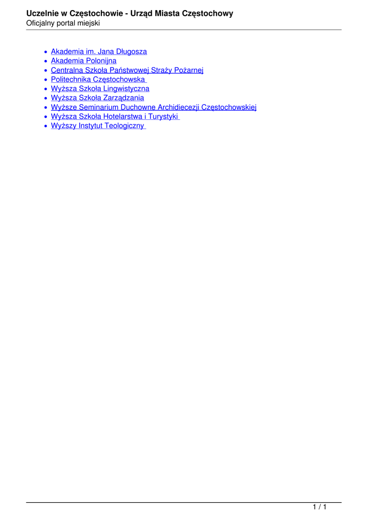 Uczelnie w Częstochowie - Urząd Miasta Częstochowy Oficjalny portal miejski Akademia im. Jana Długosza Akademia Polonijna Centralna Szkoła Państwowej Straży Pożarnej Politechnika Częstochowska Wyższa Szkoła Lingwistyczna Wyższa Szkoła Zarządzania Wyższe Seminarium Duchowne Archidiecezji Częstochowskiej Wyższa Szkoła Hotelarstwa i Turystyki Wyższy Instytut Teologiczny 1/1 Powered by TCPDF (www.tcpdf.org)