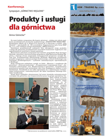 Konferencja Sympozjum „GÓRNICTWO WĘGLOWE” Produkty i usługi dla górnictwa Anna Górecka* Za nami kolejne sympozjum dla branży górniczej – siódma już edycja spotkania przedstawicieli przemysłu wydobywczego „GÓRNICTWO WĘGLOWE”. Sympozjum odbyło się w dniach 8–9 czerwca br. w Szczyrku w hotelu „Orle Gniazdo” i zgromadziło ok. 140 uczestników. Organizatorem była firma BMP Sp. z o.o. oraz redakcja nowego kwartalnika „MEGA-Industry”. Gościliśmy przedstawicieli czołowych firm oferujących swoje produkty i usługi dla górnictwa przedstawicieli wszystkich koncernów węglowych oraz najważniejszych instytucji w branży górniczej. Honorowym patronem sympozjum był minister gospodarki Piotr Grzegorz Woźniak, natomiast rolę honorowego gospodarza objął Katowicki Holding Węglowy, z którego strony sympozjum zainaugurował wiceprezes zarządu Roman Łój. Przedstawiciele Katowickiego Holdingu Węglowego przedstawili ponadto osiągnięcia z zakresu postępu technicznego, nowych technologii oraz rozwiązań proekologicznych i systemów automatycznych wprowadzonych w Holdingu. Sesje tematyczne podzielone zostały na bloki: „Maszyny i urządzenia dla górnictwa”, „Ochrona środowiska”, „Przygotowanie i wyposażenie ścian”, „Automatyka i informatyka” oraz „Bezpieczeństwo w górnictwie”. Uzupełnieniem powyższych tematów były prezentacje ofert firm działających właśnie w tych dziedzinach. Umożliwiło to nie tylko zapoznanie się z najnowszymi rozwiązaniami technicznymi i informatycznymi, ale także nawiązanie bliższego kontaktu handlowego. Drugi dzień wykładów zdominowany był przez tematykę automatycznych rozwiązań dla górnictwa oraz bezpieczeństwa pracy tej grupy zawodowej. Ciekawy referat na temat stanu bezpieczeństwa w kopalniach węgla kamiennego na tle innych zakładów wydobywczych wygłosił Jan Migda, dyrektor Departamentu Warunków Pracy WUG. Sympozjum zakończyło się ciekawą wycieczką techniczną – zjazdem do pokładu 308 KWK „Wesoła”. Dziękujemy wszystkim uczestnikom sympozjum, a zwłaszcza honorowemu gospodarzowi KHW SA, a także patronom naukowym: Głównemu Instytutowi Górniczemu i Rektorowi Akademii GórniczoHutniczej za pomoc w organizacji sympozjum. Mamy nadzieję, że formuła spotkania spełniła Państwa oczekiwania, a „GÓRNICTWO WĘGLOWE” na stałe zapisze się w kalendarzu spotkań branżowych. * Opracowano na podstawie materiałów BMP Sp. z o.o.