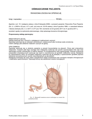 Oświadczenie opracował dr n. med. Ryszard Mądry. OŚWIADCZENIE PACJENTA ŚWIADOMA ZGODA NA OPERACJĘ Imię i nazwisko: ……………………………………............. PESEL………………………… Zgodnie z art. 15 i następne ustawy z dnia 6 listopada 2008r. o prawach pacjenta i Rzeczniku Praw Pacjenta (Dz. U. z 2009 nr 52 poz. 417 z póź. zm) oraz art. 32-35 ustawy z dnia 5 grudnia 1996 r. o zawodach lekarza i lekarza dentysty (Dz. U. Z 2011 nr 277 poz 164. brzmienie od 23 grudnia 2011 do 31 grudnia 2011 ), wyrażam zgodę na wykonanie planowanego, niżej opisanego leczenia chirurgicznego. Proponowany zabieg operacyjny: PREDYSPOZYCJE/CEL Zabieg wykonuje się u chorych z odstającymi małżowinami usznymi Operację wykonuje się ze wskazań zdrowotnych i estetycznych jako korekcja wady wrodzonej. Celem zabiegu jest zbliżenie małżowin usznych do głowy. OPIS ZABIEGU Operację wykonuje się w ułożeniu pacjenta w pozycji horyzontalnej na plecach. Chory jest znieczulony miejscowo. Czasami jeśli tego wymaga stan miejscowy wykonuje się rysunki wyznaczające linie cięć oraz stanowiące punkty orientacyjne w trakcie operacji. Po przygotowaniu pola operacyjnego, poprzez przemycie preparatem antyseptycznym wykonuje się cięcia w wyznaczonej osi grobelki małżowiny usznej. Następnie po odwarstwieniu skóry od chrząstki małżowiny wykonuje się jej plastykę z wytworzeniem grobelki poprzez założenie koncentrycznych szwów niewchłanialnych po jej bokach. Następnie kontroluje się ranę celem zaopatrzenia miejsc krwawienia oraz usunięcia narzędzi chirurgicznych i materiałów opatrunkowych. Operację kończy się założeniem szwów mocujących. Parafka podpisu lekarza i pacjenta: ………………………………. ………………………………….. 1 Oświadczenie opracował dr n. med. Ryszard Mądry. PRZYGOTOWANIE Ponieważ zabieg wykonywany jest w znieczuleniu miejscowym u pacjentów bez obciążeń w wywiadzie zwykle nie wykonuje się przed tego typu operacją badań dodatkowych. Niemniej jednak lekarz czasami może zlecić wykonanie rutynowych badań laboratoryjnymi w zależności od stanu zdrowia pacjenta, lekarz może zlecić również inne badania dodatkowe np. EKG, RTG płuc czy USG jamy brzusznej. Na skórę naniesione zostaną oznaczenia / linie, ułatwiające precyzyjne wykonanie operacji. Zrobiony zostanie również komplet zdjęć. PRZECIWWSKAZANIA Przeciwwskazaniami do zabiegu są: niestabilne nadciśnienie tętnicze, niestabilna choroba niedokrwienna serca, skazy naczyniowe i zaburzenia krzepnięcia, przyjmowanie leków wpływających na krzepliwość krwi, immunosupresyjnych i cytotoksycznych, niedokrwistość, duszności w wywiadzie, stany zapalne żył kończyn dolnych, cukrzyca niestabilna, znaczna otyłość [BMI > 35 kg/m2], nadczynność/niedoczynność tarczycy niewyrównana, infekcja ropna skóry, ciąża, zalecenia onkologa – proszę bezwzględnie poinformować lekarza jeśli pacjent stwierdzi, iż któreś z powyższych przeciwwskazań do operacji występuje u niego. W przypadku podpisania zgody przez pacjenta, przy obecności, któregoś z w/w przeciwwskazań do zbiegu przyjmuje się, chory akceptuje i bierze na siebie odpowiedzialność za zwiększone ryzyko wystąpienia niżej wymienionych powikłań. RODZAJ ZNIECZULENIA Zabieg przeprowadza się w znieczuleniu miejscowym. CZAS TRWANIA ZABIEGU Czas trwania zabiegu wynosi od kilkudziesięciu minut do 1 godziny w zależności od miejscowych warunków anatomicznych. POSTĘPOWANIE PO ZABIEGU I PRZEBIEG REKONWALESCENCJI Dolegliwości bólowe kontrolowane za pomocą środków przeciwbólowych występują bezpośrednio po zabiegu i w ciągu kilku kolejnych dni. Mogą się one nasilać w pewnym stopniu przy wzmożonej aktywności ruchowej i wymagać doustnych leków przeciwbólowych przez następne kilka tygodni. Normalnym objawem jest występowanie obrzęków, zaczerwienienia, zwiększonego ucieplenia i podbiegnięć krwawych w okolicy operowanej, które ustępują stopniowo w okresie od 2 do 3 tygodni po zabiegu. Po operacji w 1 lub 2 dniu zostanie zdjęty opatrunek. Szwy usuwane będą po około 7- 14 dniach po zabiegu. Kąpiel pod bieżącą wodą można wziąć 3 dni po ustąpieniu wydzieliny z rany . Powrót do pełnej aktywności życiowej następuje najczęściej po upływie 10-14 dni od zabiegu, a do ćwiczeń fizycznych po upływie 6-8 tygodni. Blizny po operacji mogą być opalane dopiero po upływie roku. Do czasu wygojenia rany należy dbać o jej higienę wg zaleceń podanych przez personel medyczny. Nie należy leżeć na ranie, przebywać w pozycjach powodujących ucisk rany, prowadzić samodzielnych zabiegów naruszających ciągłość naskórka pokrywającego ranę. W przypadku zamoczenia /zabrudzenia rany należy ją przemyć preparatem antyseptycznym. Po około 4 tyg od wygojenia się ran należy zacząć stosować żele lub opatrunki uciskowe a w przypadku przerastania blizn odzież uciskową. Przez okres co najmniej 14 tygodni po operacji należy nosić bandaż elastyczny w dzień i w nocy a przez kolejne dwa tylko w nocy. Efekt pierwotny operacji jest widoczny zaraz po zabiegu. Z czasem obrzęk operacyjny tkanek ustąpi, ich struktura ulegnie przebudowie, linie cięć zbledną. Efekt ostateczny zabiegu zależy od stanu ogólnego i miejscowego chorego oraz jego zaangażowanie w zalecenia co do rehabilitacji oraz opieki nad ranami oraz bliznami i jest osiągany po upływie około 6 - 18 miesięcy. MOŻLIWE POWIKŁANIA [należy uwzględnić możliwość wystąpienia każdego z niżej podanych powikłań podejmując decyzję o wyrażeniu zgody na proponowany zabieg] 1. Każdy zabieg lub operacja nie są obojętne dla organizmu człowieka i są związane z ryzykiem wystąpienia powikłań do utraty zdrowia lub życia włącznie. Każde nacięcie skóry jest zawsze związane z powstaniem blizny. 2. Możliwe powikłania miejscowe: krwawienie, powstanie krwiaka, up