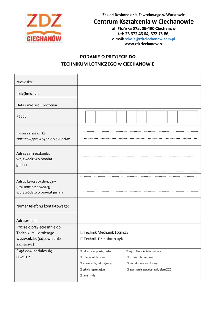 Zakład Doskonalenia Zawodowego w Warszawie Centrum Kształcenia w Ciechanowie ul. Płońska 57a, 06-400 Ciechanów tel: 23 672 46 64, 672 75 86, e-mail: [email protected] www.zdzciechanow.pl PODANIE O PRZYJECIE DO TECHNIKUM LOTNICZEGO w CIECHANOWIE Nazwisko: Imię(Imiona): Data i miejsce urodzenia: PESEL Imiona i nazwiska rodziców/prawnych opiekunów: Adres zamieszkania: województwo powiat gmina ............................................................................................................................... ……………………………………………………………………………………………………………………… ............................................................................................................................ ........................................................................................................................... ............................................................................................................................... ........................................................................................................................... Adres korespondencyjny (jeśli inny niż powyżej) województwo powiat gmina ............................................................................................................................... ............................................................................................................................... Numer telefonu kontaktowego: Adrese-mail: Proszę o przyjęcie mnie do Technikum Lotniczego w zawodzie: (odpowiednie zaznaczyć) Skąd dowiedziałeś się o szkole: Technik Mechanik Lotniczy Technik Teleinformatyk □ reklama w prasie, radiu □ ulotka reklamowa □ z polecenia, od znajomych □ szkoła - gimnazjum □ inne (jakie □ wyszukiwarka internetowa □ strona internetowa □ portal społecznościowy □ spotkanie z przedstawicielem ZDZ ……………………………………………………………………………………………………………………………..………) Zakład Doskonalenia Zawodowego w Warszawie Centrum Kształcenia w Ciechanowie ul. Płońska 57a, 06-400 Ciechanów tel: 23 672 46 64, 672 75 86, e-mail: [email protected] www.zdzciechanow.pl Oświadczenie Zgodnie z ustawą o ochronie danych osobowych z dnia 29 sierpnia 1997 roku (Dz. U. Nr 133, poz.883) wyrażam zgodę na przetwarzanie moich danych osobowych przez Technikum Lotnicze dla potrzeb rekrutacji i realizacji zajęć dydaktycznych programowych i ponadprogramowych realizowanych w szkole. Data i czytelny podpis rodzica Data i czytelny podpis ucznia Załączniki: (wnoszone w terminie zgodnie z Regulaminem Rekrutacji) 1. Oryginał świadectwa ukończenia gimnazjum. 2. Trzy fotografie podpisane na odwrocie. 3. Zaświadczenie lekarskie o braku przeciwwskazań do pracy w określonym zawodzie. Załączam orzeczenie o niepełnosprawności lub/i orzeczenie z Poradni PsychologicznoPedagogicznej. Oświadczam, że moje dziecko nie posiada wyżej wymienionych orzeczeń. Oświadczam, że na własną odpowiedzialność nie chcę ujawniać wyżej wymienionych orzeczeń. ............................................ (data i podpis rodzica/prawnego opiekuna) ZGODA NA WYKORZYSTANIE WIZERUNKU UCZNIA Oświadczam, że wyrażam/nie wyrażam zgodę/y na umieszczanie zdjęć zawierających wizerunek mojego dziecka, zarejestrowany podczas zajęć i uroczystości szkolnych zorganizowanych przez Technikum Lotnicze w Ciechanowie oraz prac wykonanych przez niego podczas uczestnictwa w zajęciach edukacyjno-wychowawczych na stronie internetowej szkoły oraz w celu informacji i promocji szkoły. *niepotrzebne skreślić Ciechanów, dnia………………………….. ............................................ (data i podpis rodzica/prawnego opiekuna)