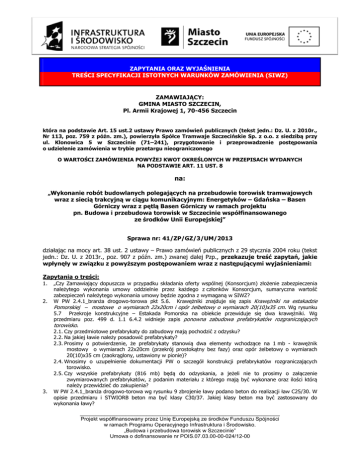 ZAPYTANIA ORAZ WYJAŚNIENIA TREŚCI SPECYFIKACJI ISTOTNYCH WARUNKÓW ZAMÓWIENIA (SIWZ) ZAMAWIAJĄCY: GMINA MIASTO SZCZECIN, Pl. Armii Krajowej 1, 70-456 Szczecin która na podstawie Art. 15 ust.2 ustawy Prawo zamówień publicznych (tekst jedn.: Dz. U. z 2010r., Nr 113, poz. 759 z późn. zm.), powierzyła Spółce Tramwaje Szczecińskie Sp. z o.o. z siedzibą przy ul. Klonowica 5 w Szczecinie (71–241), przygotowanie i przeprowadzenie postępowania o udzielenie zamówienia w trybie przetargu nieograniczonego O WARTOŚCI ZAMÓWIENIA POWYŻEJ KWOT OKREŚLONYCH W PRZEPISACH WYDANYCH NA PODSTAWIE ART. 11 UST. 8 na: „Wykonanie robót budowlanych polegających na przebudowie torowisk tramwajowych wraz z siecią trakcyjną w ciągu komunikacyjnym: Energetyków – Gdańska – Basen Górniczy wraz z pętlą Basen Górniczy w ramach projektu pn. Budowa i przebudowa torowisk w Szczecinie współfinansowanego ze środków Unii Europejskiej” Sprawa nr: 41/ZP/GZ/3/UM/2013 działając na mocy art. 38 ust. 2 ustawy – Prawo zamówień publicznych z 29 stycznia 2004 roku (tekst jedn.: Dz. U. z 2013r., poz. 907 z późn. zm.) zwanej dalej Pzp., przekazuje treść zapytań, jakie wpłynęły w związku z powyższym postępowaniem wraz z następującymi wyjaśnieniami: Zapytania o treści: 1. 2. 3. „Czy Zamawiający dopuszcza w przypadku składania oferty wspólnej (Konsorcjum) złożenie zabezpieczenia należytego wykonania umowy oddzielnie przez każdego z członków Konsorcjum, sumaryczna wartość zabezpieczeń należytego wykonania umowy będzie zgodna z wymaganą w SIWZ? W PW 2.4.1_branża drogowo-torowa pkt 5.6. Krawężniki znajduje się zapis Krawężniki na estakadzie Pomorskiej – mostowe o wymiarach 22x20cm i opór żelbetowy o wymiarach 20(10)x35 cm. Wg rysunku 5.7 Przekroje konstrukcyjne – Estakada Pomorska na obiekcie przewiduje się dwa krawężniki. Wg przedmiaru poz. 499 d. 1.1 6.4.2 widnieje zapis ponowna zabudowa prefabrykatów rozgraniczających torowisko. 2.1. Czy przedmiotowe prefabrykaty do zabudowy mają pochodzić z odzysku? 2.2. Na jakiej ławie należy posadowić prefabrykaty? 2.3. Prosimy o potwierdzenie, że prefabrykaty stanowią dwa elementy wchodzące na 1 mb - krawężnik mostowy o wymiarach 22x20cm (przekrój prostokątny bez fazy) oraz opór żelbetowy o wymiarach 20(10)x35 cm (zaokrąglony, ustawiony w pionie)? 2.4. Wnosimy o uzupełnienie dokumentacji PW o szczegół konstrukcji prefabrykatów rozgraniczających torowisko. 2.5. Czy wszyskie prefabrykaty (816 mb) będą do odzyskania, a jeżeli nie to prosimy o załączenie zwymiarowanych prefabrykatów, z podanim materiału z którego mają być wykonane oraz ilości którą należy przewidzieć do zakupienia? W PW 2.4.1_branża drogowo-torowa wg rysunku 9 zbrojenie ławy podano beton do realizacji ław C25/30. W opisie przedmiaru i STWIORB beton ma być klasy C30/37. Jakiej klasy beton ma być zastosowany do wykonania ławy? __________________________________________________________________ Projekt współfinansowany przez Unię Europejską ze środków Funduszu Spójności w ramach Programu Operacyjnego Infrastruktura i Środowisko. „Budowa i przebudowa torowisk w Szczecinie” Umowa o dofinansowanie nr POIS.07.03.00-00-024/12-00 4. W świetle udzielonej w dniu 30.01.2014 niepełnej odpowiedzi na pytanie 3, ponownie wnosimy o ustalenie zasad co do ważności dokumentów znajdujących się w dokumentacji projektowej (załącznik nr 9 do SIWZ). Proponujemy aby przyjąć zasadę, że w przypadku sprzeczności w ustaleniach między dokumentami dokumentacji projektowej obowiązuje następująca hierarchia ważności: • projekt wykonawczy opis techniczny, • projekt wykonawczy rysunki, • specyfikacja techniczna, • projekt budowlany, • przedmiar.” Wyjaśnienie zamawiającego na zapytania: Odp. na pytanie 1. Tak. Odp. na pytania 2: 2.1. Tak. Należy ponownie zabudować rozebrane na czas robót prefabrykaty. Jeżeli Wykonawca uszkodzi prefabrykaty podczas robót, musi zabudować w to miejsce prefabrykat o podobnych parametrach (wymiarach) w porozumieniu z projektantem i na własny koszt. Jeżeli wykonawca uważa, że ich demontaż pociągnie za sobą takie koszty, powinien je wliczyć w pozycjach przedmiarowych odpowiadających ponownej zabudowie prefabrykatów. Demontaż należy przeprowadzić w taki sposób, by nie uszkodzić prefabrykatów. Wykonawca powinien przewidzieć ryzyko wymiany części elementów na nowe. 2.2. Prefabrykaty należy posadowić na ławie z betonu C12/15. Prawidłowa ocena będzie możliwa dopiero po robotach demontażowych na estakadzie. Szerokość i wysokość nowej ławy jest uzależniona od szerokości prefabrykatów i wysokości górnej płyty konstrukcji estakady. Do wyceny należy przyjąć wysokość ławy równą 10 cm . 2.3. Zamawiający potwierdza. 2.4. Zamawiający uzupełnia dokumentację w tym zakresie o rysunek „prefabrykatu oporowego”, który będzie dostępny w folderze „Uzupełnienia 1” 2.5. Tak. Należy ponownie zabudować rozebrane na czas robót prefabrykaty. Jeżeli Wykonawca uszkodzi prefabrykaty podczas robót, musi zabudować w to miejsce prefabrykat o podobnych parametrach (wymiarach) w porozumieniu z projektantem i na własny koszt. Jeżeli wykonawca uważa, że ich demontaż pociągnie za sobą takie koszty, powinien je wliczyć w pozycjach przedmiarowych odpowiadających ponownej zabudowie prefabrykatów. Demontaż należy przeprowadzić w taki sposób, by nie uszkodzić prefabrykatów. Wykonawca powinien przewidzieć ryzyko wymiany części elementów na nowe. Odp. na pytanie 3. Do wykonania ławy żelbetowej 65x30 cm należy przyjąć beton klasy C30/37. Zamawiający zaznacza ponadto, że w poprzednio udzielonych odpowiedziach opisał rolę przedmiaru, m.in. wyjaśniając, że przedmiary robót należy traktować jako elementy pomocnicze dodatkowe, że mogą powstawać rozbieżności pomiędzy ilością i zakresem prac wykazanych w pr