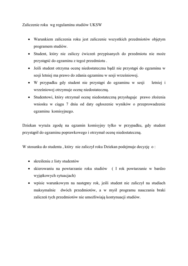Zaliczenie roku wg regulaminu studiów UKSW Warunkiem zaliczenia roku jest zaliczenie wszystkich przedmiotów objętym programem studiów. Student, który nie zaliczy ćwiczeń przypisanych do przedmiotu nie może przystąpić do egzaminu z tegoż przedmiotu . Jeśli student otrzyma ocenę niedostateczna bądź nie przystąpi do egzaminu w sesji letniej ma prawo do zdania egzaminu w sesji wrześniowej. W przypadku gdy student nie przystąpi do egzaminu w sesji letniej i wrześniowej otrzymuje ocenę niedostateczną. Studentowi, który otrzymał ocenę niedostateczną przysługuje prawo złożenia wniosku w ciągu 7 dniu od daty ogłoszenie wyników o przeprowadzenie egzaminu komisyjnego. Dziekan wyraża zgodę na egzamin komisyjny tylko w przypadku, gdy student przystąpił do egzaminu poprawkowego i otrzymał ocenę niedostateczną. W stosunku do studenta , który nie zaliczył roku Dziekan podejmuje decyzję o : skreśleniu z listy studentów skierowaniu na powtarzanie roku studiów ( I rok powtarzanie w bardzo wyjątkowych sytuacjach) wpisie warunkowym na następny rok, jeśli student nie zaliczył na studiach maksymalnie dwóch przedmiotów, a w myśl programu nauczania braki zaliczeń tych przedmiotów nie umożliwiają kontynuacji studiów.