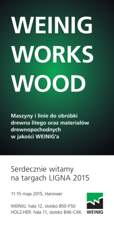 WEINIG WOOD WORKS WORK WOOD WEINIG Maszyny i linie do obróbki drewna litego oraz materiałów drewnopochodnych w jakości WEINIG‘a Serdecznie witamy na targach LIGNA 2015 11-15 maja 2015, Hanower WEINIG: hala 12, stoisko B50-F50 HOLZ-HER: hala 11, stoisko B46-C46 1 Serdecznie Witamy „WEINIG Technologiczna ofensywa“ na LIGNIE. Na ponad 3500 m2 powierzchni czeka na Was ponad 30 eksponatów gotowych do prezentacji. W hali 12 zobaczycie świat obróbki drewna litego skupiony w jednym miejscu. Zaraz obok, w hali 11 znajdziecie firmę HOLZ-HER – pełna kompetencja obróbki materiałów drewnopochodnych. WEINIG jest producentem kompleksowym i prezentuje Wam w Hanowerze ogrom nowych i przyszłościowych rozwiązań. Począwszy od rozkroju, poprzez struganie i profilowanie, produkcję okien oraz obróbkę CNC, aż po okleinowanie obrzeży znajdziecie perfekcyjne rozwiązanie dla Waszej produkcji. W centrum naszej uwagi jest uzyskanie dla Was maksymalnych korzyści. Pokażemy Wam, jak przy pomocy firmy WEINIG bezpiecznie i łatwo opanować nawet najbardziej skomplikowane procesy. Od planowania, przez realizację, aż po obszerną ofertę serwisową. WEINIG da Wam poczucie bycia w najlepszych rękach. Wasz Gregor Baumbusch Zarząd Zbyt & Marketing 2 WEINIG Technologiczna ofensywa Zainspirujemy Was nowymi koncepcjami i pomysłami, które nie tylko zrewolucjonizują Waszą produkcję ale wyraźnie polepszą Waszą pozycję rynkową. NOWOŚĆ Maszyny i linie, które ustalają nowe kryteria w wydajności i rentowności. NOWOŚĆ Inteligentne koncepcje produkcyjne, połączone w sieć, dające maksimum korzyści. NOWOŚĆ Rozwiązania na miarę – od zastosowania po usługę. Więcej informacji na www.weinig.com 3 Wydajność zasobów: Stawiając na drewno jesteście na właściwej i pewnej drodze ku przyszłości. W świecie naznaczonym przez potrzebę rosnącej efektywności wykorzystania zasobów naturalnych drewno jako surowiec odnawialny nie ma sobie równych. Wytrzymałe statycznie i o indywidualnym wyglądzie drewno lite cieszy się rosnącym uznaniem zarówno jako materiał konstrukcyjny, jak i materiał do wyposażenia wnętrz czy architektury zewnętrznej. WEINIG jako lider w 4 Drewno zwycięża technologii obróbki drewna litego jest motorem napędowym rozwoju tej właśnie branży. Maszyny i urządzenia WEINIG, zapewniając maksymalne wykorzystanie drewna przy coraz mniejszym zużyciu energii, przyczyniają się do oszczędności zasobów naturalnych i gwarantują Wam rentowną produkcję. Jednocześnie klienci profitują z synergii w grupie przedsiębiorstwa między kompetencją w drewnie litym i specjalistami od materiałów drewnopochodnych HOLZ-HER. 5 LIGNA widok ogólny WEINIG 6 HOLZ-HER 7 Stoisko WEINIG, Hala 12 2 1 3 8 7 6 5 4 8 38 39 40 37 9 10 11 19 13 12 20 18 14 21 22 17 15 16 9 30 35 36 33 34 29 32 31 28 24 26 23 27 25 10 Eksponaty 1 Informacja 21 Rondamat 960 2 Bistro 22 Rondamat 985 3 Serwis, Trening, Maszyny używane 23 HS 200 Concept, Finanse, Atomatyzacja 24 4 ProfiShape 25 Wzory elementy okien 26 UniPin 27 OptiCut S 50 Window 28 Powermat 700 Window 29 Conturex 125 Vario 5 Profile wzorcowe 6 Model Powermat 2500 SP 7 Model Obrotnica czołowa 8 Hydromat 45 9 Display Hydromat 3500 10 30 Multirex 30 31 ProfiRip 340 M 32 VarioRip 310 M Powermat 2400 XL / E1 XL 33 EScan 34 OptiCut S 90 Speed 11 Cube 35 ProfiPress L II 12 Rondamat 1000 36 OptiCut 200 Elite z 13 OptiControl Digital, Moulder Master 14 Powermat 15 Powermat 700 16 Powermat 2400 / E1 i A1 17 Unimat 222 18 Powermat 700 19 Powermat 1200 20 OptiControl LIGNA Nowości Profilowanie Rozkrój/klejenie Okna/CNC Obróbka końcówek EasyScan+ i Front End Scanner 37 OptiCut 450 FJ+ z CombiScan+ C 200 Evo 38 BK 80 39 FlexiRip 320 / FlexiCut 40 Linia rozkroju CombiScan+ R 200 i ProfiRip 450 M Speed 11 Stoisko HOLZ-HER, hala 11 LIGNA Nowości Oklejanie obrzeży Obróbka CNC 4 Rozkrój 5 1 6 3 2 12 18 7 8 11 17 14 9 13 10 15 16 1 Informacja 10 EVOLUTION 7402 2 Info Serwis 11 Stoisko software 3 Bistro 12 Cube 4 CUT 6120 13 LUMINA 1380 5 CUT 6220 14 LUMINA 1586 6 CUT 1255 15 SPRINT 1329 7 PRO-MASTER 7125 16 AURIGA 1308 XL 8 PRO-MASTER 7018 17 STREAMER 1057 9 EVOLUTION 7405 18 ACCURA 1554 12 Notatki | Terminy Codziennie od 17.00 Happy Hour w Bistro (oprócz piątku) 13 WEINIG OFERUJE WIĘCEJ ...jest obietnicą bez żadnego ale w kwestii jakości, niezawodności, wartości dodanej oraz kompetentnego doradztwa – wszystko z jednej ręki. MICHAEL WEINIG AG Weinigstraße 2/4 97941 Tauberbischofsheim Niemcy ZNAJDŹ EKSPERTA www.weinig.com 14 Telefon +49 9341 86-0 Telefax +49 9341 7080 [email protected] www.weinig.com
