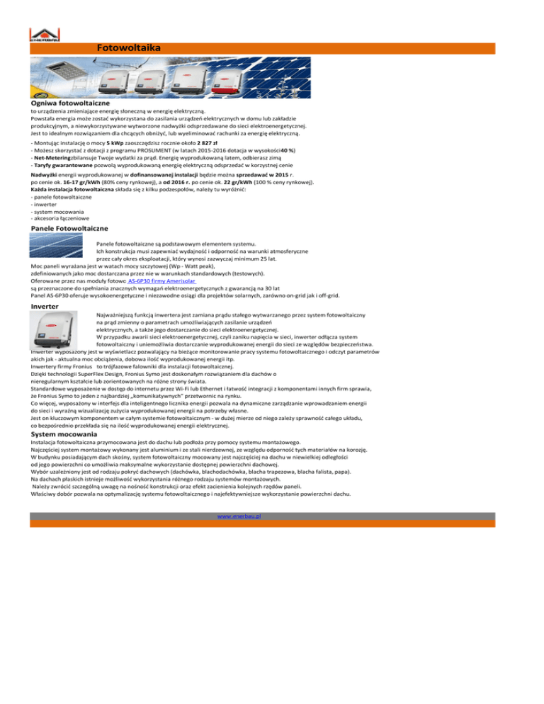 Fotowoltaika Ogniwa fotowoltaiczne to urządzenia zmieniające energię słoneczną w energię elektryczną. Powstała energia może zostać wykorzystana do zasilania urządzeń elektrycznych w domu lub zakładzie produkcyjnym, a niewykorzystywane wytworzone nadwyżki odsprzedawane do sieci elektroenergetycznej. Jest to idealnym rozwiązaniem dla chcących obniżyć, lub wyeliminować rachunki za energię elektryczną. - Montując instalację o mocy 5 kWp zaoszczędzisz rocznie około 2 827 zł - Możesz skorzystać z dotacji z programu PROSUMENT (w latach 2015-2016 dotacja w wysokości40 %) - Net-Meteringzbilansuje Twoje wydatki za prąd. Energię wyprodukowaną latem, odbierasz zimą - Taryfy gwarantowane pozwolą wyprodukowaną energię elektryczną odsprzedać w korzystnej cenie Nadwyżki energii wyprodukowanej w dofinansowanej instalacji będzie można sprzedawać w 2015 r. po cenie ok. 16-17 gr/kWh (80% ceny rynkowej), a od 2016 r. po cenie ok. 22 gr/kWh (100 % ceny rynkowej). Każda instalacja fotowoltaiczna składa się z kilku podzespołów, należy tu wyróżnić: - panele fotowoltaiczne - inwerter - system mocowania - akcesoria łączeniowe Panele Fotowoltaiczne Panele fotowoltaiczne są podstawowym elementem systemu. Ich konstrukcja musi zapewniać wydajność i odporność na warunki atmosferyczne przez cały okres eksploatacji, który wynosi zazwyczaj minimum 25 lat. Moc paneli wyrażana jest w watach mocy szczytowej (Wp - Watt peak), zdefiniowanych jako moc dostarczana przez nie w warunkach standardowych (testowych). Oferowane przez nas moduły fotowoltaiczne AS-6P30 firmy Amerisolar są przeznaczone do spełniania znacznych wymagań elektroenergetycznych z gwarancją na 30 lat Panel AS-6P30 oferuje wysokoenergetyczne i niezawodne osiągi dla projektów solarnych, zarówno on-grid jak i off-grid. Inverter Najważniejszą funkcją inwertera jest zamiana prądu stałego wytwarzanego przez system fotowoltaiczny na prąd zmienny o parametrach umożliwiających zasilanie urządzeń elektrycznych, a także jego dostarczanie do sieci elektroenergetycznej. W przypadku awarii sieci elektroenergetycznej, czyli zaniku napięcia w sieci, inwerter odłącza system fotowoltaiczny i uniemożliwia dostarczanie wyprodukowanej energii do sieci ze względów bezpieczeństwa. Inwerter wyposażony jest w wyświetlacz pozwalający na bieżące monitorowanie pracy systemu fotowoltaicznego i odczyt parametrów akich jak - aktualna moc obciążenia, dobowa ilość wyprodukowanej energii itp. Inwertery firmy Fronius to trójfazowe falowniki dla instalacji fotowoltaicznej. Dzięki technologii SuperFlex Design, Fronius Symo jest doskonałym rozwiązaniem dla dachów o nieregularnym kształcie lub zorientowanych na różne strony świata. Standardowe wyposażenie w dostęp do internetu przez Wi-Fi lub Ethernet i łatwość integracji z komponentami innych firm sprawia, że Fronius Symo to jeden z najbardziej „komunikatywnych” przetwornic na rynku. Co więcej, wyposażony w interfejs dla inteligentnego licznika energii pozwala na dynamiczne zarządzanie wprowadzaniem energii do sieci i wyraźną wizualizację zużycia wyprodukowanej energii na potrzeby własne. Jest on kluczowym komponentem w całym systemie fotowoltaicznym - w dużej mierze od niego zależy sprawność całego układu, co bezpośrednio przekłada się na ilość wyprodukowanej energii elektrycznej. System mocowania Instalacja fotowoltaiczna przymocowana jest do dachu lub podłoża przy pomocy systemu montażowego. Najczęściej system montażowy wykonany jest aluminium i ze stali nierdzewnej, ze względu odporność tych materiałów na korozję. W budynku posiadającym dach skośny, system fotowoltaiczny mocowany jest najczęściej na dachu w niewielkiej odległości od jego powierzchni co umożliwia maksymalne wykorzystanie dostępnej powierzchni dachowej. Wybór uzależniony jest od rodzaju pokryć dachowych (dachówka, blachodachówka, blacha trapezowa, blacha falista, papa). Na dachach płaskich istnieje możliwość wykorzystania różnego rodzaju systemów montażowych. Należy zwrócić szczególną uwagę na nośność konstrukcji oraz efekt zacienienia kolejnych rzędów paneli. Właściwy dobór pozwala na optymalizację systemu fotowoltaicznego i najefektywniejsze wykorzystanie powierzchni dachu. www.enerbau.pl