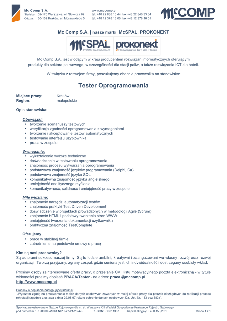 Mc Comp S.A. Siedziba: 02-170 Warszawa, ul. S!owicza 62 Oddzia!: 30-102 Kraków, ul. Morawskiego 5 www.mccomp.pl tel. +48 22 868 10 44 fax +48 22 846 33 64 tel. +48 12 378 16 00 fax +48 12 378 16 01 Mc Comp S.A. | nasze marki: McSPAL, PROKONEKT Mc Comp S.A. jest wiod"cym w kraju producentem rozwi"za# informatycznych oferuj"cym produkty dla sektora paliwowego, w szczególno$ci dla stacji paliw, a tak%e rozwi"zania ICT dla hoteli. W zwi"zku z rozwojem firmy, poszukujemy obecnie pracownika na stanowisko: Tester Oprogramowania Miejsce pracy: Region: Kraków ma!opolskie Opis stanowiska: Obowi!zki: • tworzenie scenariuszy testowych • weryfikacja zgodno$ci oprogramowania z wymaganiami • tworzenie i akceptowanie testów automatycznych • testowanie interfejsu u%ytkownika • praca w zespole Wymagania: • wykszta!cenie wy%sze techniczne • do$wiadczenie w testowaniu oprogramowania • znajomo$& procesu wytwarzania oprogramowania • podstawowa znajomo$& j'zyków programowania (Delphi, C#) • podstawowa znajomo$& j'zyka SQL • komunikatywna znajomo$& j'zyka angielskiego • umiej'tno$& analitycznego my$lenia • komunikatywno$&, solidno$& i umiej'tno$& pracy w zespole Mile widziane: • znajomo$& narz'dzi automatyzacji testów • znajomo$& praktyki Test Driven Development • do$wiadczenie w projektach prowadzonych w metodologii Agile (Scrum) • znajomo$& HTML i podstawy tworzenia stron WWW • umiej'tno$& tworzenia dokumentacji u%ytkownika • praktyczna znajomo$& TestComplete Oferujemy: • prac' w stabilnej firmie • zatrudnienie na podstawie umowy o prac' Kim s! nasi pracownicy? S" autorami sukcesu naszej firmy. S" to ludzie ambitni, kreatywni i zaanga%owani we w!asny rozwój oraz rozwój organizacji. Tworz" przyjazny, zgrany zespó!, gdzie ceniona jest ich indywidualno$& i dostrzegany osobisty wk!ad. Prosimy osoby zainteresowane ofert" pracy, o przes!anie CV i listu motywacyjnego poczt" elektroniczn" - w tytule widomo$ci prosimy dopisa& PRACA/Tester - na adres: praca @mccomp.pl http://www.mccomp.pl Prosimy o dopisanie nast'puj"cej klauzuli: „Wyra%am zgod' na przetwarzanie moich danych osobowych zawartych w mojej ofercie pracy dla potrzeb niezb'dnych do realizacji procesu rekrutacji (zgodnie z ustaw" z dnia 29.08.97 roku o ochronie danych osobowych Dz. Ust. Nr. 133 poz.883)”. Spó!kazarejestrowana w S"dzie Rejonowym dla m. st. Warszawy XIII Wydzia! Gospodarczy Krajowego Rejestru S"dowego pod numerem KRS 0000041061 NIP: 527-21-23-475 REGON: 013011367 Kapita! akcyjny: 8.400.158,25z! strona 1 z 1