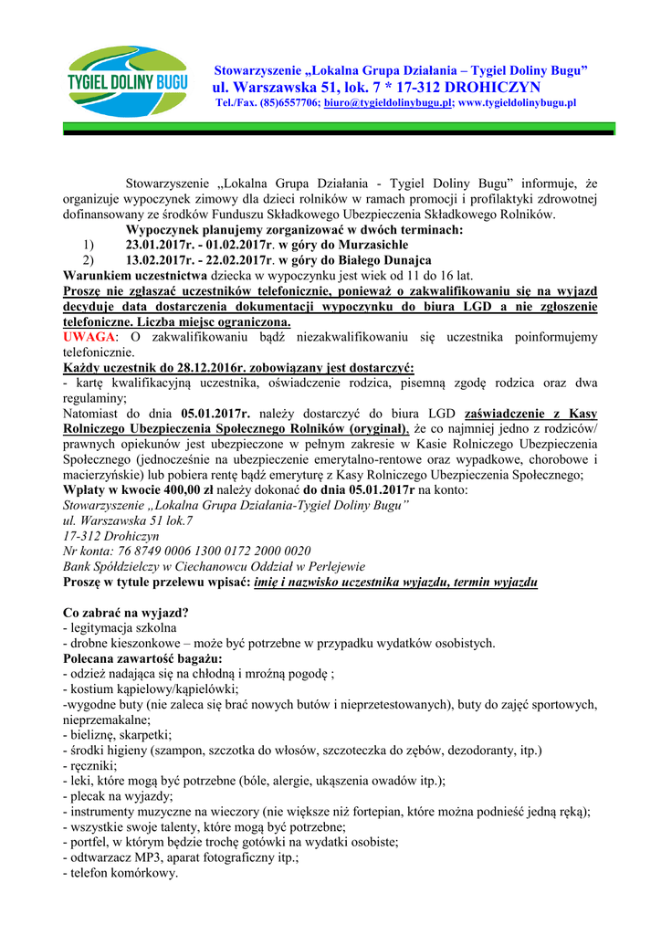Stowarzyszenie „Lokalna Grupa Działania – Tygiel Doliny Bugu” ul. Warszawska 51, lok. 7 * 17-312 DROHICZYN Tel./Fax. (85)6557706; [email protected]; www.tygieldolinybugu.pl Stowarzyszenie „Lokalna Grupa Działania - Tygiel Doliny Bugu” informuje, że organizuje wypoczynek zimowy dla dzieci rolników w ramach promocji i profilaktyki zdrowotnej dofinansowany ze środków Funduszu Składkowego Ubezpieczenia Składkowego Rolników. Wypoczynek planujemy zorganizować w dwóch terminach: 1) 23.01.2017r. - 01.02.2017r. w góry do Murzasichle 2) 13.02.2017r. - 22.02.2017r. w góry do Białego Dunajca Warunkiem uczestnictwa dziecka w wypoczynku jest wiek od 11 do 16 lat. Proszę nie zgłaszać uczestników telefonicznie, ponieważ o zakwalifikowaniu się na wyjazd decyduje data dostarczenia dokumentacji wypoczynku do biura LGD a nie zgłoszenie telefoniczne. Liczba miejsc ograniczona. UWAGA: O zakwalifikowaniu bądź niezakwalifikowaniu się uczestnika poinformujemy telefonicznie. Każdy uczestnik do 28.12.2016r. zobowiązany jest dostarczyć: - kartę kwalifikacyjną uczestnika, oświadczenie rodzica, pisemną zgodę rodzica oraz dwa regulaminy; Natomiast do dnia 05.01.2017r. należy dostarczyć do biura LGD zaświadczenie z Kasy Rolniczego Ubezpieczenia Społecznego Rolników (oryginał), że co najmniej jedno z rodziców/ prawnych opiekunów jest ubezpieczone w pełnym zakresie w Kasie Rolniczego Ubezpieczenia Społecznego (jednocześnie na ubezpieczenie emerytalno-rentowe oraz wypadkowe, chorobowe i macierzyńskie) lub pobiera rentę bądź emeryturę z Kasy Rolniczego Ubezpieczenia Społecznego; Wpłaty w kwocie 400,00 zł należy dokonać do dnia 05.01.2017r na konto: Stowarzyszenie „Lokalna Grupa Działania-Tygiel Doliny Bugu” ul. Warszawska 51 lok.7 17-312 Drohiczyn Nr konta: 76 8749 0006 1300 0172 2000 0020 Bank Spółdzielczy w Ciechanowcu Oddział w Perlejewie Proszę w tytule przelewu wpisać: imię i nazwisko uczestnika wyjazdu, termin wyjazdu Co zabrać na wyjazd? - legitymacja szkolna - drobne kieszonkowe – może być potrzebne w przypadku wydatków osobistych. Polecana zawartość bagażu: - odzież nadająca się na chłodną i mroźną pogodę ; - kostium kąpielowy/kąpielówki; -wygodne buty (nie zaleca się brać nowych butów i nieprzetestowanych), buty do zajęć sportowych, nieprzemakalne; - bieliznę, skarpetki; - środki higieny (szampon, szczotka do włosów, szczoteczka do zębów, dezodoranty, itp.) - ręczniki; - leki, które mogą być potrzebne (bóle, alergie, ukąszenia owadów itp.); - plecak na wyjazdy; - instrumenty muzyczne na wieczory (nie większe niż fortepian, które można podnieść jedną ręką); - wszystkie swoje talenty, które mogą być potrzebne; - portfel, w którym będzie trochę gotówki na wydatki osobiste; - odtwarzacz MP3, aparat fotograficzny itp.; - telefon komórkowy. Proszę poinformować nas, możliwie jak najszybciej, czy dziecko stosuje specjalistyczną dietę, czy jest na coś uczulone, czy potrzebuje specjalnych leków!!! W załączniku (e-mailem) przesyłamy kartę kwalifikacyjną uczestnika wypoczynku oraz pozostałe dokumenty. Karta kwalifikacyjna wypełniana jest przez rodziców. Prosimy o uważne wypełnianie karty kwalifikacyjnej, w przypadku braków podpisów w karcie będziemy zmuszeni wezwać Państwa do ich uzupełnienia. Kontakt, gdzie należy zgłaszać uczestników i można uzyskać informację: Stowarzyszenie „Lokalna Grupa Działania-Tygiel Doliny Bugu” ul. Warszawska 51 lok.7, 17-312 Drohiczyn Tel/fax. (85) 655 77 06 E-mail: [email protected] Cała dokumentacja dotycząca wypoczynku zimowego znajduje się do pobrania na stronie internetowej www.tygieldolinybugu.pl Z poważaniem Agnieszka Wojtkowska Prezes