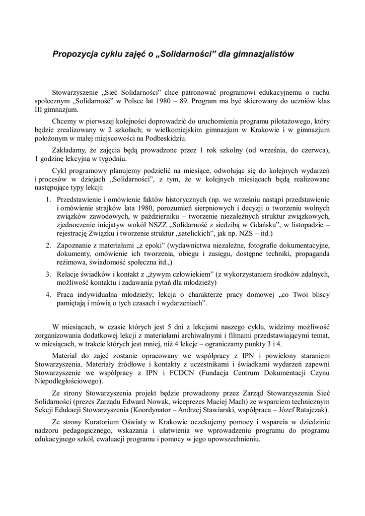Propozycja cyklu zajęć o „Solidarności” dla gimnazjalistów Stowarzyszenie „Sieć Solidarności” chce patronować programowi edukacyjnemu o ruchu społecznym „Solidarność” w Polsce lat 1980 – 89. Program ma być skierowany do uczniów klas III gimnazjum. Chcemy w pierwszej kolejności doprowadzić do uruchomienia programu pilotażowego, który będzie zrealizowany w 2 szkołach; w wielkomiejskim gimnazjum w Krakowie i w gimnazjum położonym w małej miejscowości na Podbeskidziu. Zakładamy, że zajęcia będą prowadzone przez 1 rok szkolny (od września, do czerwca), 1 godzinę lekcyjną w tygodniu. Cykl programowy planujemy podzielić na miesiące, odwołując się do kolejnych wydarzeń i procesów w dziejach „Solidarności”, z tym, że w kolejnych miesiącach będą realizowane następujące typy lekcji: 1. Przedstawienie i omówienie faktów historycznych (np. we wrześniu nastąpi przedstawienie i omówienie strajków lata 1980, porozumień sierpniowych i decyzji o tworzeniu wolnych związków zawodowych, w październiku – tworzenie niezależnych struktur związkowych, zjednoczenie inicjatyw wokół NSZZ „Solidarność z siedzibą w Gdańsku”, w listopadzie – rejestrację Związku i tworzenie struktur „satelickich”, jak np. NZS – itd.) 2. Zapoznanie z materiałami „z epoki” (wydawnictwa niezależne, fotografie dokumentacyjne, dokumenty, omówienie ich tworzenia, obiegu i zasięgu, dostępne techniki, propaganda reżimowa, świadomość społeczna itd.,) 3. Relacje świadków i kontakt z „żywym człowiekiem” (z wykorzystaniem środków zdalnych, możliwość kontaktu i zadawania pytań dla młodzieży) 4. Praca indywidualna młodzieży; lekcja o charakterze pracy domowej „co Twoi bliscy pamiętają i mówią o tych czasach i wydarzeniach”. W miesiącach, w czasie których jest 5 dni z lekcjami naszego cyklu, widzimy możliwość zorganizowania dodatkowej lekcji z materiałami archiwalnymi i filmami przedstawiającymi temat, w miesiącach, w trakcie których jest mniej, niż 4 lekcje – ograniczamy punkty 3 i 4. Materiał do zajęć zostanie opracowany we współpracy z IPN i powielony staraniem Stowarzyszenia. Materiały źródłowe i kontakty z uczestnikami i świadkami wydarzeń zapewni Stowarzyszenie we współpracy z IPN i FCDCN (Fundacja Centrum Dokumentacji Czynu Niepodległościowego). Ze strony Stowarzyszenia projekt będzie prowadzony przez Zarząd Stowarzyszenia Sieć Solidarności (prezes Zarządu Edward Nowak, wiceprezes Maciej Mach) ze wsparciem technicznym Sekcji Edukacji Stowarzyszenia (Koordynator – Andrzej Stawiarski, współpraca – Józef Ratajczak). Ze strony Kuratorium Oświaty w Krakowie oczekujemy pomocy i wsparcia w dziedzinie nadzoru pedagogicznego, wskazania i ułatwienia we wprowadzeniu programu do programu edukacyjnego szkół, ewaluacji programu i pomocy w jego upowszechnieniu.