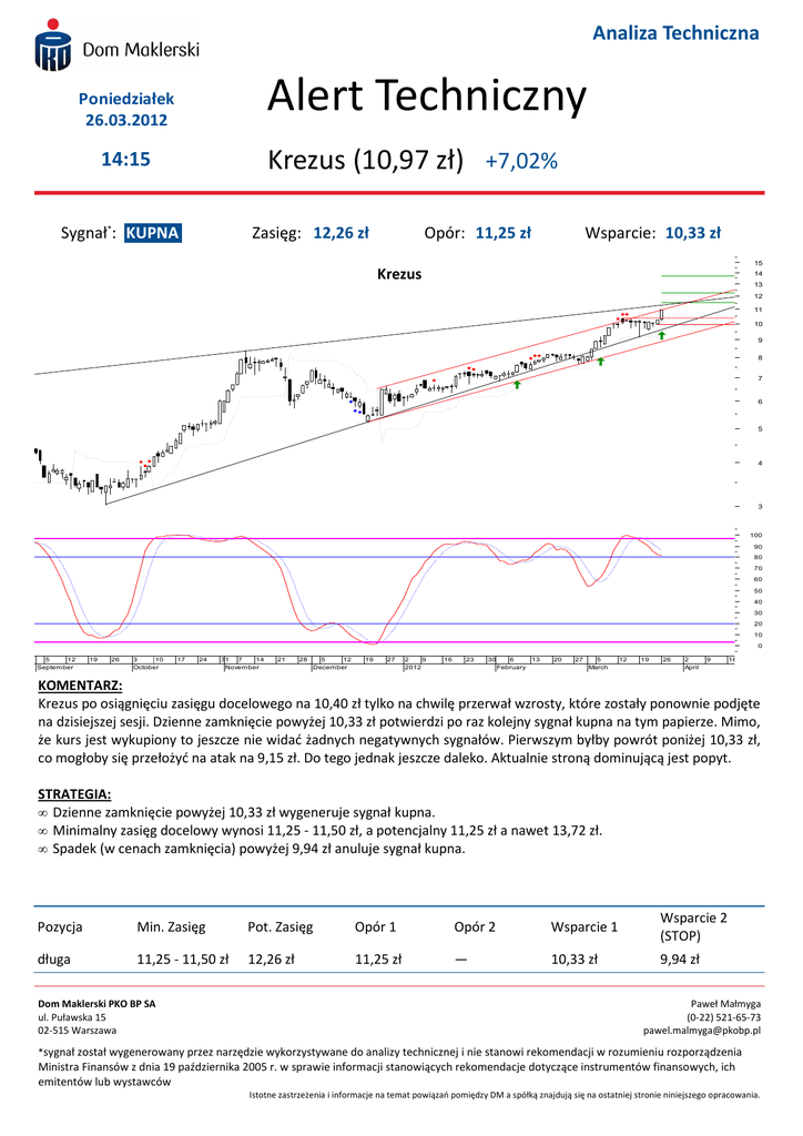 Analiza Techniczna Alert Techniczny Poniedziałek 26.03.2012 Krezus (10,97 zł) +7,02% 14:15 Sygnał*: KUPNA Zasięg: 12,26 zł Opór: 11,25 zł Wsparcie: 10,33 zł 15 Krezus 14 13 12 11 ll l 10 O lll 8 O ll l 9 7 O l ll 6 5 lll 4 3 100 90 80 70 60 50 40 30 20 10 0 5 12 September 19 26 3 10 October 17 24 31 7 14 November 21 28 5 12 December 19 27 2 9 2012 16 23 30 6 February 13 20 27 5 March 12 19 26 2 April 9 16 KOMENTARZ: Krezus po osiągnięciu zasięgu docelowego na 10,40 zł tylko na chwilę przerwał wzrosty, które zostały ponownie podjęte na dzisiejszej sesji. Dzienne zamknięcie powyżej 10,33 zł potwierdzi po raz kolejny sygnał kupna na tym papierze. Mimo, że kurs jest wykupiony to jeszcze nie widać żadnych negatywnych sygnałów. Pierwszym byłby powrót poniżej 10,33 zł, co mogłoby się przełożyć na atak na 9,15 zł. Do tego jednak jeszcze daleko. Aktualnie stroną dominującą jest popyt. STRATEGIA: • Dzienne zamknięcie powyżej 10,33 zł wygeneruje sygnał kupna. • Minimalny zasięg docelowy wynosi 11,25 - 11,50 zł, a potencjalny 11,25 zł a nawet 13,72 zł. • Spadek (w cenach zamknięcia) powyżej 9,94 zł anuluje sygnał kupna. Pozycja Min. Zasięg Pot. Zasięg Opór 1 Opór 2 Wsparcie 1 Wsparcie 2 (STOP) długa 11,25 - 11,50 zł 12,26 zł 11,25 zł — 10,33 zł 9,94 zł Dom Maklerski PKO BP SA ul. Puławska 15 02-515 Warszawa Paweł Małmyga (0-22) 521-65-73 [email protected] *sygnał został wygenerowany przez narzędzie wykorzystywane do analizy technicznej i nie stanowi rekomendacji w rozumieniu rozporządzenia Ministra Finansów z dnia 19 października 2005 r. w sprawie informacji stanowiących rekomendacje dotyczące instrumentów finansowych, ich emitentów lub wystawców Istotne zastrzeżenia i informacje na temat powiązań pomiędzy DM a spółką znajdują się na ostatniej stronie niniejszego opracowania. Analiza Techniczna Dom Maklerski PKO Bank Polski SA ul. Puławska 15, 02-515 Warszawa tel. (0-22) 521-80-00, fax (0-22) 521-79-46 e-mail: [email protected] Biuro Analiz Rynkowych Dyrektor Sektor wydobywczy, materiały budowlane Przemysł paliwowy, chemiczny, spożywczy Sektor energetyczny, deweloperski Sektor finansowy Handel, media, telekomunikacja, informatyka Analiza techniczna, e-commerce Analiza techniczna Artur Iwański (022) 521 79 31 [email protected] Monika Kalwasińska (022) 521 79 41 [email protected] Stanisław Ozga (022) 521 79 13 [email protected] Jaromir Szortyka (022) 580 39 47 [email protected] Włodzimierz Giller (022) 521 79 17 [email protected] Przemysław Smoliński (022) 521 79 10 [email protected] Paweł Małmyga (022) 521 65 73 [email protected] Biuro Klientów Instytucjonalnych Wojciech Żelechowski Dariusz Andrzejak Krzysztof Kubacki Tomasz Ilczyszyn Tomasz Zabrocki (0-22) 521 79 19 [email protected] (0-22) 521 91 39 [email protected] (0-22) 521 91 33 [email protected] (0-22) 521 82 10 [email protected] (0-22) 521 82 13 [email protected] Piotr Dedecjus Magdalena Kupiec Maciej Kałuża Igor Szczepaniec Marcin Borciuch (0-22) 521 91 40 [email protected] (0-22) 521 91 50 [email protected] (0-22) 521 91 50 [email protected] (0-22) 521 65 41 [email protected] (0-22) 521 82 12 [email protected] Biuro Strategicznych Klientów Indywidualnych Paweł Kodym Ewa Kalinowska Joanna Makowska Ewald Wyszomirski (0-22) 521 80 14 [email protected] (0-22) 521 79 88 [email protected] (0-22) 580 33 14 [email protected] (0-22) 521 78 39 [email protected] Michał Petruczeńko Grzegorz Klepacki Jacek Gaszewski (0-22) 521 79 69 [email protected] (0-22) 521 78 76 [email protected] (0-22) 521 65 62 [email protected] Informacje, komentarze i opinie zawarte w niniejszym materiale nie są rekomendacją w rozumieniu rozporządzenia Ministra Finansów z dnia 19 października 2005 r. w sprawie informacji stanowiących rekomendacje dotyczące instrumentów finansowych, ich emitentów lub wystawców i nie stanowią porady inwestycyjnej, rekomendacji lub oferty zakupu lub sprzedaży instrumentów finansowych. Informacje, komentarze i opinie zawarte w niniejszym materiale nie są również analizą inwestycyjną lub analizą finansową, których mowa w ustawie z dnia 29 lipca 2005 r. o obrocie instrumentami finansowymi. Niniejszy materiał prezentuje wyłącznie stanowisko autora, które nie musi być tożsame ze stanowiskiem Domu Maklerskiego PKO Banku Polskiego. Informacje, komentarze i opinie zawarte w niniejszym materiale odzwierciedlają wiedzę i poglądy autora i są konsekwencją subiektywnej interpretacji informacji i danych użytych do sporządzenia niniejszego materiału. Opracowanie zostało sporządzone z zachowaniem staranności i rzetelności, na podstawie informacji i źródeł uznanych przez jego autora za wiarygodne. Jednakże ani autor, ani Dom Maklerski PKO Banku Polskiego nie gwarantują ich kompletności i wiarygodności. Materiał przygotowano za pomocą programu Metastock firmy Equis. Dane do wykresów dostarcza Parkiet.com i Bloomberg. Źródłem pozostałych danych są PAP, Reuters, prasa finansowa i internetowe serwisy finansowo-ekonomiczne. Należy pamiętać, że analiza techniczna jest jedną z metod prognozowania tendencji w zmianie kursów instrumentów finansowych, jednakże nie uwzględnia wszystkich czynników i zdarzeń, które mogą mieć wpływ na ceny instrumentów finansowych. Autor niniejszego opracowania ani Dom Maklerski PKO Banku Polskiego lub jakiekolwiek osoby reprezentujące Dom Maklerski PKO Banku Polskiego nie ponoszą odpowiedzialności za decyzje inwestycyjne podjęte na podstawie informacji, komentarzy i opinii wyrażonych w niniejszym opracowaniu oraz za ich skutki. Pełną listę Punktów Obsługi Klienta można znaleźć na stronie internetowej: http://www.dm.pkobp.pl/index.php/id=placowki/