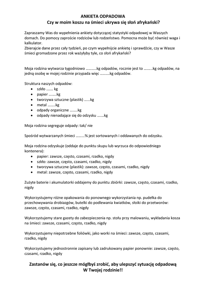 ANKIETA ODPADOWA Czy w moim koszu na śmieci ukrywa się słoo afrykaoski? Zapraszamy Was do wypełnienia ankiety dotyczącej statystyki odpadowej w Waszych domach. Do pomocy zaproście rodziców lub rodzeostwo. Pomocna może byd również waga i kalkulator. Zbierajcie dane przez cały tydzieo, po czym wypełnijcie ankietę i sprawdźcie, czy w Wasze śmieci gromadzone przez rok ważyłyby tyle, co słoo afrykaoski? Moja rodzina wytwarza tygodniowo ………..kg odpadów, rocznie jest to ….…..kg odpadów, na jedną osobę w mojej rodzinie przypada więc ……….kg odpadów. Struktura naszych odpadów: szkło .…… kg papier ….….kg tworzywa sztuczne (plastik) …...kg metal ……..kg odpady organiczne ….….kg odpady nienadające się do odzysku ….…kg Moja rodzina segreguje odpady: tak/ nie Spośród wytwarzanych śmieci ……...% jest sortowanych i oddawanych do odzysku. Moja rodzina odzyskuje (oddaje do punktu skupu lub wyrzuca do odpowiedniego kontenera): papier: zawsze, często, czasami, rzadko, nigdy szkło: zawsze, często, czasami, rzadko, nigdy tworzywa sztuczne (plastik): zawsze, często, czasami, rzadko, nigdy metal: zawsze, często, czasami, rzadko, nigdy Zużyte baterie i akumulatorki oddajemy do punktu zbiórki: zawsze, często, czasami, rzadko, nigdy Wykorzystujemy różne opakowania do ponownego wykorzystania np. pudełka do przechowywania drobiazgów, butelki do podlewania kwiatków, słoiki do przetworów: zawsze, często, czasami, rzadko, nigdy Wykorzystujemy stare gazety do zabezpieczenia np. stołu przy malowaniu, wykładania kosza na śmieci: zawsze, czasami, często, rzadko, nigdy Wykorzystujemy niepotrzebne foliówki, jako worki na śmieci: zawsze, często, czasami, rzadko, nigdy Wykorzystujemy jednostronnie zapisany lub zadrukowany papier ponownie: zawsze, często, czasami, rzadko, nigdy Zastanów się, co jeszcze mógłbyś zrobid, aby ulepszyd sytuację odpadową W Twojej rodzinie!!