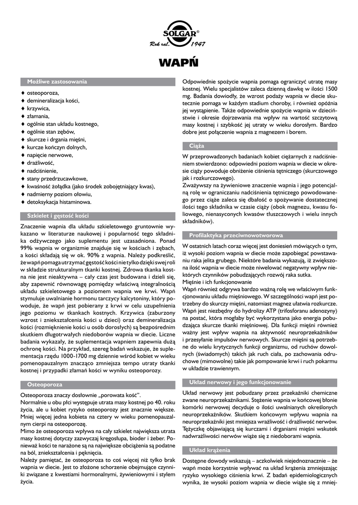 WAPŃ Możliwe zastosowania ♦ osteoporoza, ♦ demineralizacja kości, ♦ krzywica, ♦ złamania, ♦ ogólnie stan układu kostnego, ♦ ogólnie stan zębów, ♦ skurcze i drgania mięśni, ♦ kurcze kończyn dolnych, ♦ napięcie nerwowe, ♦ drażliwość, ♦ nadciśnienie, ♦ stany przedrzucawkowe, ♦ kwaśność żołądka (jako środek zobojętniający kwas), ♦ nadmierny poziom ołowiu, ♦ detoksykacja histaminowa. Szkielet i gęstość kości Znaczenie wapnia dla układu szkieletowego gruntownie wykazano w literaturze naukowej i popularność tego składnika odżywczego jako suplementu jest uzasadniona. Ponad 99% wapnia w organizmie znajduje się w kościach i zębach, a kości składają się w ok. 90% z wapnia. Należy podkreślić, że wapń pomaga utrzymać gęstość kości nie tylko dzięki swej roli w składzie strukturalnym tkanki kostnej. Zdrowa tkanka kostna nie jest nieaktywna – cały czas jest budowana i dzieli się, aby zapewnić równowagę pomiędzy właściwą integralnością układu szkieletowego a poziomem wapnia we krwi. Wapń stymuluje uwalnianie hormonu tarczycy kalcytoniny, który powoduje, że wapń jest pobierany z krwi w celu uzupełnienia jego poziomu w tkankach kostnych. Krzywica (zaburzony wzrost i zniekształcenia kości u dzieci) oraz demineralizacja kości (rozmięknienie kości u osób dorosłych) są bezpośrednim skutkiem długotrwałych niedoborów wapnia w diecie. Liczne badania wykazały, że suplementacja wapniem zapewnia dużą ochronę kości. Na przykład, szereg badań wskazuje, że suplementacja rzędu 1000-1700 mg dziennie wśród kobiet w wieku pomenopauzalnym znacząco zmniejsza tempo utraty tkanki kostnej i przypadki złamań kości w wyniku osteoporozy. Osteoporoza Osteoporoza znaczy dosłownie „porowata kość”. Normalnie u obu płci występuje utrata masy kostnej po 40. roku życia, ale u kobiet ryzyko osteoporozy jest znacznie większe. Mniej więcej jedna kobieta na cztery w wieku pomenopauzalnym cierpi na osteoporozę. Mimo że osteoporoza wpływa na cały szkielet największa utrata masy kostnej dotyczy zazwyczaj kręgosłupa, bioder i żeber. Ponieważ kości te narażone są na największe obciążenia są podatne na ból, zniekształcenia i pęknięcia. Należy pamiętać, że osteoporoza to coś więcej niż tylko brak wapnia w diecie. Jest to złożone schorzenie obejmujące czynniki związane z kwestiami hormonalnymi, żywieniowymi i stylem życia. Odpowiednie spożycie wapnia pomaga ograniczyć utratę masy kostnej. Wielu specjalistów zaleca dzienną dawkę w ilości 1500 mg. Badania dowiodły, że wzrost podaży wapnia w diecie skutecznie pomaga w każdym stadium choroby, i również opóźnia jej wystąpienie. Także odpowiednie spożycie wapnia w dzieciństwie i okresie dojrzewania ma wpływ na wartość szczytową masy kostnej i szybkość jej utraty w wieku dorosłym. Bardzo dobre jest połączenie wapnia z magnezem i borem. Ciąża W przeprowadzonych badaniach kobiet ciężarnych z nadciśnieniem stwierdzono: odpowiedni poziom wapnia w diecie w okresie ciąży powoduje obniżenie ciśnienia tętniczego (skurczowego jak i rozkurczowego). Zważywszy na żywieniowe znaczenie wapnia i jego potencjalną rolę w ograniczaniu nadciśnienia tętniczego powodowanego przez ciąże zaleca się dbałość o spożywanie dostatecznej ilości tego składnika w czasie ciąży (obok magnezu, kwasu foliowego, nienasyconych kwasów tłuszczowych i wielu innych składników). Profilaktyka przeciwnowotworowa W ostatnich latach coraz więcej jest doniesień mówiących o tym, iż wysoki poziom wapnia w diecie może zapobiegać powstawaniu raka jelita grubego. Niektóre badania wykazują, iż zwiększona ilość wapnia w diecie może niwelować negatywny wpływ niektórych czynników pobudzających rozwój raka sutka. Mięśnie i ich funkcjonowanie Wapń również odgrywa bardzo ważną rolę we właściwym funkcjonowaniu układu mięśniowego. W szczególności wapń jest potrzebny do skurczy mięśni, natomiast magnez ułatwia rozkurcze. Wapń jest niezbędny do hydrolizy ATP (trifosforanu adenozyny) na postać, która mogłaby być wykorzystana jako energia pobudzająca skurcze tkanki mięśniowej. Dla funkcji mięśni również ważny jest wpływ wapnia na aktywność neuroprzekaźników i przesyłanie impulsów nerwowych. Skurcze mięśni są potrzebne do wielu krytycznych funkcji organizmu, od ruchów dowolnych (świadomych) takich jak ruch ciała, po zachowania odruchowe (mimowolne) takie jak pompowanie krwi i ruch pokarmu w układzie trawiennym. Układ nerwowy i jego funkcjonowanie Układ nerwowy jest pobudzany przez przekaźniki chemiczne zwane neuroprzekaźnikami. Stężenie wapnia w końcowej błonie komórki nerwowej decyduje o ilości uwalnianych określonych neuroprzekaźników. Skutkiem końcowym wpływu wapnia na neuroprzekaźniki jest mniejsza wrażliwość i drażliwość nerwów. Tężyczkę objawiającą się kurczami i drganiami mięśni wskutek nadwrażliwości nerwów wiąże się z niedoborami wapnia. Układ krążenia Dostępne dowody wskazują – aczkolwiek niejednoznacznie – że wapń może korzystnie wpływać na układ krążenia zmniejszając ryzyko wysokiego ciśnienia krwi. Z badań epidemiologicznych wynika, że wysoki poziom wapnia w diecie wiąże się z mniej- szym ryzykiem nadciśnienia. Niemniej jednak badania sugerują, że suplementacja wapniem obniża ciśnienie krwi przede wszystkim u osób, których wysokie ciśnienie krwi jest spowodowane podwyższonym spożyciem soli. Nadmierny poziom sodu w komórkach może prowadzić do podwyższonego ciśnienia krwi. Krzepnięcie krwi Właściwe krzepnięcie krwi również jest uzależnione od wystarczającego poziomu wapnia we krwi. Na przykład, wapń jest niezbędny do tworzenia płytek krwi, które decydują o „lepkości” lub agregacji w procesie krzepnięcia. Wapń ułatwia również produkcję fibryny – nierozpuszczalneg