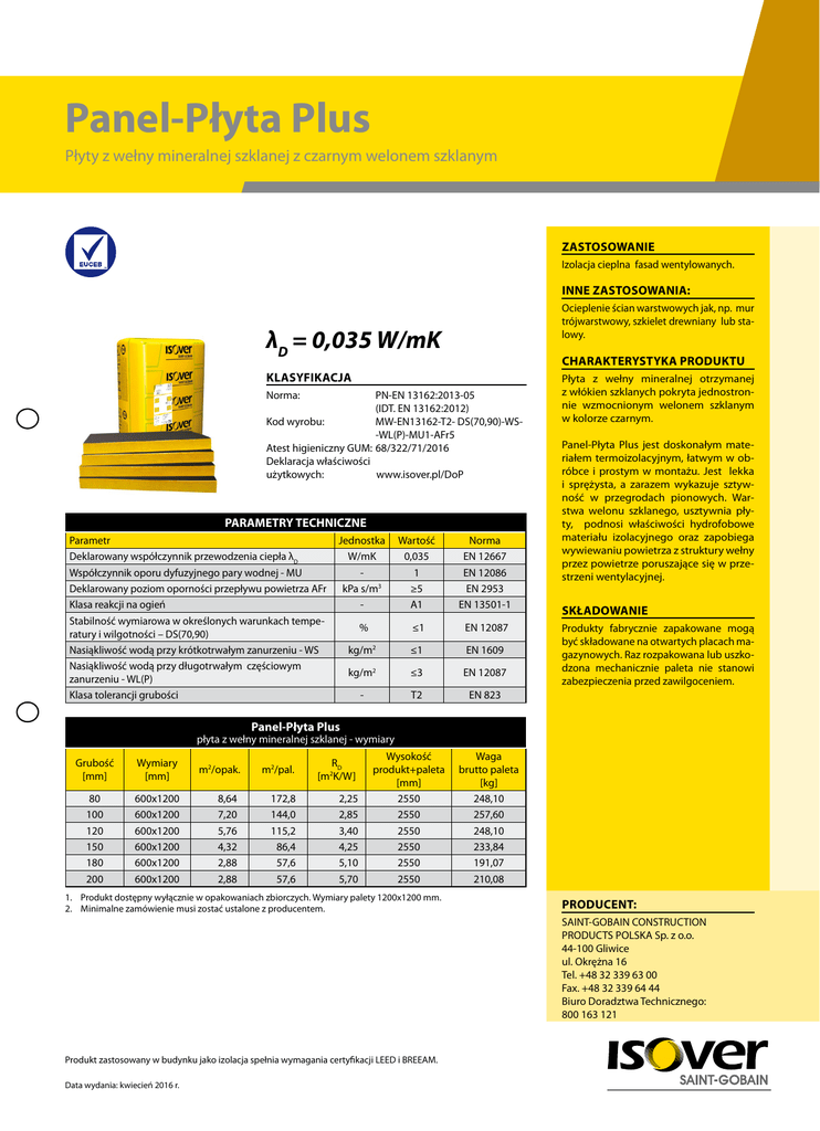 Panel-Płyta Plus Płyty z wełny mineralnej szklanej z czarnym welonem szklanym ZASTOSOWANIE Izolacja cieplna fasad wentylowanych. INNE ZASTOSOWANIA: Ocieplenie ścian warstwowych jak, np. mur trójwarstwowy, szkielet drewniany lub stalowy. λD = 0,035 W/mK CHARAKTERYSTYKA PRODUKTU KLASYFIKACJA Norma: PN-EN 13162:2013-05 (IDT. EN 13162:2012) Kod wyrobu: MW-EN13162-T2- DS(70,90)-WS-WL(P)-MU1-AFr5 Atest higieniczny GUM:68/322/71/2016 Deklaracja właściwości użytkowych: www.isover.pl/DoP PARAMETRY TECHNICZNE Parametr Deklarowany współczynnik przewodzenia ciepła λD Współczynnik oporu dyfuzyjnego pary wodnej - MU Deklarowany poziom oporności przepływu powietrza AFr Klasa reakcji na ogień Stabilność wymiarowa w określonych warunkach temperatury i wilgotności – DS(70,90) Nasiąkliwość wodą przy krótkotrwałym zanurzeniu - WS Nasiąkliwość wodą przy długotrwałym częściowym zanurzeniu - WL(P) Klasa tolerancji grubości Jednostka W/mK kPa s/m3 - Wartość 0,035 1 ≥5 A1 Norma EN 12667 EN 12086 EN 2953 EN 13501-1 % ≤1 EN 12087 kg/m2 ≤1 EN 1609 kg/m2 ≤3 EN 12087 - T2 EN 823 Płyta z wełny mineralnej otrzymanej z włókien szklanych pokryta jednostronnie wzmocnionym welonem szklanym w kolorze czarnym. Panel-Płyta Plus jest doskonałym materiałem termoizolacyjnym, łatwym w obróbce i prostym w montażu. Jest lekka i sprężysta, a zarazem wykazuje sztywność w przegrodach pionowych. Warstwa welonu szklanego, usztywnia płyty, podnosi właściwości hydrofobowe materiału izolacyjnego oraz zapobiega wywiewaniu powietrza z struktury wełny przez powietrze poruszające się w przestrzeni wentylacyjnej. SKŁADOWANIE Produkty fabrycznie zapakowane mogą być składowane na otwartych placach magazynowych. Raz rozpakowana lub uszkodzona mechanicznie paleta nie stanowi zabezpieczenia przed zawilgoceniem. Panel-Płyta Plus płyta z wełny mineralnej szklanej - wymiary Grubość [mm] Wymiary [mm] m2/opak. m2/pal. RD [m2K/W] 80 100 120 150 180 200 600x1200 600x1200 600x1200 600x1200 600x1200 600x1200 8,64 7,20 5,76 4,32 2,88 2,88 172,8 144,0 115,2 86,4 57,6 57,6 2,25 2,85 3,40 4,25 5,10 5,70 Wysokość produkt+paleta [mm] 2550 2550 2550 2550 2550 2550 1. Produkt dostępny wyłącznie w opakowaniach zbiorczych. Wymiary palety 1200x1200 mm. 2. Minimalne zamówienie musi zostać ustalone z producentem. Waga brutto paleta [kg] 248,10 257,60 248,10 233,84 191,07 210,08 PRODUCENT: SAINT-GOBAIN CONSTRUCTION PRODUCTS POLSKA Sp. z o.o. 44-100 Gliwice ul. Okrężna 16 Tel. +48 32 339 63 00 Fax. +48 32 339 64 44 Biuro Doradztwa Technicznego: 800 163 121 Produkt zastosowany w budynku jako izolacja spełnia wymagania certyfikacji LEED i BREEAM. Data wydania: kwiecień 2016 r.
