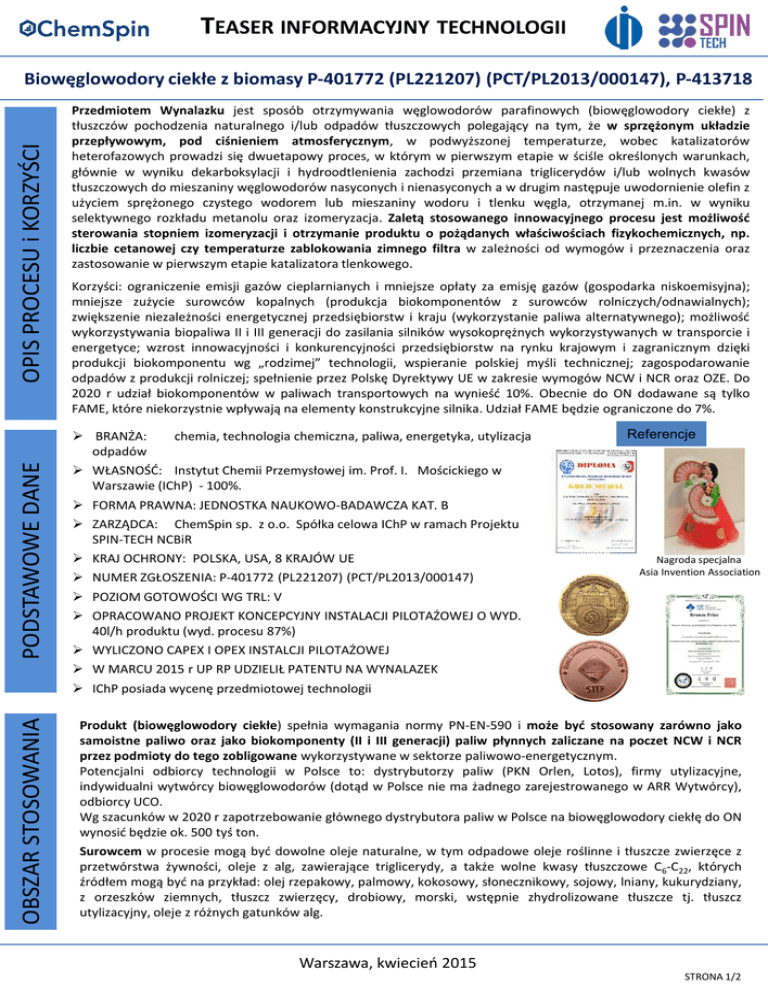 TEASER INFORMACYJNY TECHNOLOGII OPIS PROCESU i KORZYŚCI Biowęglowodory ciekłe z biomasy P-401772 (PL221207) (PCT/PL2013/000147), P-413718 Przedmiotem Wynalazku jest sposób otrzymywania węglowodorów parafinowych (biowęglowodory ciekłe) z tłuszczów pochodzenia naturalnego i/lub odpadów tłuszczowych polegający na tym, że w sprzężonym układzie przepływowym, pod ciśnieniem atmosferycznym, w podwyższonej temperaturze, wobec katalizatorów heterofazowych prowadzi się dwuetapowy proces, w którym w pierwszym etapie w ściśle określonych warunkach, głównie w wyniku dekarboksylacji i hydroodtlenienia zachodzi przemiana triglicerydów i/lub wolnych kwasów tłuszczowych do mieszaniny węglowodorów nasyconych i nienasyconych a w drugim następuje uwodornienie olefin z użyciem sprężonego czystego wodorem lub mieszaniny wodoru i tlenku węgla, otrzymanej m.in. w wyniku selektywnego rozkładu metanolu oraz izomeryzacja. Zaletą stosowanego innowacyjnego procesu jest możliwość sterowania stopniem izomeryzacji i otrzymanie produktu o pożądanych właściwościach fizykochemicznych, np. liczbie cetanowej czy temperaturze zablokowania zimnego filtra w zależności od wymogów i przeznaczenia oraz zastosowanie w pierwszym etapie katalizatora tlenkowego. Korzyści: ograniczenie emisji gazów cieplarnianych i mniejsze opłaty za emisję gazów (gospodarka niskoemisyjna); mniejsze zużycie surowców kopalnych (produkcja biokomponentów z surowców rolniczych/odnawialnych); zwiększenie niezależności energetycznej przedsiębiorstw i kraju (wykorzystanie paliwa alternatywnego); możliwość wykorzystywania biopaliwa II i III generacji do zasilania silników wysokoprężnych wykorzystywanych w transporcie i energetyce; wzrost innowacyjności i konkurencyjności przedsiębiorstw na rynku krajowym i zagranicznym dzięki produkcji biokomponentu wg „rodzimej” technologii, wspieranie polskiej myśli technicznej; zagospodarowanie odpadów z produkcji rolniczej; spełnienie przez Polskę Dyrektywy UE w zakresie wymogów NCW i NCR oraz OZE. Do 2020 r udział biokomponentów w paliwach transportowych na wynieść 10%. Obecnie do ON dodawane są tylko FAME, które niekorzystnie wpływają na elementy konstrukcyjne silnika. Udział FAME będzie ograniczone do 7%. PODSTAWOWE DANE BRANŻA: odpadów chemia, technologia chemiczna, paliwa, energetyka, utylizacja Referencje WŁASNOŚĆ: Instytut Chemii Przemysłowej im. Prof. I. Mościckiego w Warszawie (IChP) - 100%. FORMA PRAWNA: JEDNOSTKA NAUKOWO-BADAWCZA KAT. B ZARZĄDCA: ChemSpin sp. z o.o. Spółka celowa IChP w ramach Projektu SPIN-TECH NCBiR KRAJ OCHRONY: POLSKA, USA, 8 KRAJÓW UE NUMER ZGŁOSZENIA: P-401772 (PL221207) (PCT/PL2013/000147) Nagroda specjalna Asia Invention Association POZIOM GOTOWOŚCI WG TRL: V OPRACOWANO PROJEKT KONCEPCYJNY INSTALACJI PILOTAŻOWEJ O WYD. 40l/h produktu (wyd. procesu 87%) WYLICZONO CAPEX I OPEX INSTALCJI PILOTAŻOWEJ W MARCU 2015 r UP RP UDZIELIŁ PATENTU NA WYNALAZEK OBSZAR STOSOWANIA IChP posiada wycenę przedmiotowej technologii Produkt (biowęglowodory ciekłe) spełnia wymagania normy PN-EN-590 i może być stosowany zarówno jako samoistne paliwo oraz jako biokomponenty (II i III generacji) paliw płynnych zaliczane na poczet NCW i NCR przez podmioty do tego zobligowane wykorzystywane w sektorze paliwowo-energetycznym. Potencjalni odbiorcy technologii w Polsce to: dystrybutorzy paliw (PKN Orlen, Lotos), firmy utylizacyjne, indywidualni wytwórcy biowęglowodorów (dotąd w Polsce nie ma żadnego zarejestrowanego w ARR Wytwórcy), odbiorcy UCO. Wg szacunków w 2020 r zapotrzebowanie głównego dystrybutora paliw w Polsce na biowęglowodory ciekłę do ON wynosić będzie ok. 500 tyś ton. Surowcem w procesie mogą być dowolne oleje naturalne, w tym odpadowe oleje roślinne i tłuszcze zwierzęce z przetwórstwa żywności, oleje z alg, zawierające triglicerydy, a także wolne kwasy tłuszczowe C6-C22, których źródłem mogą być na przykład: olej rzepakowy, palmowy, kokosowy, słonecznikowy, sojowy, lniany, kukurydziany, z orzeszków ziemnych, tłuszcz zwierzęcy, drobiowy, morski, wstępnie zhydrolizowane tłuszcze tj. tłuszcz utylizacyjny, oleje z różnych gatunków alg. Warszawa, kwiecień 2015 STRONA 1/2 TEASER INFORMACYJNY TECHNOLOGII SCHEMAT PROCESU Biowęglowodory ciekłe z biomasy P-401772 (PL221207) (PCT/PL2013/000147), P-413718 Produktowa struktura produkcji paliw ciekłych w Polsce w roku 2013 Prognoza zużycia paliw ciekłych w Polsce w latach 2014-2020 [mln m3] PRZEWAGA KONK. RYNEK PALIW 4% 3% 4% 13% 22% Benzyny silnikowe Olej napędowy Paliwo JET 54% LPG Lekki olej napędowy Ciężki olej napędowy Otrzymane w IChP biowęglowodory ciekłe posiadają doskonałe właściwości fizykochemiczne, potwierdzone przez akredytowane OrlenLaboratorium w ramach projektu Patent Plus, zgodne z normą EN-PN-590 i rozporządzeniami M.G w sprawie wymagań jakościowych dla paliw ciekłych (oleju napędowego). Przykładowo produkt posiada niską zawartość siarki, tj. 3,1 mg/kg – 70% mniej niż przewiduje obowiązująca norma dla paliwa dieslowskiego, niską temperaturę zablokowania filtra, tj. -20 C oraz niską zawartość wielkopierścieniowych węglowodorów aromatycznych WWA, tj. 0,9% – 90% mniej niż przewiduje obowiązująca norma dla oleju napędowego. Otrzymany produkt charakteryzuje się mniejszą zawartość wody (33 mg/kg), mniejszą zawartość zanieczyszczeń (poniżej 6,0 mg/kg) oraz wyższą stabilnością oksydacyjną (30,5 h). Ponadto pozostałość po koksowaniu wynosi 0,02%, pozostałość po spopieleniu – poniżej 0,001%, badanie działania korodującego na miedź – klasa 1, smarność 398 μm. Uzyskane wyniki potwierdzają wysoką jakość otrzymanego paliwa (drop-in-fuel). Obecnie w Europie i na świecie nie ma przemysłowej technologii produkcji biowęglowodorów ciekłych z odpadowych olejów (roślinnych i zwierzęcych) oraz olejów z alg. Istniejące rafine