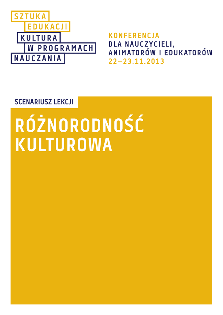 SCENARIUSZ LEKCJI RÓŻNORODNOŚĆ KULTUROWA SCENARIUSZ LEKCJI: Różnorodność kulturowa PRZEDMIOT: Wiedza o społeczeństwie, historia i społeczeństwo, wiedza o kulturze, etyka, język polski ETAP EDUKACYJNY: Szkoła ponadgimnazjalna, IV etap edukacyjny PODSTAWA PROGRAMOWA PRZEDMIOTU HISTORIA I SPOŁECZEŃSTWO: IV ETAP EDUKACYJNY – PRZEDMIOT UZUPEŁNIAJĄCY 5. SWOJSKOŚĆ I OBCOŚĆ. Uczeń: C.5.2. wyjaśnia różnice między oświeceniową koncepcją tolerancji a współczesnym rozumieniem tego pojęcia; D.5.1. charakteryzuje i ocenia idee nacjonalizmu i rasizmu w XIX w.; E.5.1. analizuje wielokulturowość społeczeństwa II Rzeczpospolitej; E.5.2. /? PODSTAWA PROGRAMOWA PRZEDMIOTU WIEDZA O SPOŁECZEŃSTWIE IV ETAP EDUKACYJNY – ZAKRES PODSTAWOWY CELE KSZTAŁCENIA – WYMAGANIA OGÓLNE Uczeń: I. Wykorzystanie i tworzenie informacji: Uczeń jest otwarty na odmienne poglądy. II. Rozpoznanie i rozwiązywanie problemów. Uczeń rozpoznaje prawne aspekty codziennych problemów życiowych i szuka ich rozwiązania. III. Współdziałanie w sprawach publicznych. Uczeń zna i stosuje zasady samoorganizacji i samopomocy. IV. Znajomość zasad i procedur demokracji. Uczeń wyjaśnia znaczenie prawa dla funkcjonowania demokratycznego państwa i rozpoznaje przypadki jego łamania. V. Znajomość praw człowieka i sposobów ich ochrony. Uczeń wyjaśnia podstawowe prawa człowieka, rozpoznaje przypadki ich naruszania i wie, jak można je chronić. TREŚCI NAUCZANIA: 1. Młody obywatel w urzędzie. Uczeń: 1) wyjaśnia, jak nabywa się obywatelstwo polskie i unijne. 2. Prawo i sądy. Uczeń: 2) wyjaśnia, co to jest prawo i czym różnią się normy prawne od norm religijnych, moralnych i obyczajowych. 5. Prawa człowieka. Uczeń: 1) przedstawia krótką historię praw człowieka i ich generację; wymienia najważniejsze dokumenty z tym związane; 2) wymienia podstawowe prawa i wolności człowieka; wyjaśnia, co oznacza, że są one powszechne, przyrodzone i niezbywalne; 3) podaje najważniejsze postanowienia Powszechnej Deklaracji Praw Człowieka, Europejskiej Konwencji Praw Człowieka i Konwencji o Prawach Dziecka; 4) znajduje w środkach masowego przekazu (w tym w Internecie) informację o przypadkach łamania praw człowieka na świecie; 5) bierze udział w debacie klasowej, szkolnej lub internetowej na temat wolności słowa lub innych praw i wolności. 2 6. Ochrona praw i wolności. Uczeń: 1) przedstawia główne środki ochrony praw i wolności w Polsce; 4) przedstawia na przykładach działania podejmowane przez ludzi i organizacje pozarządowe broniące praw człowieka; 5) rozpoznaje przejawy rasizmu, szowinizmu, antysemityzmu i ksenofobii; uzasadnia potrzebę przeciwstawiania się im oraz przedstawia możliwości zaangażowania się w wybrane działania na rzecz równości i tolerancji; 6) znajduje informacje o naruszeniu praw człowieka w wybranej dziedzinie i projektuje działania, które mogą temu zaradzić. PODSTAWA PROGRAMOWA PRZEDMIOTU WIEDZA O SPOŁECZEŃSTWIE IV ETAP EDUKACYJNY – ZAKRES ROZSZERZONY CELE KSZTAŁCENIA – WYMAGANIA OGÓLNE: I. Wykorzystanie i tworzenie informacji. Uczeń znajduje i wykorzystuje informacje na temat życia publicznego, krytycznie je analizuje, samodzielnie wyciąga wnioski. II. Rozpoznanie i rozwiązywanie problemów. Uczeń rozpoznaje problemy w skali lokalnej, krajowej, europejskiej i globalnej oraz szuka ich rozwiązania. III. Współdziałanie w sprawach publicznych. Uczeń współpracuje z innymi – planuje, dzieli się zadaniami i wywiązuje się z nich. IV. Znajomość zasad i procedur demokracji. Uczeń ocenia rolę stowarzyszeń i organizacji obywatelskich oraz różnych form aktywności obywateli w funkcjonowaniu współczesnej demokracji. V. Znajomość podstaw ustroju Rzeczpospolitej Polskiej. Uczeń wykorzystuje swoją wiedzę o zasadach demokracji i ustroju Polski do interpretacji i oceny wydarzeń w życiu społecznym i politycznym; rozumie znaczenie prawa i praw człowieka w codziennym życiu obywatela oraz rozpoznaje przypadki ich łamania. VI. Dostrzega współzależności we współczesnym świecie. Uczeń przedstawia związki między swoim życiem a sytuacją społeczności lokalnej, sytuacją Polski, Europy i świata. TREŚCI NAUCZANIA – WYMAGANIA SZCZEGÓŁOWE 1. Życie zbiorowe i jego reguły. Uczeń: 1) charakteryzuje wybrane zbiorowości, społeczności, wspólnoty, społeczeństwa, ze względu na obowiązujące w nich reguły i więzi; 4) omawia na przykładach źródła i mechanizmy konfliktów społecznych oraz sposoby ich rozwiązywania. 4. Struktura społeczna. Uczeń: 5) charakteryzuje wybrane problemy życia społecznego w Polsce (w tym sytuację młodych ludzi); rozważa możliwości ich rozwiązywania. 6. Naród, ojczyzna i mniejszości narodowe. Uczeń: 1) przedstawia dwie koncepcje narodu: etniczno-kulturową i polityczną; 2) omawia czynniki sprzyjające asymilacji oraz służące zachowaniu tożsamości narodowej; 4) charakteryzuje mniejszości narodowe, etniczne i grupy imigrantów żyjących w Polsce; 5) rozpoznaje przejawy ksenofobii, antysemityzmu, rasizmu i szowinizmu i uzasadnia potrzebę przeciwstawnia się tym zjawiskom. 7. Procesy narodowościowe i społeczne we współczesnym świecie. Uczeń: 2) porównuje różne modele polityki wybranych państw wobec mniejszości narodowych i imigrantów. 11. Obywatel i obywatelstwo. Uczeń: 1) przedstawia procedury nabywania i zrzekania się polskiego obywatelstwa; 2) wyjaśnia, czym obywatelstwo różni się od narodowości. 3 13. Opinia publiczna. Uczeń: 1) wyjaśnia, jak kształtuje się opinia publiczna i jakie są sposoby jej wyrażania; 4) przeprowadza w najbliższym otoczeniu minisondaż opinii publicznej na wskazany temat, interpretuje jego wyniki. CZAS TRWANIA: 90 MIN + 90 MIN SŁOWA KLUCZOWE: — różnorodność kulturowa; — mniejszości narodowo-wyznaniowe, wielokulturowość; — prawa człowieka; — obywatelstwo, narodowość; — o