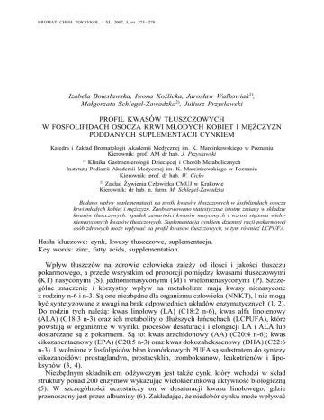 BROMAT. CHEM. TOKSYKOL. – XL, 2007, 3, str. 273 – 278 Izabela Bolesławska, Iwona Koźlicka, Jarosław Walkowiak1), Małgorzata Schlegel-Zawadzka2), Juliusz Przysławski PROFIL KWASÓW TŁUSZCZOWYCH W FOSFOLIPIDACH OSOCZA KRWI MŁODYCH KOBIET I ME˛ŻCZYZN PODDANYCH SUPLEMENTACJI CYNKIEM Katedra i Zakład Bromatologii Akademii Medycznej im. K. Marcinkowskiego w Poznaniu Kierownik: prof. AM dr hab. J. Przysławski 1) Klinika Gastroenterologii Dziecie˛cej i Chorób Metabolicznych Instytutu Pediatrii Akademii Medycznej im. K. Marcinkowskiego w Poznaniu Kierownik: prof. dr hab. W. Cichy 2) Zakład Żywienia Człowieka CMUJ w Krakowie Kierownik: dr hab. n. farm. M. Schlegel-Zawadzka Badano wpływ suplemenatacji na profil kwasów tłuszczowych w fosfolipidach osocza krwi młodych kobiet i me˛żczyzn. Zaobserwowano statystycznie istotne zmiany w składzie kwasów tłuszczowych: spadek zawartości kwasów nasyconych i wzrost ste˛żenia wielonienasyconych kwasów tłuszczowych. Suplementacja cynkiem dziennej racji pokarmowej osób zdrowych może wpływać na profil kwasów tłuszczowych, w tym również LCPUFA. Hasła kluczowe: cynk, kwasy tłuszczowe, suplementacja. Key words: zinc, fatty acids, supplementation. Wpływ tłuszczów na zdrowie człowieka zależy od ilości i jakości tłuszczu pokarmowego, a przede wszystkim od proporcji pomie˛dzy kwasami tłuszczowymi (KT) nasyconymi (S), jednonienasyconymi (M) i wielonienasyconymi (P). Szczególne znaczenie i korzystny wpływ na metabolizm maja˛ kwasy nienasycone z rodziny n-6 i n-3. Sa˛ one niezbe˛dne dla organizmu człowieka (NNKT), I nie moga˛ być syntetyzowane z uwagi na brak odpowiednich układów enzymatycznych (1, 2). Do rodzin tych należa˛: kwas linolowy (LA) (C18:2 n-6), kwas alfa linolenowy (ALA) (C18:3 n-3) oraz ich metabolity o dłuższych łańcuchach (LCPUFA), które powstaja˛ w organizmie w wyniku procesów desaturacji i elongacji LA i ALA lub dostarczane sa˛ z pokarmem. Sa˛ to: kwas arachidonowy (AA) (C20:4 n-6); kwas eikozapentaenowy (EPA) (C20:5 n-3) oraz kwas dokozaheksaenowy (DHA) (C22:6 n-3). Uwolnione z fosfolipidów błon komórkowych PUFA sa˛ substratem do syntezy eikozanoidów: prostaglandyn, prostacyklin, tromboksanów, leukotrienów i lipoksynów (3, 4). Niezbe˛dnym składnikiem odżywczym jest także cynk, który wchodzi w skład struktury ponad 200 enzymów wykazuja˛c wielokierunkowa˛ aktywność biologiczna˛ (5). W szczególności uczestniczy on w desaturacji kwasu linolowego, gdzie przenoszony jest przez albuminy (6). Zakładaja˛c, że niedobór cynku może wpływać 274 Nr 3 I. Bolesławska i inni na upośledzenie desaturacji LA, oraz, że niedobory cynku stosunkowo cze˛sto obserwuje sie˛ w populacji zdrowych osób dorosłych, podje˛to badania, których celem było określenie wpływu suplementacji cynkiem na profil kwasów tłuszczowych w fosfolipidach osocza krwi w grupie młodych kobiet i me˛żczyzn. MATERIAŁ I METODYKA BADAŃ Badaniami obje˛to grupe˛ 92 osób – kobiet i me˛żczyzn z regionu Wielkopolski. Badania prowadzono w latach 2001 – 2004. Ocene˛ sposobu żywienia prowadzono metoda˛ wywiadu o spożyciu z ostatnich 24 godz., systemem panelowym w czasie jednego tygodnia (7, 8). Ilościowa˛ i jakościowa˛ ocene˛ całodziennych racji pokarmowych tzn. wartość energetyczna˛, podaż tłuszczów, poziom spożycia cynku, przeprowadzono przy użyciu aplikacji MS Access 7.0 (9). Wyniki odniesiono do norm zaleconych przez Instytut Żywności i Żywienia w roku 1994 (10). Z tej grupy osób u 47 ochotników przeprowadzono badanie profilu kwasów tłuszczowych w fosfolipidach zarówno przed, jak i po suplementacji cynkiem. Ocene˛ składu kwasów tłuszczowych w fosfolipidach osocza krwi wykonano metoda˛ chromatografii gazowej (Hewlett-Packard 6890 Series Gas Chromathograph), po uprzedniej izolacji fosfolipidów metoda˛ chromatografii cienkowarstwowej (11, 12). Zawartość poszczególnych kwasów tłuszczowych wyrażono jako odsetek zawartości wszystkich kwasów tłuszczowych o długości łańcucha pomie˛dzy 10 a 22 atomem we˛gla. W analizie wykorzystano metody statystyki opisowej: średnia˛, odchylenie standardowe, współczynnik zmienności. Hipoteze˛ o istotności różnic pomie˛dzy wybranymi parametrami żywieniowymi i biochemicznymi testowano testem U Manna-Whitney’a na poziomie istotności p = 0,05. Istotność różnic pomie˛dzy profilem PUFA w fosfolipidach osocza krwi przed oraz po suplementacji cynkiem, testowano testem t-Studenta dla zmiennych powia˛zanych. Obliczenia wykonano przy użyciu pakietu statystycznego Statistica 6.0 PL. Badania przeprowadzono za zgoda˛ Komisji Bioetycznej przy Akademii Medycznej im. K. Marcinkowskiego w Poznaniu, nr 2413/00. WYNIKI I ICH OMÓWIENIE W tab. I przedstawiono charakterystyke˛ ogólna˛ grupy osób uczestnicza˛cej w badaniach. Wynika z niej, że średnia wieku tej grupy kobiet i me˛żczyzn wynosiła ok. 22,5 lat. Określono również wskaźnik masy ciała (BMI). W badanej grupie kobiet i me˛żczyzn wartości BMI wynosiły odpowiednio ok. 21 i 23, Tabela I Charakterystyka ogólna badanej grupy zdrowych kobiet i me˛żczyzn Table I General characterization of the examined group of healthy young men and women Badana grupa kobiet i me˛żczyzn Analizowana cecha kobiety N = 77 me˛żczyźni N = 15 Xśr SD Xśr SD 22,3 0,93 22,7 1,15 Wysokość ciała (cm) 166 5,13 177 5,52 Masa ciała (kg) 58,1 7,82 73,2 12,8 BMI (kg/m2) 20,6 2,35 23,1 2,82 WHR 0,71 0,05 0,79 0,05 FM (%) 27,7 6,23 21,9 5,37 Wiek (lata) BMI – indeks masy ciała; iloraz masy ciała wyrażonej w kilogramach i wysokości wyrażonej w metrach do kwadratu; WHR – iloraz obwodu pasa i obwodu bioder; FM – procentowy udział tkanki tłuszczowej w całkowitej masie ciała. Nr 3 275 Profil kwasów tłuszczowych a suplementacja cynkiem czyli mieściły sie˛ w zakresie wartości prawidłowych (13, 14). Wyznaczono ponadto wskaźnik WHR, którego wartości 