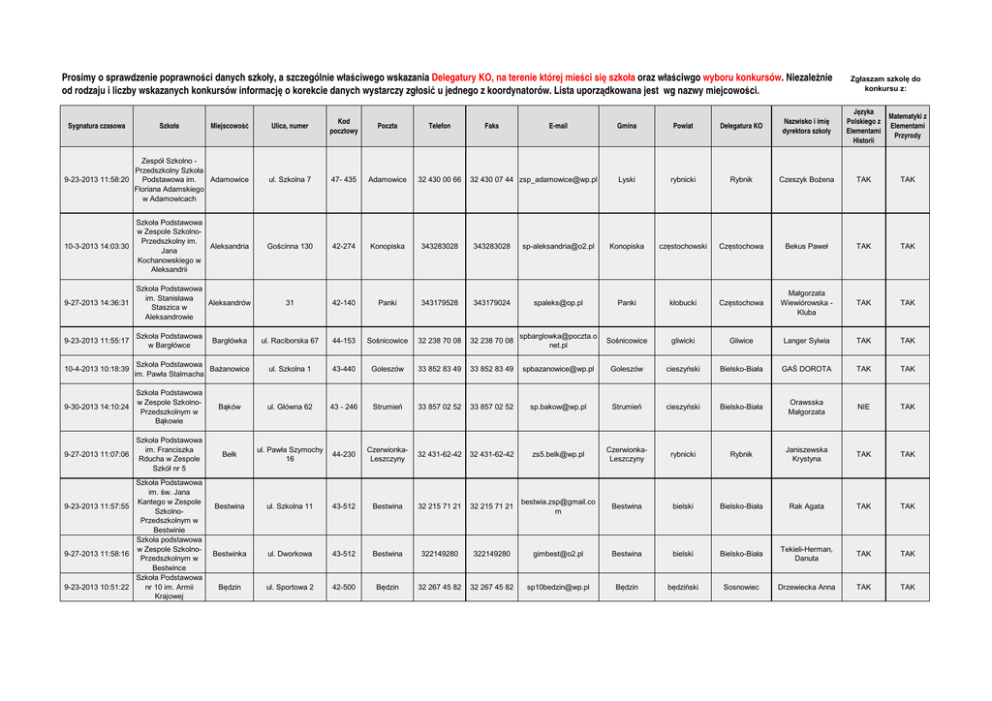 Prosimy o sprawdzenie poprawności danych szkoły, a szczególnie właściwego wskazania Delegatury KO, na terenie której mieści się szkoła oraz właściwgo wyboru konkursów. Niezależnie od rodzaju i liczby wskazanych konkursów informację o korekcie danych wystarczy zgłosić u jednego z koordynatorów. Lista uporządkowana jest wg nazwy miejcowości. Gmina Powiat Delegatura KO Nazwisko i imię dyrektora szkoły Języka Polskiego z Elementami Historii Matematyki z Elementami Przyrody Lyski rybnicki Rybnik Czeszyk Bożena TAK TAK [email protected] Konopiska częstochowski Częstochowa Bekus Paweł TAK TAK 343179024 [email protected] Panki kłobucki Częstochowa Małgorzata Wiewiórowska Kluba TAK TAK 32 238 70 08 32 238 70 08 [email protected] net.pl Sośnicowice gliwicki Gliwice Langer Sylwia TAK TAK Ulica, numer Kod pocztowy Poczta Telefon Zespół Szkolno Przedszkolny Szkoła 9-23-2013 11:58:20 Podstawowa im. Adamowice Floriana Adamskiego w Adamowicach ul. Szkolna 7 47- 435 Adamowice 32 430 00 66 Szkoła Podstawowa w Zespole SzkolnoPrzedszkolny im. 10-3-2013 14:03:30 Jana Kochanowskiego w Aleksandrii Gościnna 130 42-274 Konopiska 343283028 343283028 31 42-140 Panki 343179528 ul. Raciborska 67 44-153 Sośnicowice Sygnatura czasowa Szkoła Miejscowość Aleksandria Zgłaszam szkolę do konkursu z: Faks E-mail 32 430 07 44 [email protected] 9-27-2013 14:36:31 Szkoła Podstawowa im. Stanisława Aleksandrów Staszica w Aleksandrowie 9-23-2013 11:55:17 Szkoła Podstawowa w Bargłówce 10-4-2013 10:18:39 Szkoła Podstawowa Bażanowice im. Pawła Stalmacha ul. Szkolna 1 43-440 Goleszów 33 852 83 49 33 852 83 49 [email protected] Goleszów cieszyński Bielsko-Biała GAŚ DOROTA TAK TAK 9-30-2013 14:10:24 Szkoła Podstawowa w Zespole SzkolnoPrzedszkolnym w Bąkowie Bąków ul. Główna 62 43 - 246 Strumień 33 857 02 52 33 857 02 52 [email protected] Strumień cieszyński Bielsko-Biała Orawsska Małgorzata NIE TAK 9-27-2013 11:07:06 Szkoła Podstawowa im. Franciszka Rducha w Zespole Szkół nr 5 Bełk ul. Pawła Szymochy 16 44-230 CzerwionkaLeszczyny 32 431-62-42 32 431-62-42 [email protected] CzerwionkaLeszczyny rybnicki Rybnik Janiszewska Krystyna TAK TAK Bestwina ul. Szkolna 11 43-512 Bestwina 32 215 71 21 32 215 71 21 [email protected] m Bestwina bielski Bielsko-Biała Rak Agata TAK TAK Bestwinka ul. Dworkowa 43-512 Bestwina 322149280 322149280 [email protected] Bestwina bielski Bielsko-Biała Tekieli-Herman, Danuta TAK TAK Będzin ul. Sportowa 2 42-500 Będzin 32 267 45 82 32 267 45 82 [email protected] Będzin będziński Sosnowiec Drzewiecka Anna TAK TAK Szkoła Podstawowa im. św. Jana Kantego w Zespole 9-23-2013 11:57:55 SzkolnoPrzedszkolnym w Bestwinie Szkoła podstawowa w Zespole Szkolno9-27-2013 11:58:16 Przedszkolnym w Bestwince Szkoła Podstawowa 9-23-2013 10:51:22 nr 10 im. Armii Krajowej Bargłówka Prosimy o sprawdzenie poprawności danych szkoły, a szczególnie właściwego wskazania Delegatury KO, na terenie której mieści się szkoła oraz właściwgo wyboru konkursów. Niezależnie od rodzaju i liczby wskazanych konkursów informację o korekcie danych wystarczy zgłosić u jednego z koordynatorów. Lista uporządkowana jest wg nazwy miejcowości. Zgłaszam szkolę do konkursu z: Miejscowość Ulica, numer Kod pocztowy Poczta Telefon Faks E-mail Gmina Powiat Delegatura KO Nazwisko i imię dyrektora szkoły Języka Polskiego z Elementami Historii Matematyki z Elementami Przyrody Szkoła Podstawowa nr 13 w Miejskim 10-1-2013 14:59:28 Zespole Szkół nr 2 im. Huberta Wagnera Będzin ul. Rewolucjonistów 18 42 - 500 Będzin 32 267-50-35 32 267-50-35 [email protected] Będzin będziński Sosnowiec Wojnowska Dorota TAK TAK Szkoła Podstawowa nr 2 im Jana III 10-2-2013 13:41:07 Sobieskiego w Miejskim Zespole Szkół nr 1 Będzin ul. Wolności 51 42-500 Będzin 32 267 38 36 32 267 38 36 [email protected] Będzin będziński Sosnowiec Tomzik Jerzy TAK TAK 9-24-2013 9:09:00 Szkoła Podstawowa nr 3 im.K.Makuszyńskieg o w Miejskim Zespole Szkół nr 3 Będzin ul. Kołłątaja 63 4 -506 Będzin 32 267 49 96 32 267 49 96 [email protected] Będzin będziński Sosnowiec Rybicka Anna TAK TAK 9-25-2013 8:25:24 Szkoła Podstawowa nr 4 im. St. Staszica Będzin ul. Stalickiego1 42-503 Będzin 32 267 45 97 32 267 45 97 [email protected] Będzin będziński Sosnowiec Sowa Tomasz TAK TAK 9-30-2013 11:22:12 Szkoła Podstawowa nr 6 w Będzinieim.M.Konop nickiej Będzin ul.M.Konopnickiej 13 42-506 BędzinGrodziec 32 267-37-39 32 267-37-39 [email protected] Będzin będziński Sosnowiec Chojnacka Małgorzata TAK TAK 9-24-2013 7:51:56 Szkoła Podstawowa nr 8 im.Jana Pawła II w Będzinie Będzin ul. Orla 4 42-500 Będzin 32 267 47 61 32 267 47 61 [email protected] Będzin będziński Sosnowiec Kidawa Mariola TAK TAK Będzin ul. Jedności 38 42- 504 Będzin 4 323606178 323606154 [email protected] Będzin będziński Sosnowiec Pichura Jan TAK TAK Będzin ul. Szkolna 3 42-500 Będzin 32 267 39 30 32 267 39 30 [email protected] Będzin będziński Sosnowiec Osuszek Tomasz TAK TAK Sygnatura czasowa Szkoła Szkoła Podstawowa nr 9 w Miejskim 10-4-2013 9:55:35 Zespole Szkół nr 4 im. Noblistów Polskich Szkoła Podstawowa 9-25-2013 11:48:08 nr 1 im. A. Mickiewicza 10-2-2013 12:57:30 Szkoła Podstawowa nr 11 w Będzinie Będzin Broniewskiego 12 42-500 Będzin 322673537 322673537 [email protected] Będzin będziński Sosnowiec Janusz-Sender Jadwiga TAK TAK 10-2-2013 9:23:00 Szkoła Podstawowa w Zespole Szkół w Białej Biała ul. Częstochowska 73 42-125 Kamyk 34 362 74 76 34 362 74 76 [email protected] Kłobuck kłobucki Częstochowa ZanderSkwarczyńska Małgorzata TAK TAK 10-4-2013 11:33:14 Zespół Państwowych Szkół Muzycznych Bielsko Biała ul.Wyspiańskiego 5a im.S.Moniuszki 43-300 Bielsko Biała 334988410 334988423 [email protected] Bielsko-Biała Bielsko-Biała m. Bielsko-Biała Kucybała Andrzej TAK TAK 9-24-2013 11:17:53 Szkoła Podstawowa nr 37 Bielsko -Biała ul.Doliny Miętusiej 5 