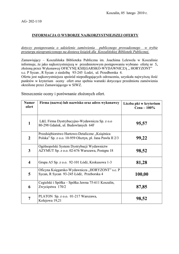 Koszalin, 05 lutego 2010 r. AG- 202-1/10 INFORMACJA O WYBORZE NAJKORZYSTNIEJSZEJ OFERTY dotyczy postępowania o udzielenie zamówienia publicznego prowadzonego w trybie przetargu nieograniczonego na dostawę książek dla Koszalińskiej Biblioteki Publicznej. Zamawiający – Koszalińska Biblioteka Publiczna im. Joachima Lelewela w Koszalinie informuje, że jako najkorzystniejszą w przedmiotowym postępowaniu wybrano ofertę nr 5, złożoną przez Wykonawcę OFICYNĘ KSIĘGARSKO-WYDAWNICZĄ „ HORYZONT” s.c. P Sycan , R Sycan z siedzibą 93-245 Łodzi, ul. Przedborska 4. Oferta jest najkorzystniejsza spośród niepodlegających odrzuceniu, uzyskała najwyższą ilość punktów w kryterium oceny ofert oraz spełnia warunki dotyczące przedmiotu zamówienia określone przez Zamawiającego w SIWZ. Streszczenie oceny i porównanie złożonych ofert. Numer ofert Firma (nazwa) lub nazwisko oraz adres wykonawcy Liczba pkt w kryterium Cena – 100% 1 L&L Firma Dystrybucyjno-Wydawnicza Sp. z o.o 80-298 Gdańsk, ul. Budowlanych 64F 95,57 2 Przedsiębiorstwo Hurtowo-Detaliczne „Książnica Polska” Sp. z o.o. 10-959 Olsztyn, pl. Jana Pawła II 2/3 99,22 3 Ogólnopolski System Dystrybucji Wydawnictw AZYMUT Sp. z o.o. 02-676 Warszawa, Postępu 18 98,52 4 Grupa A5 Sp. z o.o. 92-101 Łódź, Krokusowa 1-3 81,28 5 Oficyna Księgarsko-Wydawnicza „HORYZONT” s.c. P Sycan, R Sycan 93-245 Łódź, Przeborska 4 6 Cegielski i Spółka – Spółka Jawna 75-611 Koszalin, Zwycięstwa 170/2 87,85 7 PLATON Sp. z o.o. 01-217 Warszawa, Kolejowa 19,21 98,52 100,00