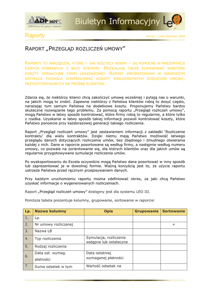 Raporty Numer 4 (62) Kwiecień 2009 RAPORT „PRZEGLĄD ROZLICZEŃ UMOWY” RAPORTY TO NARZĘDZIA, KTÓRE – DANYCH POBRANYCH Z BAZY SYSTEMU. KOSZTY OPERACYJNE FIRMY ARTYKULE POZWALA – JAK WSZYSCY WIEMY POZWALAJĄ LEASINGOWEJ. RAPORT KONTROLOWAĆ KOSZTY SĄ POMOCNE W PREZENTACJI TAKśE ELIMINOWAĆ NIEKTÓRE PREZENTOWANY W NINIEJSZYM WIELOKROTNYCH ROZLICZEŃ UMOWY, PRZYGOTOWYWANYCH NA PROŚBĘ KLIENTÓW. Zdarza się, Ŝe niektórzy klienci chcą zakończyć umowę wcześniej i pytają nas o warunki, na jakich mogą to zrobić. Zapewne niektórzy z Państwa klientów robią to dosyć często, naraŜając tym samym Państwa na dodatkowe koszty. Proponujemy Państwu bardzo skuteczne rozwiązanie tego problemu. Za pomocą raportu „Przegląd rozliczeń umowy”, mogą Państwo w łatwy sposób kontrolować, które firmy robią to regularnie, a które tylko z rzadka. Uzyskanie w łatwy sposób takiej informacji pozwoli kontrolować koszty, które Państwo ponosicie przy kaŜdorazowej generacji takiego rozliczenia. Raport „Przegląd rozliczeń umowy” jest zestawieniem informacji z zakładki ‘Rozliczenie kontraktu’ dla wielu kontraktów. Dzięki niemu mają Państwo moŜliwość łatwego przeglądu danych dotyczących rozliczenia umów, bez zbędnego i Ŝmudnego otwierania kaŜdej z nich. Dane w raporcie posortowane są według firmy, a następnie według numeru umowy, co pozwala na zorientowanie się, dla których klientów oraz dla jakich umów są regularnie przygotowywane symulacje rozliczenia umów. Po wyeksportowaniu do Excela oczywiście mogą Państwo dane posortować w inny sposób lub zaprezentować je w dowolnej formie. WaŜną korzyścią jest to, Ŝe uŜycie raportu ustrzeŜe Państwa przed ręcznym przepisywaniem danych. Przy kaŜdym uruchomieniu raportu moŜna zdefiniować okres, za jaki chcą Państwo uzyskać informacje o wygenerowanych rozliczeniach. Raport „Przegląd rozliczeń umowy” dostępny jest dla systemu LEO III. PoniŜsza tabela prezentuje kolumny, grupowanie, sortowanie w raporcie: Lp. Nazwa kolumny 1. Lp. 2. Nr umowy rozliczanej 3. Nazwa LB 4. Typ rozliczenia 5. Rodzaj rozliczenia 6. 7. Data ost. wymag. Opis Grupowanie Sortowanie + Symulacja, rozliczenie wstępne lub ostateczne płatności Data ostatniej wymaganej płatności Suma odsetek w tym Wartość odsetek na wezw. ostatnim wezwaniu do zapłaty 8. Stopa dyskonta 9. Data rozliczenia 10. Data kursu rozliczenia 11. Data generacji 12. Kurs rozliczenia 13. Refinansowanie do Data refinansowania 14. Stopa refin. Stopa refinansowania 15. Suma opłat leas. niezapł. do dnia rozlicz. NaleŜne do dnia rozlicz. koszty fin. Koszty finansowania 16. 17. 19. Suma wszystkich rat (zdyskon.) Waluta umowy 20. Koszty dodatkowe 21. Suma kwot naleŜnych LD 22. Kwota sprzedaŜy 23. Kwota wypł. odszk. 24. Inne kwoty naleŜne LB 25. Suma kwot naleŜ. LB 26. Nota obciąŜ. wyst. na LB 18. + Bardzo serdecznie zapraszamy Państwa do odwiedzenia naszego Internetowego Sklepu z raportami, w którym mogą Państwo nabyć, oprócz wielu innych pomocnych raportów, takŜe i raport „Przegląd rozliczeń umowy”, prezentowany w niniejszym numerze BIL-a. Paweł Pompe