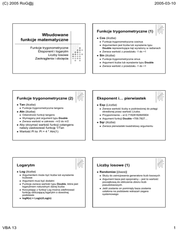 (C) 2005 RoG@j Wbudowane funkcje matematyczne Funkcje trygonometryczne Eksponent i logarytm Liczby losowe Zaokrąglenia i obcięcia 2005-03-10 Funkcje trygonometryczne (1) ! Cos (liczba) ! ! ! ! Sin (liczba) ! ! ! Funkcje trygonometryczne (2) ! Tan (liczba) ! ! ! ! ! ! Aby otrzymać wartość funkcji cotangens należy zastosować funkcję 1/Tan Wartość Pi to: Pi = 4 * Atn(1) Logarytm ! Log (liczba) ! ! ! ! ! VBA 13 ! Funkcja trygonometryczna tangens Odwrotność funkcji tangens Wymagany jest argument typu Double Zwraca wartość w zakresie –π/2 do π/2 Argumentem może być liczba lub wyrażenie liczbowe Argument musi być dodatni Funkcja zwraca wartość typu Double, która jest logarytmem naturalnym danej liczba Korzystając z funkcji Log można zdefiniować funkcję obliczającą logarytm o dowolnej podstawie logN(x) = Log(x)/Log(n) Funkcja trygonometryczna sinus Argument liczba lub wyrażenie typu Double Zwraca wartość z przedziału -1 do +1 Eksponent i… pierwiastek Exp (Liczba) ! Atn (liczba) ! Funkcja trygonometryczna cosinus Argumentem jest liczba lub wyrażenie typu Double reprezentujące kąt wyrażony w radianach Zwraca wartość z przedziału -1 do +1 ! ! ! Zwraca wartość liczby e podniesionej do potęgi określonej przez wartość Liczba. Przypomnienie – e=2.71828182845904 Argument funkcji Double <709.7827… Sqr (liczba) ! Zwraca pierwiastek kwadratowy argumentu Liczby losowe (1) ! Randomize [(baza)] ! ! ! Służy do zainicjowania generatora liczb losowych Argument baza jest opcjonalny – jest to wartość początkową do obliczenia zbioru liczb pseudolosowych. Jeśli zostanie on pominięty baza zostanie ustalona na podstawie wskazań zegara systemowego 1 (C) 2005 RoG@j Liczby losowe (2) ! Rnd [(liczba)] ! ! ! ! ! Round (Liczba, IleMiejsc) ! ! ! ! Int (liczba) ! ! ! ! VBA 13 ! Tak jak Fix zwraca część całkowitą liczby dziesiętnej W przypadku liczby ujemnej jest to jednak najmniejsza liczba całkowita mniejsza od argumentu Temp=Fix(-21.3) Temp=-21 Temp=Int(-21.3) Temp=-22 Jeśli istnieje potrzeba, aby generowane liczby mieściły się w pewnym przedziale należy wykorzystać wyrażenie: ! ! ! ! … spróbuj je stworzyć samodzielnie! Najpierw „rozciąganie” czyli zmiana długości Potem „przesunięcie” czyli zmiana początku Na koniec na przykład zmiana na całkowite Obcięcia (1) ! Funkcja zwraca liczbę zaokrągloną do zadanej dokładności Liczba to parametr obowiązkowy – dowolna liczba rzeczywista, która będzie zaokrąglana IleMiejsc to parametr opcjonalny, wskazujący z jaką dokładnością (do ilu miejsc po przecinku) należy zaokrąglić liczbę Pominięcie IleMiejsc zwraca liczbę całkowitą Obcięcia (2) ! Generowanie… Funkcja generująca liczby losowe z przedziału 0-1 Argument liczba nie jest obowiązkowy Liczba=0 – zwraca ostatnio wygenerowaną liczbę Liczba<0 – za każdym razem zwraca tę samą raz wygenerowaną wartość Liczba>0 – zwraca kolejną z liczb losowych Zaokrąglenia ! 2005-03-10 Fix (liczba) ! ! ! ! ! Argumentem jest liczba bądź wyrażenie liczbowe Funkcja zwraca część całkowitą argumentu Dla liczb całkowitych jest to argument Dla dodatnich liczb rzeczywistych jest to najbliższa liczba całkowita mniejsza od argumentu Dla liczb niecałkowitych i ujemnych funkcja zwraca najbliższą większą liczbę całkowita Moduł i znak ! Abs (liczba) ! ! ! ! Funkcja zwraca wartość bezwzględną argumentu Argumentem może być dowolne wyrażenie numeryczne bądź zmienna typu liczbowego Jeżeli w chwili wywołania zmienna nie była zainicjowana funkcja zwraca wartość 0 Sgn (liczba) ! Zwraca wartość Integer oznaczającą znak liczby podanej jako argument 2