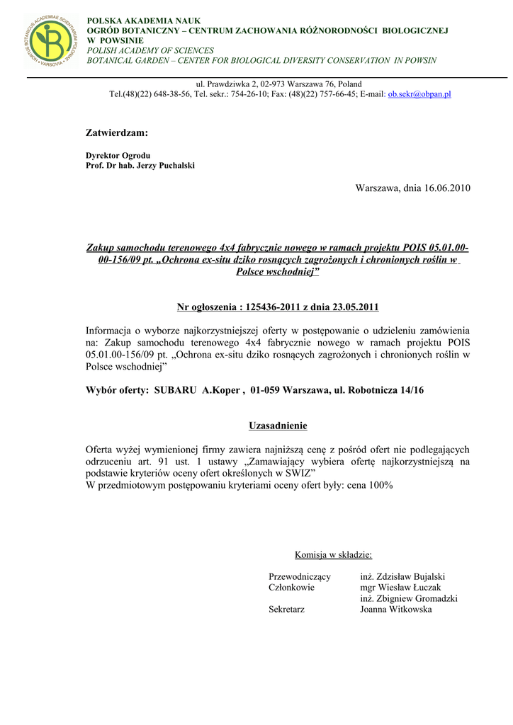 Ogłoszenie o wyborze - Polska Akademia Nauk Ogród Botaniczny