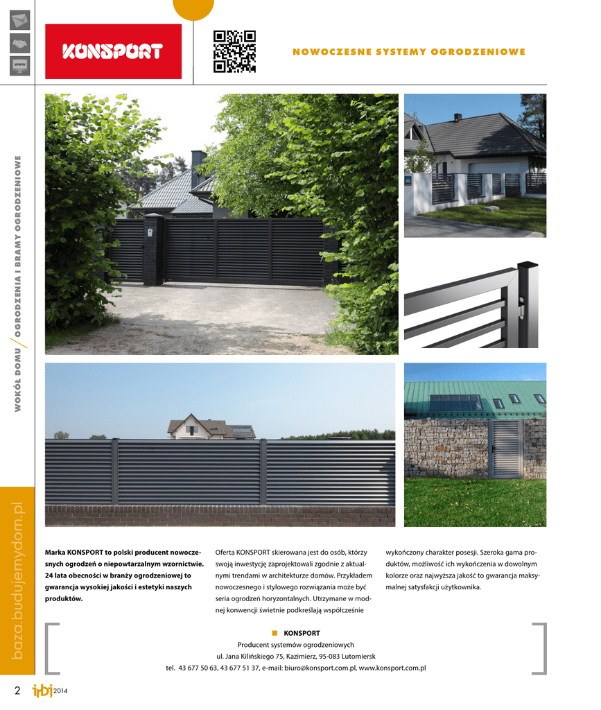 baza.budujemydom.pl WOKÓŁ DOMU / OGRODZENIA I BRAMY OGRODZENIOWE NOWOC ZESNE SYS TEMY OGRODZENIOWE Marka KONSPORT to polski producent nowocze- Oferta KONSPORT skierowana jest do osób, którzy wykończony charakter posesji. Szeroka gama pro- snych ogrodzeń o niepowtarzalnym wzornictwie. swoją inwestycję zaprojektowali zgodnie z aktual- duktów, możliwość ich wykończenia w dowolnym 24 lata obecności w branży ogrodzeniowej to nymi trendami w architekturze domów. Przykładem kolorze oraz najwyższa jakość to gwarancja maksy- gwarancja wysokiej jakości i estetyki naszych nowoczesnego i stylowego rozwiązania może być malnej satysfakcji użytkownika. produktów. seria ogrodzeń horyzontalnych. Utrzymane w modnej konwencji świetnie podkreślają współcześnie n KONSPORT Producent systemów ogrodzeniowych ul. Jana Kilińskiego 75, Kazimierz, 95-083 Lutomiersk tel. 43 677 50 63, 43 677 51 37, e-mail: [email protected], www.konsport.com.pl 2 2014 Konsport, Model PP002(P82) to kolejna nowość z serii ogrodzeń horyzontalnych KONSPORT. Ogrodzenie swoją oryginalną stylistyką podkreśli współczesną architekturę domu i jego otoczenia. Prosta forma pozbawiona zbędnych dekoracji oraz geometryczne kształty decydują o nowoczesnym charakterze tego ogrodzenia. Konstrukcja zapewnia poczucie pełnej prywatności i bezpieczeństwa. Wysoka odporność na działanie czynników atmosferycznych zapewnia długoletnią gwarancję antykorozyjną. Konsport, Model PS004 to oryginalne ogrodzenie, które dalece odbiega wyglądem od schematycznych rozwiązań. Jego nietypowa estetyka idealnie komponuje się ze współcześnie zaaranżowanymi obiektami. Poziomo ułożone specjalnie profilowane sztachety nawiązują wyglądem do żaluzji okiennych co dodatkowo umacnia nierozerwalne połączenie charakteru domu i jego otoczenia z ogrodzeniem. 2014 GALERIA PRODUKTÓW Konsport, Model PP 002(P64). Nowocześnie zaprojektowane ogrodzenie PP 002(P64) łączy ze sobą trwałość z gustowną estetyką. Poziomo ułożone kształtowniki 60x40mm nadają ogrodzeniu solidny styl, który idealnie komponuje się z ciekawie zaaranżowanymi ogrodami. Dodatkowym atutem jest możliwość wykończenia ogrodzenia w dowolnie wybranym kolorze. Wszystkie przęsła wyposażone są w elementy montażowe, za pomocą których bez trudu można zainstalować moduły zarówno do słupów systemowych jak i klinkierowych baza.budujemydom.pl Konsport, Model PP002(P). Podążając za trendami nowoczesnej architektury firma zaprojektowała ogrodzenie typu PP002(P), które idealnie wpasowuje się w dzisiejszą modę. Poziomy układ kształtowników zamkniętych w grubej ramie nadaje ogrodzeniu delikatną estetykę. W połączeniu z dzisiejszym wzornictwem posesji prywatnych otrzymujemy spójny oraz modny design, który podkreśli dowolnie wybrany kolor. 3