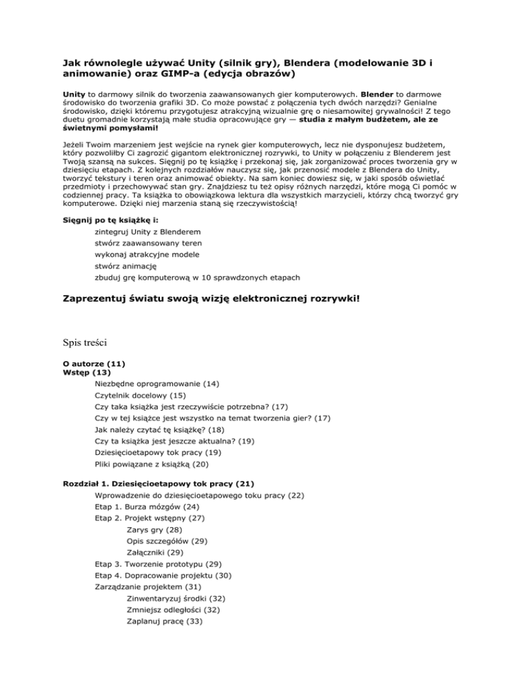 Jak równolegle używać Unity (silnik gry), Blendera (modelowanie 3D i animowanie) oraz GIMP-a (edycja obrazów) Unity to darmowy silnik do tworzenia zaawansowanych gier komputerowych. Blender to darmowe środowisko do tworzenia grafiki 3D. Co może powstać z połączenia tych dwóch narzędzi? Genialne środowisko, dzięki któremu przygotujesz atrakcyjną wizualnie grę o niesamowitej grywalności! Z tego duetu gromadnie korzystają małe studia opracowujące gry — studia z małym budżetem, ale ze świetnymi pomysłami! Jeżeli Twoim marzeniem jest wejście na rynek gier komputerowych, lecz nie dysponujesz budżetem, który pozwoliłby Ci zagrozić gigantom elektronicznej rozrywki, to Unity w połączeniu z Blenderem jest Twoją szansą na sukces. Sięgnij po tę książkę i przekonaj się, jak zorganizować proces tworzenia gry w dziesięciu etapach. Z kolejnych rozdziałów nauczysz się, jak przenosić modele z Blendera do Unity, tworzyć tekstury i teren oraz animować obiekty. Na sam koniec dowiesz się, w jaki sposób oświetlać przedmioty i przechowywać stan gry. Znajdziesz tu też opisy różnych narzędzi, które mogą Ci pomóc w codziennej pracy. Ta książka to obowiązkowa lektura dla wszystkich marzycieli, którzy chcą tworzyć gry komputerowe. Dzięki niej marzenia staną się rzeczywistością! Sięgnij po tę książkę i: zintegruj Unity z Blenderem stwórz zaawansowany teren wykonaj atrakcyjne modele stwórz animację zbuduj grę komputerową w 10 sprawdzonych etapach Zaprezentuj światu swoją wizję elektronicznej rozrywki! Spis treści O autorze (11) Wstęp (13) Niezbędne oprogramowanie (14) Czytelnik docelowy (15) Czy taka książka jest rzeczywiście potrzebna? (17) Czy w tej książce jest wszystko na temat tworzenia gier? (17) Jak należy czytać tę książkę? (18) Czy ta książka jest jeszcze aktualna? (19) Dziesięcioetapowy tok pracy (19) Pliki powiązane z książką (20) Rozdział 1. Dziesięcioetapowy tok pracy (21) Wprowadzenie do dziesięcioetapowego toku pracy (22) Etap 1. Burza mózgów (24) Etap 2. Projekt wstępny (27) Zarys gry (28) Opis szczegółów (29) Załączniki (29) Etap 3. Tworzenie prototypu (29) Etap 4. Dopracowanie projektu (30) Zarządzanie projektem (31) Zinwentaryzuj środki (32) Zmniejsz odległości (32) Zaplanuj pracę (33) Etap 5. Tworzenie elementów gry (33) Etap 6. Importowanie elementów gry do silnika (34) Etap 7. Projektowanie poziomów (36) Etap 8. Kodowanie (37) Etap 9. Testowanie (39) Etap 10. Budowanie (40) Zalecenia praktyczne (41) Podsumowanie (42) Rozdział 2. Od Blendera do Unity (45) Konfigurowanie interfejsu Blendera (46) Ciemny motyw (46) Etykietki bez pythonowych instrukcji (48) Kontrolki z programu Maya (49) "Błąd" zamykania bez zapisu (51) Przenoszenie modeli z Blendera do Unity (53) Pliki .blend (54) Ćwiczenie: ręczny eksport do FBX (55) Zawartość pliku FBX (70) Ćwiczenie: importowanie plików FBX w Unity (71) Współrzędne UV mapy światła .71 Współczynnik skali (73) Podsumowanie (74) Rozdział 3. Modułowe środowiska i siatki statyczne (77) Zalety metody modułowej (79) Rozpoczynanie prac nad środowiskiem modułowym (79) Używanie klocka podstawowego (83) Opracowywanie modułów w Blenderze (83) Odwracanie normalnych (84) Ukrywanie ścianek odwróconych tyłem .85 Funkcja przyciągania (85) N-kąty (88) Wyszukiwanie n-kątów (91) Cofanie operacji i usuwanie duplikatów .92 Mirroring (93) Grupowanie wierzchołków (94) Parametry wyświetlania siatki (97) Mapowanie UV i tworzenie tekstur .98 Wyznaczanie szwów, mapowanie UV i modelowanie (98) Atlas tekstur i pokrywanie się współrzędnych UV (100) Ustalanie gęstości tekselowej (102) Importowanie i konfigurowanie środowisk w Unity .104 Stosowanie prefabrykatów (107) Wsad statyczny (109) Podsumowanie (109) Rozdział 4. Teren (111) Tworzenie terenu w Unity (111) Parametry terenu (113) Rzeźbienie terenu (114) Malowanie terenu teksturami (115) Ocena terenów generowanych przez Unity (118) Modelowanie terenu w Blenderze (119) Metoda edycji proporcjonalnej (121) Metoda tekstury przemieszczeń (124) Metoda rzeźbienia (127) Rozdzielczość terenu (130) Malowanie terenu teksturą (131) Wyznaczanie współrzędnych UV terenu (132) Generowanie tekstury (132) Malowanie w oknie UV/Image Editor (134) Malowanie w oknie 3D View (138) Malowanie teksturami (140) Tworzenie dróg i ścieżek (143) Modelowanie dróg (144) Podsumowanie (148) Rozdział 5. Tok pracy animacyjnej (149) Klatka kluczowa jako jednostka animacji (150) Przygotowanie Blendera do tworzenia animacji (151) Wykorzystaj specjalny, animacyjny układ interfejsu Blendera (152) Uważaj na automatyczne kluczowanie .152 Wstawiaj pojedyncze klatki kluczowe (153) Długość animacji (155) Eksportowanie animacji do formatu FBX (156) Praca z wieloma animacjami (156) Prosta animacja kluczowana - od Blendera do Unity (158) Animowanie ruchu wzdłuż ścieżki i wypalanie animacji (166) Miksowanie kształtów i klucze kształtu (172) Kości i rigowanie (177) Zawsze nadawaj nazwy poszczególnym kościom (178) Szkielety symetryczne a funkcja X-Axis Mirror (178) Kinematyka prosta i odwrotna (180) Kości deformowane i sterujące (182) Eksportowanie zrigowanych postaci (182) Importowanie zrigowanych postaci do Unity (184) Podsumowanie (186) Rozdział 6. Obiekty, zależności i programowanie zdarzeniowe (187) Zależności zaprogramowane (188) Rozwiązanie DI - projektowanie komponentowe i komunikaty (190) Projektowanie komponentowe (190) Komunikaty (191) Funkcja BroadcastMessage i hierarchie (194) Wysyłanie komunikatów do wybranych obiektów (195) Wysyłanie komunikatów do obiektów nadrzędnych (197) System powiadomień (197) NotificationsManager w szczegółach (200) Singletony (201) Komunikaty a obiekty aktywne (202) Przemierzanie hierarchii obiektów (203) Podsumowanie (204) Rozdział 7. Retopologizacja (205) Siatki high-poly, czyli o dużej gęstości (206) Siatki wysokorozdzielcze a gry c
