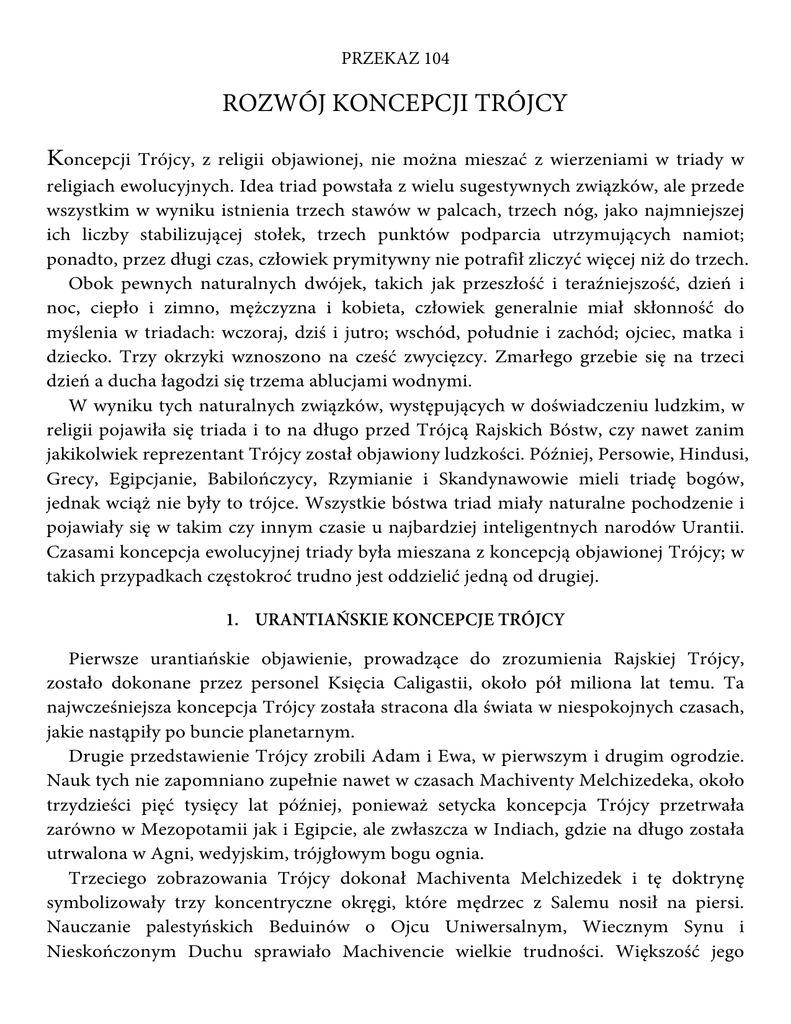 PRZEKAZ 104 ROZWÓJ KONCEPCJI TRÓJCY Koncepcji Trójcy, z religii objawionej, nie można mieszać z wierzeniami w triady w religiach ewolucyjnych. Idea triad powstała z wielu sugestywnych związków, ale przede wszystkim w wyniku istnienia trzech stawów w palcach, trzech nóg, jako najmniejszej ich liczby stabilizującej stołek, trzech punktów podparcia utrzymujących namiot; ponadto, przez długi czas, człowiek prymitywny nie potrafił zliczyć więcej niż do trzech. Obok pewnych naturalnych dwójek, takich jak przeszłość i teraźniejszość, dzień i noc, ciepło i zimno, mężczyzna i kobieta, człowiek generalnie miał skłonność do myślenia w triadach: wczoraj, dziś i jutro; wschód, południe i zachód; ojciec, matka i dziecko. Trzy okrzyki wznoszono na cześć zwycięzcy. Zmarłego grzebie się na trzeci dzień a ducha łagodzi się trzema ablucjami wodnymi. W wyniku tych naturalnych związków, występujących w doświadczeniu ludzkim, w religii pojawiła się triada i to na długo przed Trójcą Rajskich Bóstw, czy nawet zanim jakikolwiek reprezentant Trójcy został objawiony ludzkości. Później, Persowie, Hindusi, Grecy, Egipcjanie, Babilończycy, Rzymianie i Skandynawowie mieli triadę bogów, jednak wciąż nie były to trójce. Wszystkie bóstwa triad miały naturalne pochodzenie i pojawiały się w takim czy innym czasie u najbardziej inteligentnych narodów Urantii. Czasami koncepcja ewolucyjnej triady była mieszana z koncepcją objawionej Trójcy; w takich przypadkach częstokroć trudno jest oddzielić jedną od drugiej. 1. URANTIAŃSKIE KONCEPCJE TRÓJCY Pierwsze urantiańskie objawienie, prowadzące do zrozumienia Rajskiej Trójcy, zostało dokonane przez personel Księcia Caligastii, około pół miliona lat temu. Ta najwcześniejsza koncepcja Trójcy została stracona dla świata w niespokojnych czasach, jakie nastąpiły po buncie planetarnym. Drugie przedstawienie Trójcy zrobili Adam i Ewa, w pierwszym i drugim ogrodzie. Nauk tych nie zapomniano zupełnie nawet w czasach Machiventy Melchizedeka, około trzydzieści pięć tysięcy lat później, ponieważ setycka koncepcja Trójcy przetrwała zarówno w Mezopotamii jak i Egipcie, ale zwłaszcza w Indiach, gdzie na długo została utrwalona w Agni, wedyjskim, trójgłowym bogu ognia. Trzeciego zobrazowania Trójcy dokonał Machiventa Melchizedek i tę doktrynę symbolizowały trzy koncentryczne okręgi, które mędrzec z Salemu nosił na piersi. Nauczanie palestyńskich Beduinów o Ojcu Uniwersalnym, Wiecznym Synu i Nieskończonym Duchu sprawiało Machivencie wielkie trudności. Większość jego uczniów uważała, że Trójca składa się z trzech Najwyższych Ojców z Norlatiadeku; dla kilku z nich Trójcę stanowili Władca Systemu, Ojciec Konstelacji i Stwórcze Bóstwo wszechświata lokalnego; jeszcze mniej ludzi mgliście tylko pojmowało ideę rajskiego związku Ojca, Syna i Ducha. W wyniku działalności misjonarzy salemskich, nauki Melchizedeka o Trójcy szerzyły się stopniowo na znacznej części Eurazji i Afryki północnej. W kolejnych epokach andickich i post-Melchizedekowych, trudno jest czasem rozróżnić pomiędzy triadami a trójcami, kiedy obie te koncepcje do pewnego stopnia mieszały się i łączyły. Trójcowa koncepcja hinduistów sięga swymi korzeniami do Istoty, Inteligencji i Radości. (Późniejszą, indyjską koncepcję, stanowili Brahma, Śiwa i Wisznu). Podczas gdy wcześniejsze interpretacje Trójcy sprowadzone zostały do Indii przez kapłanów setyckich, późniejsze idee Trójcy zostały importowane przez misjonarzy salemskich oraz kształtowane były przez rodzime intelekty indyjskie, które mieszały te doktryny z koncepcjami triad ewolucyjnych. Wiara buddyjska wytworzyła dwie doktryny trójcowej natury. Wcześniejszą stanowili Nauczyciel, Prawo i Braterstwo; takiego zobrazowania dokonał Gautama Siddhartha. Idea późniejsza, ukształtowana w północnym odgałęzieniu zwolenników Buddy, obejmowała Najwyższego Pana, Ducha Świętego i Wcielonego Zbawiciela. Takie idee hinduistów i buddystów były prawdziwymi założeniami trójcowymi, to znaczy ideą trojakiego przejawu monoteistycznego Boga. Prawdziwa koncepcja trójcy nie jest zwyczajnie grupą trzech oddzielnych bogów. Hebrajczycy znali Trójcę z tradycji kenickich, pochodzących z czasów Melchizedeka, ale ich monoteistyczna gorliwość w uznawaniu jednego Boga, Jahwe, tak przesłoniła wszelkie podobne nauki, że do czasu przyjścia Jezusa doktryna Elohima została praktycznie wykorzeniona z teologii żydowskiej. Hebrajski umysł nie mógł pogodzić idei trójcowej z monoteistycznym wierzeniem w Jednego Pana Boga Izraela. Wyznawcy islamu tak samo nie mogli zrozumieć idei Trójcy. Wyłaniającemu się monoteizmowi zawsze trudno jest tolerować trójcowość, gdy staje w obliczu politeizmu. Idea trójcy zyskuje największy wpływ w tych religiach, które mają mocną tradycję monoteistyczną, połączoną z doktrynalną elastycznością. Wielkim monoteistom, hebrajczykom i mahometanom, trudność sprawiało rozróżnianie pomiędzy czczeniem trzech bogów, politeizmem a trójcowością – czczeniem jednego Bóstwa istniejącego w potrójnym przejawie boskości i osobowości. Jezus nauczał swoich apostołów prawdy o trzech osobach Rajskiej Trójcy, ale oni myśleli, że mówi obrazowo i symbolicznie. Wychowanym w hebrajskim monoteizmie trudno było żywić jakiekolwiek wierzenie, które zdawało się kolidować z ich zasadniczą koncepcją Jahwe. I wcześni chrześcijanie odziedziczyli hebrajskie uprzedzenia wobec koncepcji Trójcy. Pierwsza chrześcijańska Trójca głoszona była w Antiochii i składała się z Boga, jego Słowa i jego Mądrości. Paweł wiedział o Rajskiej Trójcy, Ojca, Syna i Ducha, ale rzadko o niej nauczał a wspominał o niej tylko w kilku swoich listach do nowo powstających Kościołów. Oprócz tego, podobnie jak jego bracia apostołowie, Paweł mylił Jezusa,