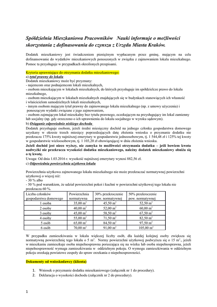 Spółdzielnia Mieszkaniowa Pracowników Nauki informuje o możliwości skorzystania z dofinasowania do czynszu z Urzędu Miasta Kraków. Dodatek mieszkaniowy jest świadczeniem pieniężnym wypłacanym przez gminę, mającym na celu dofinansowanie do wydatków mieszkaniowych ponoszonych w związku z zajmowaniem lokalu mieszkalnego. Pomoc ta przysługuje w przypadkach określonych przepisami. Kryteria uprawniające do otrzymania dodatku mieszkaniowego: a) tytuł prawny do lokalu Dodatek mieszkaniowy może być przyznany: - najemcom oraz podnajemcom lokali mieszkalnych, - osobom mieszkającym w lokalach mieszkalnych, do których przysługuje im spółdzielcze prawo do lokalu mieszkalnego, - osobom mieszkającym w lokalach mieszkalnych znajdujących się w budynkach stanowiących ich własność i właścicielom samodzielnych lokali mieszkalnych, - innym osobom mającym tytuł prawny do zajmowanego lokalu mieszkalnego (np. z umowy użyczenia) i ponoszącym wydatki związane z jego zajmowaniem, - osobom zajmującym lokal mieszkalny bez tytułu prawnego, oczekującym na przysługujący im lokal zamienny lub socjalny (np. gdy orzeczono o ich uprawnieniu do lokalu socjalnego w wyroku sądowym). b) Osiąganie odpowiednio niskiego dochodu Dodatek przysługuje osobom, jeżeli średni miesięczny dochód na jednego członka gospodarstwa domowego uzyskany w okresie trzech miesięcy poprzedzających datę złożenia wniosku o przyznanie dodatku nie przekracza 175% kwoty najniższej emerytury w gospodarstwie jednoosobowym, tj. 1 544,48 zł i 125% tej kwoty w gospodarstwie wieloosobowym, tj. 1 103,20 zł obowiązującej w dniu złożenia wniosku. Jeżeli dochód jest nieco wyższy, nie zamyka to możliwości otrzymania dodatku – jeśli bowiem kwota nadwyżki nie przekracza wysokości dodatku mieszkaniowego, należny dodatek mieszkaniowy obniża się o tę kwotę. Uwaga: Od dnia 1.03.2016 r. wysokość najniższej emerytury wynosi 882,56 zł. c) Odpowiednia powierzchnia użytkowa lokalu Powierzchnia użytkowa zajmowanego lokalu mieszkalnego nie może przekraczać normatywnej powierzchni użytkowej o więcej niż: - 30 % albo - 50 % pod warunkiem, że udział powierzchni pokoi i kuchni w powierzchni użytkowej tego lokalu nie przekracza 60 %. Liczba członków Powierzchnia 30% przekroczenie 50% przekroczenie gospodarstwa domowego normatywna pow. normatywnej pow. normatywnej 2 2 1 osoba 35,00 m 45,50 m 52,50 m2 2 2 2 osoby 40,00 m 52,00 m 60,00 m2 3 osoby 45,00 m2 58,50 m2 67,50 m2 2 2 4 osoby 55,00 m 71,50 m 82,50 m2 2 2 5 osób 65,00 m 84,50 m 97,50 m2 6 osób 70,00 m2 91,00 m2 105,00 m2 W przypadku zamieszkiwania w lokalu większej liczby osób, dla każdej kolejnej osoby zwiększa się normatywną powierzchnię tego lokalu o 5 m2. Normy powierzchni użytkowej podwyższa się o 15 m 2., jeżeli w mieszkaniu zamieszkuje osoba niepełnosprawna poruszająca się na wózku lub osoba niepełnosprawna, jeżeli niepełnosprawność wymaga zamieszkiwania w oddzielnym pokoju. O wymogu zamieszkiwania w oddzielnym pokoju orzekają powiatowe zespoły do spraw orzekania o niepełnosprawności. Dokumenty od wnioskodawcy (klienta) 1. Wniosek o przyznanie dodatku mieszkaniowego (załącznik nr 1 do procedury). 2. Deklaracja o wysokości dochodu (załącznik nr 2 do procedury). 1 3. Dokument potwierdzający wysokość dochodów wszystkich członków gospodarstwa domowego uzyskanych w okresie trzech pełnych miesięcy kalendarzowych poprzedzających datę złożenia wniosku, w szczególności: 1) zaświadczenie o dochodzie z zakładu pracy (załącznik nr 3 do procedury) – dot. osób zatrudnionych na podstawie m.in. umowy o pracę, umowy zlecenia, o dzieło. 2) oświadczenie o dochodach (załącznik nr 4 do procedury) – dot. osób uzyskujących dochody m.in. z prac dorywczych, działalności gospodarczej, otrzymujących pomoc finansową od rodziny/osób trzecich, dobrowolne alimenty. 3) odcinki przekazów pocztowych renty/emerytury lub zaświadczenie z ZUS – dot. osób pobierających świadczenia emerytalno-rentowe. 4) odcinki przekazów pocztowych lub wyciąg z konta bankowego lub odpis wyroku sądowego przyznającego alimenty – dot. osób otrzymujących alimenty na podstawie wyroku sądowego. 5) decyzja przyznająca świadczenia rodzinne/fundusz alimentacyjny lub odcinki przekazów pocztowych lub wyciąg z konta bankowego – dot. osób pobierających świadczenia rodzinne/fundusz alimentacyjny. 6) zaświadczenie o wysokości stypendium (socjalnego, naukowego, mieszkaniowego, na wyżywienie) lub o nie pobieraniu stypendium – dot. studentów wyższych uczelni. 7) zaświadczenie z urzędu gminy o dochodowości z hektara przeliczeniowego – dot. osób posiadających gospodarstwo rolne. 4. Tytuł prawny do lokalu lub dokument potwierdzający oczekiwanie na przysługujący lokal socjalny lub zamienny. 5. Dokument potwierdzający wysokość opłat mieszkaniowych (np. aneks czynszowy, rachunki) lub wyszczególnienie rodzaju i wysokości wydatków we wniosku przez zarządcę budynku. 6. Faktura VAT za energię elektryczną za ostatni okres rozliczeniowy. 7. Dokumenty lub oświadczenie właściciela domu jednorodzinnego o wielkości powierzchni użytkowej, w tym łącznej powierzchni pokoi i kuchni oraz o wyposażeniu technicznym domu (załącznik nr 5 do procedury)– dotyczy domów jednorodzinnych. W przypadku doręczenia kserokopii dokumentów, o których mowa w pkt. 3-6 należy przedłożyć oryginały tych dokumentów do wglądu (nie dotyczy załączników do niniejszej procedury). Podstawa prawna 1. 2. 3. 4. Ustawa z dnia 21 czerwca 2001 r. o dodatkach mieszkaniowych (Dz. U. z 2013 r., poz. 966 z późn. zm.). Rozporządzenie Rady Ministrów z dnia 28 grudnia 2001 r. w sprawie dodatków mieszkaniowych (Dz. U. Nr 156, poz. 1817, z późn. zm.). Rozporządzenie Ministra Transportu, Budownictwa i Gospodarki Morskiej z dnia 26 kwietnia 2013 r. w sprawie sposobu przeprowadzania wywiadu środowiskowego, wzoru kwe