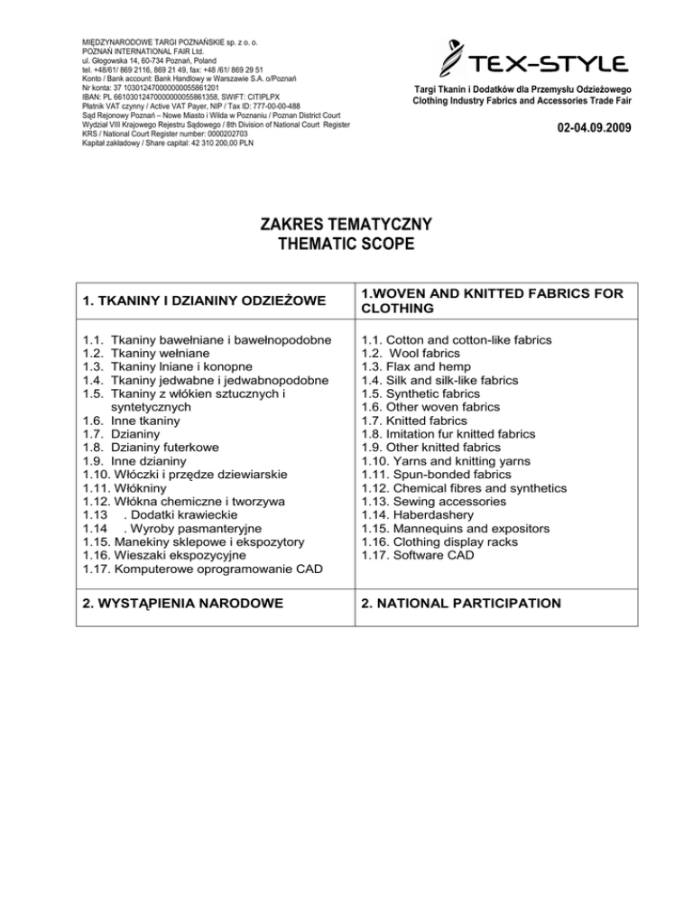 MIĘDZYNARODOWE TARGI POZNAŃSKIE sp. z o. o. POZNAŃ INTERNATIONAL FAIR Ltd. ul. Głogowska 14, 60-734 Poznań, Poland tel. +48/61/ 869 2116, 869 21 49, fax: +48 /61/ 869 29 51 Konto / Bank account: Bank Handlowy w Warszawie S.A. o/Poznań Nr konta: 37 103012470000000055861201 IBAN: PL 66103012470000000055861358, SWIFT: CITIPLPX Płatnik VAT czynny / Active VAT Payer, NIP / Tax ID: 777-00-00-488 Sąd Rejonowy Poznań – Nowe Miasto i Wilda w Poznaniu / Poznan District Court Wydział VIII Krajowego Rejestru Sądowego / 8th Division of National Court Register KRS / National Court Register number: 0000202703 Kapitał zakładowy / Share capital: 42 310 200,00 PLN Targi Tkanin i Dodatków dla Przemysłu OdzieŜowego Clothing Industry Fabrics and Accessories Trade Fair 02-04.09.2009 ZAKRES TEMATYCZNY THEMATIC SCOPE 1. TKANINY I DZIANINY ODZIEśOWE 1.WOVEN AND KNITTED FABRICS FOR CLOTHING 1.1. 1.2. 1.3. 1.4. 1.5. Tkaniny bawełniane i bawełnopodobne Tkaniny wełniane Tkaniny lniane i konopne Tkaniny jedwabne i jedwabnopodobne Tkaniny z włókien sztucznych i syntetycznych 1.6. Inne tkaniny 1.7. Dzianiny 1.8. Dzianiny futerkowe 1.9. Inne dzianiny 1.10. Włóczki i przędze dziewiarskie 1.11. Włókniny 1.12. Włókna chemiczne i tworzywa 1.13 . Dodatki krawieckie 1.14 . Wyroby pasmanteryjne 1.15. Manekiny sklepowe i ekspozytory 1.16. Wieszaki ekspozycyjne 1.17. Komputerowe oprogramowanie CAD 1.1. Cotton and cotton-like fabrics 1.2. Wool fabrics 1.3. Flax and hemp 1.4. Silk and silk-like fabrics 1.5. Synthetic fabrics 1.6. Other woven fabrics 1.7. Knitted fabrics 1.8. Imitation fur knitted fabrics 1.9. Other knitted fabrics 1.10. Yarns and knitting yarns 1.11. Spun-bonded fabrics 1.12. Chemical fibres and synthetics 1.13. Sewing accessories 1.14. Haberdashery 1.15. Mannequins and expositors 1.16. Clothing display racks 1.17. Software CAD 2. WYSTĄPIENIA NARODOWE 2. NATIONAL PARTICIPATION