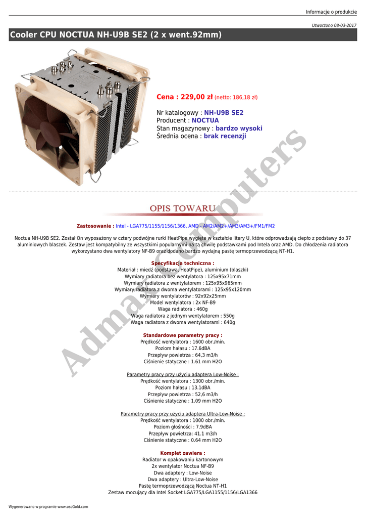 Informacje o produkcie Utworzono 08-03-2017 Cooler CPU NOCTUA NH-U9B SE2 (2 x went.92mm) Cena : 229,00 zł (netto: 186,18 zł) pu te r s Nr katalogowy : NH-U9B SE2 Producent : NOCTUA Stan magazynowy : bardzo wysoki Średnia ocena : brak recenzji C om Zastosowanie : Intel - LGA775/1155/1156/1366, AMD - AM2/AM2+/AM3/AM3+/FM1/FM2 Noctua NH-U9B SE2. Został On wyposażony w cztery podwójne rurki HeatPipe wygięte w kształcie litery U, które odprowadzają ciepło z podstawy do 37 aluminiowych blaszek. Zestaw jest kompatybilny ze wszystkimi popularnymi na tą chwilę podstawkami pod Intela oraz AMD. Do chłodzenia radiatora wykorzystano dwa wentylatory NF-B9 oraz dodano bardzo wydajną pastę termoprzewodzącą NT-H1. Ad m ax Specyfikacja techniczna : Materiał : miedź (podstawa, HeatPipe), aluminium (blaszki) Wymiary radiatora bez wentylatora : 125x95x71mm Wymiary radiatora z wentylatorem : 125x95x965mm Wymiary radiatora z dwoma wentylatorami : 125x95x120mm Wymiary wentylatorów : 92x92x25mm Model wentylatora : 2x NF-B9 Waga radiatora : 460g Waga radiatora z jednym wentylatorem : 550g Waga radiatora z dwoma wentylatorami : 640g Standardowe parametry pracy : Prędkość wentylatora : 1600 obr./min. Poziom hałasu : 17.6dBA Przepływ powietrza : 64,3 m3/h Ciśnienie statyczne : 1.61 mm H2O Parametry pracy przy użyciu adaptera Low-Noise : Prędkość wentylatora : 1300 obr./min. Poziom hałasu : 13.1dBA Przepływ powietrza : 52,6 m3/h Ciśnienie statyczne : 1.09 mm H2O Parametry pracy przy użyciu adaptera Ultra-Low-Noise : Prędkość wentylatora : 1000 obr./min. Poziom głośności : 7.9dBA Przepływ powietrza: 41.1 m3/h Ciśnienie statyczne : 0.64 mm H2O Komplet zawiera : Radiator w opakowaniu kartonowym 2x wentylator Noctua NF-B9 Dwa adaptery : Low-Noise Dwa adaptery : Ultra-Low-Noise Pastę termoprzewodzącą Noctua NT-H1 Zestaw mocujący dla Intel Socket LGA775/LGA1155/1156/LGA1366 Wygenerowano w programie www.oscGold.com Zestaw mocujący dla AMD Socket AM2/AM2+/AM3/AM3+ Zestaw do montażu dwóch wentylatorów 92mm Zestaw pasków antywibracyjnych pod dwa wentylatory 92mm Instrukcję montażu Gwarancja: 72 m-ce kod1007 kod1009 kod1010 Setki nagród i zwycięskich testów na całym świecie: m ax C om pu te r s www.noctua.at/main.php Ad kod1006 kod1011