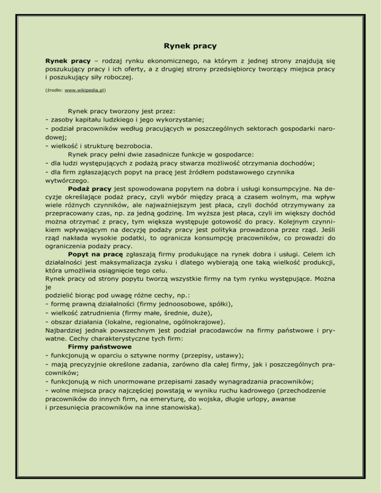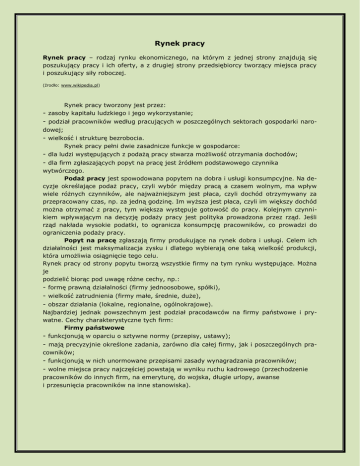 Rynek pracy Rynek pracy – rodzaj rynku ekonomicznego, na którym z jednej strony znajdują się poszukujący pracy i ich oferty, a z drugiej strony przedsiębiorcy tworzący miejsca pracy i poszukujący siły roboczej. (źrodło: www.wikipedia.pl) Rynek pracy tworzony jest przez: - zasoby kapitału ludzkiego i jego wykorzystanie; - podział pracowników według pracujących w poszczególnych sektorach gospodarki narodowej; - wielkość i strukturę bezrobocia. Rynek pracy pełni dwie zasadnicze funkcje w gospodarce: - dla ludzi występujących z podażą pracy stwarza możliwość otrzymania dochodów; - dla firm zgłaszających popyt na pracę jest źródłem podstawowego czynnika wytwórczego. Podaż pracy jest spowodowana popytem na dobra i usługi konsumpcyjne. Na decyzje określające podaż pracy, czyli wybór między pracą a czasem wolnym, ma wpływ wiele różnych czynników, ale najważniejszym jest płaca, czyli dochód otrzymywany za przepracowany czas, np. za jedną godzinę. Im wyższa jest płaca, czyli im większy dochód można otrzymać z pracy, tym większa występuje gotowość do pracy. Kolejnym czynnikiem wpływającym na decyzję podaży pracy jest polityka prowadzona przez rząd. Jeśli rząd nakłada wysokie podatki, to ogranicza konsumpcję pracowników, co prowadzi do ograniczenia podaży pracy. Popyt na pracę zgłaszają firmy produkujące na rynek dobra i usługi. Celem ich działalności jest maksymalizacja zysku i dlatego wybierają one taką wielkość produkcji, która umożliwia osiągnięcie tego celu. Rynek pracy od strony popytu tworzą wszystkie firmy na tym rynku występujące. Można je podzielić biorąc pod uwagę różne cechy, np.: - formę prawną działalności (firmy jednoosobowe, spółki), - wielkość zatrudnienia (firmy małe, średnie, duże), - obszar działania (lokalne, regionalne, ogólnokrajowe). Najbardziej jednak powszechnym jest podział pracodawców na firmy państwowe i prywatne. Cechy charakterystyczne tych firm: Firmy państwowe - funkcjonują w oparciu o sztywne normy (przepisy, ustawy); - mają precyzyjnie określone zadania, zarówno dla całej firmy, jak i poszczególnych pracowników; - funkcjonują w nich unormowane przepisami zasady wynagradzania pracowników; - wolne miejsca pracy najczęściej powstają w wyniku ruchu kadrowego (przechodzenie pracowników do innych firm, na emeryturę, do wojska, długie urlopy, awanse i przesunięcia pracowników na inne stanowiska). Firmy prywatne - działają w oparciu o przepisy prawne, jednak kierują się zasadami wolnego rynku; - decyzje szefów firm zapadają głównie pod wpływem zmian ekonomicznych na rynku; - o potrzebach zatrudnieniowych, oprócz ruchu kadrowego, decydują również zjawiska na rynku, na którym działa firma. (źrodło:www.pup.rzeszow.pl) LINKI: http://www.rynekpracy.pl Specjalistyczny (komercyjny) portal wiedzy poświęcony problematyce i funkcjonowaniu rynku pracy. Udostępnia użytkownikom kompleksową wiedzę z zakresu: struktury i dostępności zasobów ludzkich, wskaźników opisujących wydajność, koszty i warunki pracy, mobilności przestrzennej i zawodowej pracowników, sytuacji na branżowych i regionalnych rynkach pracy, kosztów i warunków życia, trendów na rynkach pracy. http://www.strzyzowski.pl/usluginaprawy-handel-813 Informacje teleadresowe o przedsiębiorcach powiatu strzyżowskiego z podziałem na branże
