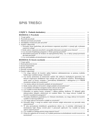 SPIS TREŚCI CZĘŚĆ I. Podatek dochodowy .............................................................................................. 11 ROZDZIAŁ I. Przychody .............................................................................................................. 13 13 14 18 18 19 1. 2. 3. 4. 5. Uwagi ogólne ................................................................................................................................... Pozostałe przychody ......................................................................................................................... Moment powstania przychodu ......................................................................................................... Nieodpłatne świadczenia jako przychód .......................................................................................... Pytania i odpowiedzi ....................................................................................................................... 1. Prowadzę firmę budowlaną, jak powinienem rozpoznać przychód w sytuacji gdy wykonano częściowo usługę? ........................................................................................................................ 2. Kiedy należy rozpoznać przychód w przypadku dokonania sprzedaży przez Internet? ................ 3. Czy używanie bezpłatnego programu w firmie generuje przychód? ............................................. 4. Otrzymałem poręczenie do kredytu od zaprzyjaźnionej firmy, czy w takiej sytuacji powstanie dla mnie przychód? ....................................................................................................................... 5. Czy zwrot podatku od nieruchomości stanowi przychód? ............................................................ ROZDZIAŁ II. Koszty uzyskania ................................................................................................ 1. Uwagi ogólne .................................................................................................................................... 2. Dzień poniesienia kosztu ................................................................................................................... 3. Koszty bezpośrednie ......................................................................................................................... 4. Koszty pośrednie .............................................................................................................................. 5. Dowody wewnętrzne ......................................................................................................................... 6. Pytania i odpowiedzi ......................................................................................................................... 1. Czy mogę zaliczyć do kosztów opłaty bankowe udokumentowane za pomocą wydruku bankowego wydrukowanego z Internetu? .................................................................................. 2. Czy koszty poniesione na ukończenie studiów dla zdobycia niezbędnych uprawnień, bez których rozpoczęcie działalności tego rodzaju nie jest ustawowo możliwe, Wnioskodawca może uznać za koszty związane z prowadzoną działalnością i zaksięgować je w PKPiR niezależnie od daty ich wystawienia? ......................................................................................... 3. Czy można zaliczyć do kosztów podatek od nieruchomości? .................................................... 4. Kiedy można zaliczyć do kosztów zaległy podatek od nieruchomości? ..................................... 5. Czy podatek od środków transportu można zaliczyć do kosztów ............................................... 6. Czy wydatki na hotel dla kontrahenta mogą stanowić koszt? .................................................... 7. Poniosłem za granicą koszty związane z odbytą podróżą służbową. W sklepach gdzie dokonywałem zakupów odmówiono mi wydania faktur. Czy mogę zaliczyć wydatki do kosztów na podstawie paragonów? ............................................................................................ 8. Prowadzę działalność gospodarczą we własnym mieszkaniu, czy mogę zaliczyć do kosztów wydatki na telewizję kablową? ................................................................................................... 9. Czy mogę zaliczyć do kosztów wydatki na wizytówki? ............................................................. 10. Prowadzę sklep, z uwagi na zalanie część towarów uległa zniszczeniu czy powstałe straty stanowią koszt? .......................................................................................................................... 11. W toku prowadzonej działalności gospodarczej zdarza się, iż jesteśmy zobowiązani do dochodzenia bądź obrony swoich praw w procesach sądowych. Czy wydatki na koszty sądowe stanowią koszt? ............................................................................................................. 12. Czy wydatki na obsługę prawną mogą stanowić koszt? ............................................................. 13. Firma nie zapłaciła mi za towary czy wydatki poniesione na dochodzenie swoich roszczeń stanowią koszt? ............................................................................................................................... 19 20 21 22 23 25 25 26 26 27 29 31 31 32 33 33 34 36 37 38 40 41 42 45 46 6 14. Przegraliśmy spór przed sądem czy wydatki poniesione w związku z procesem stanowią koszt? ......................................................................................................................................... 15. Czy mogę zakupić towar na rachunek firmy przed datą rozpoczęcia działalności? .................... 16. Czy kara umowna może być kosztem? .......................................................................................
