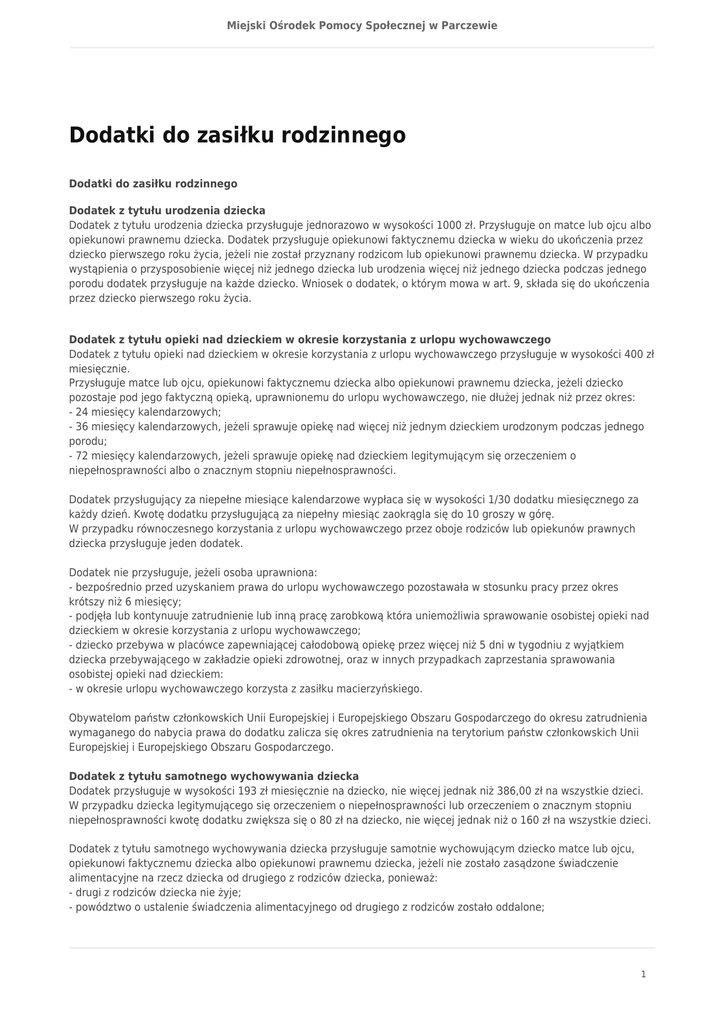 Miejski Ośrodek Pomocy Społecznej w Parczewie Dodatki do zasiłku rodzinnego Dodatki do zasiłku rodzinnego Dodatek z tytułu urodzenia dziecka Dodatek z tytułu urodzenia dziecka przysługuje jednorazowo w wysokości 1000 zł. Przysługuje on matce lub ojcu albo opiekunowi prawnemu dziecka. Dodatek przysługuje opiekunowi faktycznemu dziecka w wieku do ukończenia przez dziecko pierwszego roku życia, jeżeli nie został przyznany rodzicom lub opiekunowi prawnemu dziecka. W przypadku wystąpienia o przysposobienie więcej niż jednego dziecka lub urodzenia więcej niż jednego dziecka podczas jednego porodu dodatek przysługuje na każde dziecko. Wniosek o dodatek, o którym mowa w art. 9, składa się do ukończenia przez dziecko pierwszego roku życia. Dodatek z tytułu opieki nad dzieckiem w okresie korzystania z urlopu wychowawczego Dodatek z tytułu opieki nad dzieckiem w okresie korzystania z urlopu wychowawczego przysługuje w wysokości 400 zł miesięcznie. Przysługuje matce lub ojcu, opiekunowi faktycznemu dziecka albo opiekunowi prawnemu dziecka, jeżeli dziecko pozostaje pod jego faktyczną opieką, uprawnionemu do urlopu wychowawczego, nie dłużej jednak niż przez okres: - 24 miesięcy kalendarzowych; - 36 miesięcy kalendarzowych, jeżeli sprawuje opiekę nad więcej niż jednym dzieckiem urodzonym podczas jednego porodu; - 72 miesięcy kalendarzowych, jeżeli sprawuje opiekę nad dzieckiem legitymującym się orzeczeniem o niepełnosprawności albo o znacznym stopniu niepełnosprawności. Dodatek przysługujący za niepełne miesiące kalendarzowe wypłaca się w wysokości 1/30 dodatku miesięcznego za każdy dzień. Kwotę dodatku przysługującą za niepełny miesiąc zaokrągla się do 10 groszy w górę. W przypadku równoczesnego korzystania z urlopu wychowawczego przez oboje rodziców lub opiekunów prawnych dziecka przysługuje jeden dodatek. Dodatek nie przysługuje, jeżeli osoba uprawniona: - bezpośrednio przed uzyskaniem prawa do urlopu wychowawczego pozostawała w stosunku pracy przez okres krótszy niż 6 miesięcy; - podjęła lub kontynuuje zatrudnienie lub inną pracę zarobkową która uniemożliwia sprawowanie osobistej opieki nad dzieckiem w okresie korzystania z urlopu wychowawczego; - dziecko przebywa w placówce zapewniającej całodobową opiekę przez więcej niż 5 dni w tygodniu z wyjątkiem dziecka przebywającego w zakładzie opieki zdrowotnej, oraz w innych przypadkach zaprzestania sprawowania osobistej opieki nad dzieckiem: - w okresie urlopu wychowawczego korzysta z zasiłku macierzyńskiego. Obywatelom państw członkowskich Unii Europejskiej i Europejskiego Obszaru Gospodarczego do okresu zatrudnienia wymaganego do nabycia prawa do dodatku zalicza się okres zatrudnienia na terytorium państw członkowskich Unii Europejskiej i Europejskiego Obszaru Gospodarczego. Dodatek z tytułu samotnego wychowywania dziecka Dodatek przysługuje w wysokości 193 zł miesięcznie na dziecko, nie więcej jednak niż 386,00 zł na wszystkie dzieci. W przypadku dziecka legitymującego się orzeczeniem o niepełnosprawności lub orzeczeniem o znacznym stopniu niepełnosprawności kwotę dodatku zwiększa się o 80 zł na dziecko, nie więcej jednak niż o 160 zł na wszystkie dzieci. Dodatek z tytułu samotnego wychowywania dziecka przysługuje samotnie wychowującym dziecko matce lub ojcu, opiekunowi faktycznemu dziecka albo opiekunowi prawnemu dziecka, jeżeli nie zostało zasądzone świadczenie alimentacyjne na rzecz dziecka od drugiego z rodziców dziecka, ponieważ: - drugi z rodziców dziecka nie żyje; - powództwo o ustalenie świadczenia alimentacyjnego od drugiego z rodziców zostało oddalone; 1 Miejski Ośrodek Pomocy Społecznej w Parczewie - ojciec dziecka jest nieznany; Dodatek przysługuje również osobie uczącej się, jeżeli oboje rodzice osoby uczącej się nie żyją. Dodatek z tytułu wychowywania dziecka w rodzinie wielodzietnej Dodatek przysługuje rodzinie wielodzietnej w wysokości 95 zł miesięcznie na trzecie i na następne dzieci uprawnione do zasiłku rodzinnego. Dodatek z tytułu wychowywania dziecka w rodzinie wielodzietnej przysługuje matce lub ojcu, opiekunowi faktycznemu dziecka albo opiekunowi prawnemu dziecka. Dodatek z tytułu kształcenia i rehabilitacji dziecka Dodatek przysługuje miesięcznie w wysokości 90 zł na dziecko w wieku do ukończenia 5 roku życia i 110 zł na dziecko w wieku powyżej 5 roku życia do ukończenia 24 roku życia. Dodatek z tytułu kształcenia i rehabilitacji dziecka przysługuje matce lub ojcu, opiekunowi faktycznemu dziecka albo opiekunowi prawnemu dziecka, a także osobie uczącej się na pokrycie zwiększonych wydatków związanych z rehabilitacją lub kształceniem dziecka w wieku: 1) do ukończenia 16 roku życia, jeżeli legitymuje się orzeczeniem o niepełnosprawności, 2) powyżej 16 roku życia do ukończenia 24 roku życia, jeżeli legitymuje się orzeczeniem o umiarkowanym albo o znacznym stopniu niepełnosprawności. Dodatek z tytułu podjęcia przez dziecko nauki w szkole poza miejscem zamieszkania Dodatek przysługuje przez 10 miesięcy w roku w okresie pobierania nauki od września do czerwca następnego roku kalendarzowego. Dodatek z tytułu podjęcia przez dziecko nauki w szkole poza miejscem zamieszkania przysługuje matce lub ojcu dziecka, opiekunowi prawnemu albo opiekunowi faktycznemu dziecka lub osobie uczącej się: 1) w związku z zamieszkiwaniem w miejscowości, w której znajduje się siedziba szkoły ponadgimnazjalnej lub szkoły artystycznej, w której realizowany jest obowiązek szkolny i obowiązek nauki, a także szkoły podstawowej lub gimnazjum w przypadku dziecka lub osoby uczącej się, legitymującej się orzeczeniem o niepełnosprawności lub o stopniu niepełnosprawności - w wysokości 113 zł miesięcznie na dziecko albo 2) w związku z dojazdem z miejsca zamieszkania do miejscowości, w której znajduje się siedziba szkoły, w przypadk