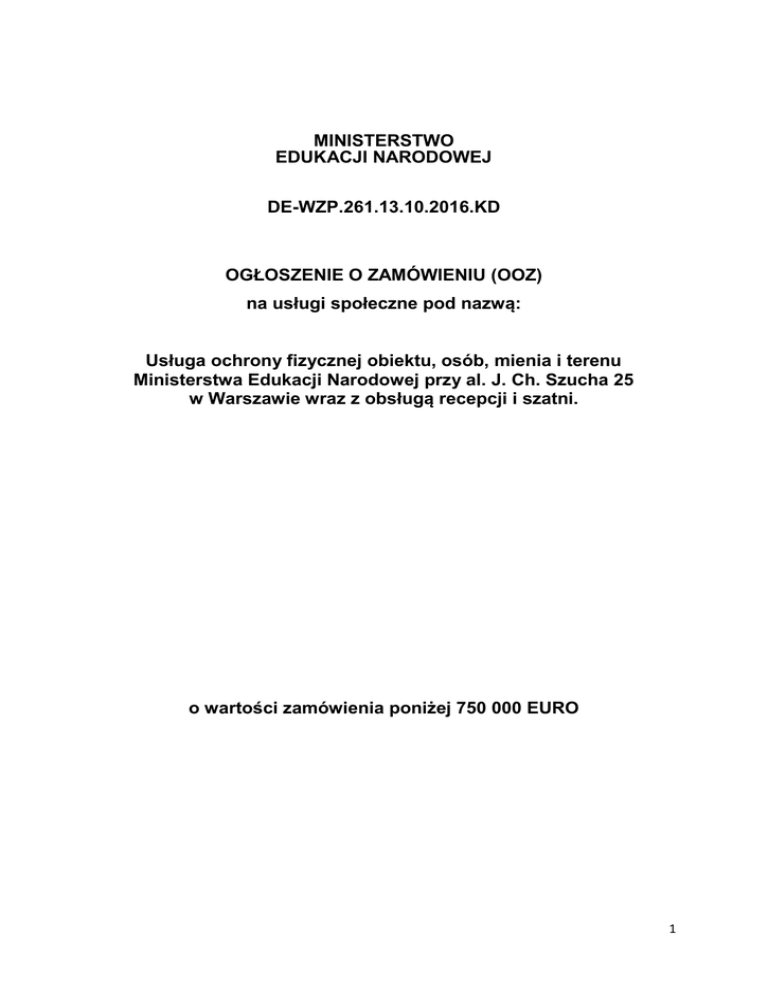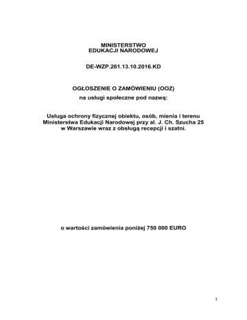 MINISTERSTWO EDUKACJI NARODOWEJ DE-WZP.261.13.10.2016.KD OGŁOSZENIE O ZAMÓWIENIU (OOZ) na usługi społeczne pod nazwą: Usługa ochrony fizycznej obiektu, osób, mienia i terenu Ministerstwa Edukacji Narodowej przy al. J. Ch. Szucha 25 w Warszawie wraz z obsługą recepcji i szatni. o wartości zamówienia poniżej 750 000 EURO 1 Rozdział 1 Informacje ogólne 1. Zamawiającym jest: Ministerstwo Edukacji Narodowej, al. J. Ch. Szucha 25, 00-918 Warszawa, NIP: 7010015610, REGON: 000177939. 2. Postępowanie prowadzi: Departament Ekonomiczny, tel.: (22) 34-74-192, (22) 34-74-242 fax.: (22) 621-50-10, pon. – pt. 8:15-16:15. 3. Postępowanie o udzielenie zamówienia prowadzone na jest na podstawie art. 138o w związku z art. 138g Rozdziału 6 „Zamówienia na usługi społeczne i inne szczególne usługi” ustawy z dnia 29 stycznia 2004 roku Prawo zamówień publicznych (Dz.U. z 2015 r. poz. 2164 ze zm.) zwanej dalej „ustawą”. 4. Postępowanie prowadzone jest w języku polskim. 5. Zamówienie nie jest współfinansowane ze środków Unii Europejskiej. Rozdział 2 Opis przedmiotu zamówienia 1. Przedmiotem zamówienia jest usługa ochrony fizycznej obiektu, osób, mienia i terenu Ministerstwa Edukacji Narodowej przy al. J. Ch. Szucha 25 w Warszawie wraz z obsługą recepcji i szatni. 2. Szczegółowy opis przedmiotu zamówienia został przedstawiony w Załączniku nr 1 Szczegółowy opis przedmiotu zamówienia (SOPZ) do OOZ oraz w Załączniku nr 2 Istotne postanowienia umowy (IPU) do OOZ. 3. Wspólny Słownik Zamówień (CPV): 79710000-4. 4. WYMAGANIA ZWIĄZANE Z REALIZACJĄ ZAMÓWIENIA DOT. ZATRUDNIENIA NA PODSTAWIE UMOWY O PRACĘ 1) Na podstawie art. 29 ust. 3a ustawy Zamawiający określa, iż wszelkie czynności bezpośrednio związane z realizacją przedmiotu zamówienia, mają być wykonywane przez osoby zatrudnione przez Wykonawcę lub jego podwykonawców na podstawie umowy o pracę zgodnie z ustawą z dnia 26 czerwca 1974 r. Kodeks pracy (Dz. U. z 2014 r. poz. 1502 z późn. zm.). Wymóg ten dotyczy osób wymienionych w § 3 ust. 2 IPU. 2) Sposobu dokumentowania zatrudnienia tych osób oraz uprawnienia Zamawiającego w zakresie kontroli spełniania przez Wykonawcę wymagań, o których mowa w art. 29 ust. 3a ustawy, sankcji z tytułu niespełnienia tych wymagań oraz rodzaj czynności niezbędnych do realizacji zamówienia, których dotyczą wymagania zatrudnienia na podstawie umowy o pracę przez Wykonawcę lub podwykonawcę osób wykonujących czynności w trakcie realizacji zamówienia określone zostały w IPU. 5. PODWYKONAWCY: 1) Zamawiający zgodnie z art. 36a ust. 2 pkt. 1 ustawy zastrzega obowiązek osobistego wykonania praz Wykonawcę usługi bezpośredniej ochrony fizycznej (z wyłączeniem grupy interwencyjnej, gdzie Zamawiający dopuszcza podwykonawstwo). 2) Jeżeli Wykonawca w zakresie określonym w ust. 1 zamierza powierzyć wykonanie zamówienia podwykonawcom jest zobowiązany umieścić w składanej ofercie informację o części zamówienia, które Wykonawca zamierza powierzyć podwykonawcom i podania firm podwykonawców. 3) Brak w ofercie informacji o części zamówienia, których wykonanie zamierza powierzyć podwykonawcom, jest rozumiane przez Zamawiającego jako wykonanie całego przedmiotu zamówienia samodzielnie. 2 Rozdział 3 Termin wykonania zamówienia Termin realizacji zamówienia: przez 24 miesiące od dnia podpisania umowy, lecz nie wcześniej niż od dnia 01.01.2017 roku. Rozdział 4 Warunki udziału w postępowaniu 1. O udzielenie zamówienia mogą się ubiegać Wykonawcy, co do których brak jest podstaw do wykluczenia z postępowania o udzielenie zamówienia na podstawie art. 24 ust. 1 pkt 12-23 oraz ust. 5 pkt. 1 z zastrzeżeniem art. 24 ust. 7-10 ustawy. 2. O udzielenie zamówienia mogą się ubiegać Wykonawcy, którzy spełniają warunki dotyczące: 1) kompetencji lub uprawnień do prowadzenia określonej działalności zawodowej, o ile wynika to z odrębnych przepisów – Zamawiający wymaga, aby Wykonawca posiadał niezbędną do wykonania zamówienia, ważną koncesję na prowadzenie działalności gospodarczej w zakresie usług ochrony osób i mienia, zgodnie z przepisami ustawy z dnia 22 sierpnia 1997 r. o ochronie osób i mienia (Dz. U. z 2014 r. poz 1099 z późn. zm.). 2) sytuacji ekonomicznej lub finansowej – Zamawiający wymaga, aby Wykonawca posiadał: ubezpieczenie od odpowiedzialności cywilnej w zakresie prowadzonej działalności gospodarczej związanej z przedmiotem zamówienia na kwotę nie mniejszą niż 500.000,00 zł (słownie: pięćset tysięcy złotych 00/100) na jedno i wszystkie zdarzenia; 3) zdolności technicznej lub zawodowej – w celu potwierdzenia spełnienia warunku Wykonawca zobowiązany jest wykazać, że dysponuje lub będzie dysponował 4 kwalifikowanymi pracownikami ochrony, którzy będą pełnić ochronę w siedzibie Zamawiającego, wpisanymi na „listę kwalifikowanych pracowników ochrony fizycznej” prowadzoną zgodnie z ustawą o ochronie osób i mienia. Zamawiający nie wymaga aby już na etapie składania ofert Wykonawca dysponował ww. osobami na podstawie zatrudnienia na umowę o pracę zgodnie z Kodeksem pracy. 3. Wykonawca winien samodzielnie spełniać warunki udziału w postępowaniu. W przypadku wykonawców wspólnie ubiegających się o zamówienie, wykonawca który będzie realizował zakres usługi dotyczący ochrony fizycznej musi spełniać warunki udziału w postępowaniu, określone w ust. 2 pkt 1, pozostałe warunki określone w ust. 2 musi spełniać każdy z wykonawców występujących wspólnie lub obaj łącznie (z zastrzeżeniem, że nie jest dopuszczalne sumowanie kwoty ubezpieczenia OC poszczególnych konsorcjantów). Rozdział 5 Wykaz dokumentów i oświadczeń, wymaganych przez Zamawiającego od Wykonawcy w celu potwierdzenia spełniania warunków udziału w postępowaniu oraz braku podstaw do wykluczenia 1. W celu potwierdzenia spełniania przez Wykonawców waru