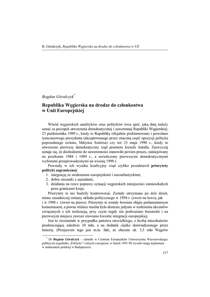 B. Góralczyk, Republika Węgierska na drodze do członkostwa w UE Bogdan Góralczyk* Republika Węgierska na drodze do członkostwa w Unii Europejskiej Wśród węgierskich analityków oraz polityków trwa spór, jaką datę należy uznać za początek utworzenia demokratycznej i suwerennej Republiki Węgierskiej: 23 października 1989 r., kiedy to Republikę oficjalnie proklamowano i powołano tymczasowego prezydenta (akceptowanego przez znaczną część opozycji polityka poprzedniego reżimu, Mátyása Szürösa) czy też 23 maja 1990 r., kiedy to utworzono pierwszy demokratyczny rząd premiera Jozsefa Antalla. Zazwyczaj uznaje się, że dochodzenie do suwerenności stanowiło pewien proces, zainicjowany na przełomie 1988 i 1989 r., a uwieńczony pierwszymi demokratycznymi wyborami przeprowadzonymi na wiosnę 1990 r. Powstały w ich wyniku koalicyjny rząd szybko przedstawił priorytety polityki zagranicznej: 1. integrację ze strukturami europejskimi i euroatlantyckimi, 2. dobre stosunki z sąsiadami, 3. działania na rzecz poprawy sytuacji węgierskich mniejszości zamieszkałych poza granicami kraju. Priorytety te nie budziły kontrowersji. Zostały utrzymane po dziś dzień, mimo zasadniczej zmiany układu politycznego w 1994 r. (zwrot na lewo), jak i w 1998 r. (zwrot na prawo). Priorytety te zostały bowiem objęte parlamentarnym konsensusem, a pewne różnice można było dostrzec jedynie w rozłożeniu akcentów związanych z ich realizacją, przy czym nigdy nie podważano hierarchii i na pierwszym miejscu zawsze stawiano kwestie integracji europejskiej. Jest to zrozumiałe w przypadku państwa niewielkiego, z liczbą mieszkańców przekraczającą zaledwie 10 mln, a na dodatek ciężko doświadczonego przez historię. (Przejawem tego jest m.in. fakt, że obecnie ok. 3,5 mln Węgrów * Dr Bogdan Góralczyk – adiunkt w Centrum Europejskim Uniwersytetu Warszawskiego; publicysta tygodnika „Polityka” i innych czasopism; w latach 1991-98 wysoki rangą dyplomata w ambasadzie polskiej w Budapeszcie. 117 Studia Europejskie, 4/1998 zamieszkuje w państwach ościennych; stąd priorytet trzeci.) W trakcie swej tysiącletniej historii Węgry zrozumiały, że (a) mały kraj musi dostosować się do warunków zewnętrznych; przy czym narodową tożsamość i suwerenność łatwiej mu będzie obronić w ramach większej społeczności niż w opozycji do niej oraz (b), że dzięki procesom integracji kraj będzie mógł przesunąć się z peryferii do centrum Europy.1 Premier Antall obejmując rządy jako strategiczny, wyjściowy cel polityki zagranicznej uznał odzyskanie pełnej suwerenności, co wymagało równoczesnych działań w dwóch kierunkach: (1) zerwania dotychczasowych więzi z „blokiem wschodnim” oraz (2) nawiązania i pogłębiania kontaktów ze światem zachodnim.2 Węgry dość szybko zrealizowały swe cele, jeśli chodzi o punkt pierwszy, gdyż już w czerwcu 1991 r. ich terytorium opuściły wojska radzieckie. Na dodatek, do końca tegoż roku nie istniały nie tylko RWPG i Układ Warszawski, ale nawet ZSRR. W takiej sytuacji można było skoncentrować się na zadaniach integracyjnych. 1. Nawiązanie stosunków dyplomatycznych i pierwsze porozumienia W oficjalnych, rządowych dokumentach wiąże się rozpoczęcie węgierskich kontaktów z Unią Europejską (Wspólnotami Europejskimi) z efektami „pierestrojki” Gorbaczowa i – będącego jej rezultatem – porozumienia pomiędzy WE a RWPG, podpisanego 22 czerwca 1988 r. w Luksemburgu.3 Porozumienie to umożliwiło państwom „bloku wschodniego” nawiązanie stosunków dyplomatycznych ze Wspólnotami. Węgry uczyniły to błyskawicznie i nawiązały takie stosunki już 8 sierpnia tego samego roku.4 Przedstawicielstwo Komisji Europejskiej w Budapeszcie, wraz z nadaniem mu przywilejów i immunitetów dyplomatycznych, utworzono jednak dopiero w 1990 r., po powołaniu rządu Antalla. Natomiast pierwszy ambasador węgierski przy Komisji, György Granasztói, złożył listy uwierzytelniające w Brukseli dopiero 6 października 1992 r., gdyż należało stworzyć tam zupełnie nową placówkę. W ślad za podpisaniem porozumienia o nawiązaniu stosunków dyplomatycznych, 26 września 1988 r. podpisano drugą, nie mniej ważną, umowę 1 Por. wypowiedzi A.Inotai w wywiadzie dla kwartalnika „Európai utas” („Europejski podróżny”), nr 2 1996, s.3-5. Prof. András Inotai, szef Strategicznej Grupy ds. Integracji, uważa, że integracja z UE stanowi dla Węgier wydarzenie co do ważności porównywalne z utworzeniem państwowości przed ponad tysiącem lat. 2 J.Debreczeni, A Miniszterelnök (Premier), Budapeszt 1998, s.216. 3 Hungary’s Relations with the European Communities. A brief historical survey, Ministry of Foreign Affairs, Budapest, August 1993. 4 Patrz Hungary’s Relations with the European Communities, Ministry of Foreign Affairs, Budapest, March 1994. 118 B. Góralczyk, Republika Węgierska na drodze do członkostwa w UE o handlu i wymianie gospodarczej. Węgry uczyniły to jako pierwszy kraj w regionie (Czechosłowacja w grudniu 1988 r., a Polska we wrześniu 1989 r.). Porozumienie to weszło w życie 1 grudnia 1988 r. i opiewało na lat dziesięć. W pierwszym roku jego realizacji (1989) na państwa EWG przypadało zaledwie 18% eksportu i 21% importu Węgier, ale już w 1992 r. wskaźniki przekroczyły odpowiednio 50 i 40%.5 Rola UE w węgierskim handlu bezustannie rosła, toteż w 1997 r. do państw Unii kierowano aż 71,2% eksportu, a towary stamtąd dostarczane stanowiły 62,6% węgierskiego importu.6 Unia szybko przekształciła się więc w najważniejszego partnera handlowego Węgier, przy czym w ramach rosnącej wymiany handlowej godne odnotowania są jeszcze co najmniej dwa fakty: – rozkład wymiany handlowej jest bardzo nierówny: zdecydowanie najpoważniejszym partnerem Węgier w ramach UE są Niemcy, po czym idą Włochy i Austria; – w ślad za wymianą handlową idą poważne in