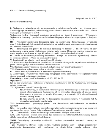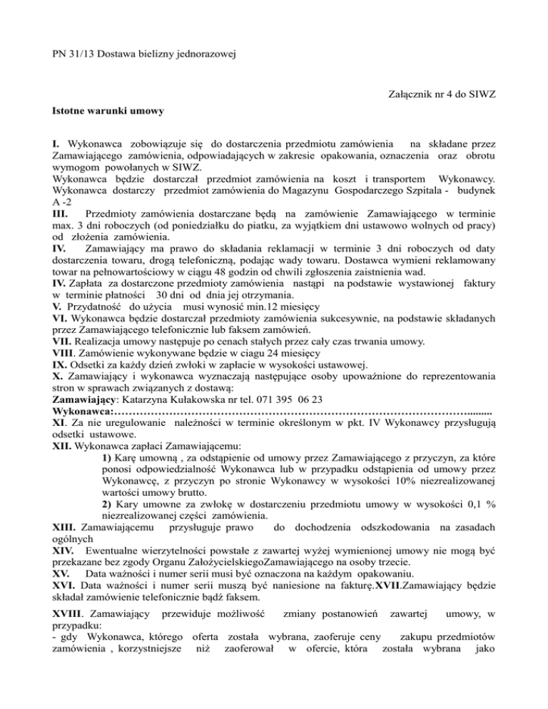PN 31/13 Dostawa bielizny jednorazowej Załącznik nr 4 do SIWZ Istotne warunki umowy I. Wykonawca zobowiązuje się do dostarczenia przedmiotu zamówienia na składane przez Zamawiającego zamówienia, odpowiadających w zakresie opakowania, oznaczenia oraz obrotu wymogom powołanych w SIWZ. Wykonawca będzie dostarczał przedmiot zamówienia na koszt i transportem Wykonawcy. Wykonawca dostarczy przedmiot zamówienia do Magazynu Gospodarczego Szpitala - budynek A -2 III. Przedmioty zamówienia dostarczane będą na zamówienie Zamawiającego w terminie max. 3 dni roboczych (od poniedziałku do piatku, za wyjątkiem dni ustawowo wolnych od pracy) od złożenia zamówienia. IV. Zamawiający ma prawo do składania reklamacji w terminie 3 dni roboczych od daty dostarczenia towaru, drogą telefoniczną, podając wady towaru. Dostawca wymieni reklamowany towar na pełnowartościowy w ciągu 48 godzin od chwili zgłoszenia zaistnienia wad. IV. Zapłata za dostarczone przedmioty zamówienia nastąpi na podstawie wystawionej faktury w terminie płatności 30 dni od dnia jej otrzymania. V. Przydatność do użycia musi wynosić min.12 miesięcy VI. Wykonawca będzie dostarczał przedmioty zamówienia sukcesywnie, na podstawie składanych przez Zamawiającego telefonicznie lub faksem zamówień. VII. Realizacja umowy następuje po cenach stałych przez cały czas trwania umowy. VIII. Zamówienie wykonywane będzie w ciagu 24 miesięcy IX. Odsetki za każdy dzień zwłoki w zapłacie w wysokości ustawowej. X. Zamawiający i wykonawca wyznaczają następujące osoby upoważnione do reprezentowania stron w sprawach związanych z dostawą: Zamawiający: Katarzyna Kułakowska nr tel. 071 395 06 23 Wykonawca:……………………………………………………………………………………......... XI. Za nie uregulowanie należności w terminie określonym w pkt. IV Wykonawcy przysługują odsetki ustawowe. XII. Wykonawca zapłaci Zamawiającemu: 1) Karę umowną , za odstąpienie od umowy przez Zamawiającego z przyczyn, za które ponosi odpowiedzialność Wykonawca lub w przypadku odstąpienia od umowy przez Wykonawcę, z przyczyn po stronie Wykonawcy w wysokości 10% niezrealizowanej wartości umowy brutto. 2) Kary umowne za zwłokę w dostarczeniu przedmiotu umowy w wysokości 0,1 % niezrealizowanej części zamówienia. XIII. Zamawiającemu przysługuje prawo do dochodzenia odszkodowania na zasadach ogólnych XIV. Ewentualne wierzytelności powstałe z zawartej wyżej wymienionej umowy nie mogą być przekazane bez zgody Organu ZałożycielskiegoZamawiającego na osoby trzecie. XV. Data ważności i numer serii musi być oznaczona na każdym opakowaniu. XVI. Data ważności i numer serii muszą być naniesione na fakturę.XVII.Zamawiający będzie składał zamówienie telefonicznie bądź faksem. XVIII. Zamawiający przewiduje możliwość zmiany postanowień zawartej umowy, w przypadku: - gdy Wykonawca, którego oferta została wybrana, zaoferuje ceny zakupu przedmiotów zamówienia , korzystniejsze niż zaoferował w ofercie, która została wybrana jako PN 31/13 Dostawa bielizny jednorazowej najkorzystniejsza. - zmiany obowiązującej stawki podatku od towarów i usług (VAT), ceny brutto określone w umowie ulegną odpowiedniej zmianie. Zmiana cen spowodowana wprowadzeniem ustawowej zmiany stawki podatku VAT. - zmiany cen urzędowych IX.Wykonawca zobowiązuje się do ciągłości dostaw przedmiotu umowy w sytuacji zagrożenia bezpieczeństwa Państwa i wojny. X. Zamawiający zażąda dostarczenia poświadczonych za zgodność z oryginałem certyfikatu oznaczenia znakiem CE lub/i deklarację zgodności .Powyższe dokumenty należy przesłać najpóźniej wraz z podpisaną umową do Zamawiającego. W przypadku niedostarczenia Zamawiającemu ww. dokumentów w pkt 2– Wykonawca zapłaci Zamawiającemu 50 zł kary za każdy dzień opóźnienia w dostarczeniu dokumentów. Upełnomocniony Przedstawiciel Wykonawcy ....................................................... ( data, pieczęć i podpis)