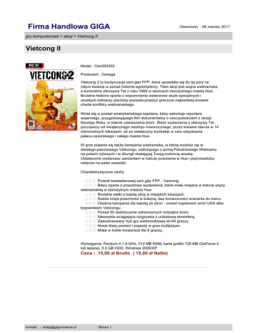 Firma Handlowa GIGA Utworzono : 08 marzec 2017 gry komputerowe > akcji > Vietcong II Vietcong II Model : Cen000303 Producent : Cenega Vietcong 2 to kontynuacja serii gier FPP, która sprzedała się do tej pory na całym świecie w ponad milionie egzemplarzy. Tłem akcji jest wojna wietnamska, a konkretnie ofensywa Tet z roku 1968 w okolicach starożytnego miasta Hue. Brutalna historia oparta o wspomnienia weteranów służb specjalnych i zwykłych żołnierzy piechoty pozwala przeżyć graczowi najbardziej krwawe chwile konfliktu wietnamskiego. Wciel się w postać amerykańskiego kapitana, który eskortuje reportera wojennego, przygotowującego film dokumentalny o uroczystościach z okazji Nowego Roku, w trakcie zawieszenia broni. Śledź wydarzenia z ofensywy Tet począwszy od świątecznego nastroju noworocznego, przez krwawe starcia w 14 różnorodnych lokacjach, aż po ostateczny kontratak w celu odzyskania pałacu cesarskiego i całego miasta Hue. W grze pojawia się także kampania wietnamska, w której wcielisz się w młodego poborowego Vietcongu, walczącego z armią Południowego Wietnamu na polach ryżowych i w dżungli okalającej Twoją rodzinną wioskę. Ostatecznie zostaniesz sierżantem w trakcie powstania w Hue i poprowadzisz natarcie na pałac cesarski. Charakterystyczne cechy ��� Powrót bestsellerowej serii gier FPP - Vietcong. ��� Bitwy oparte o prawdziwe wydarzenia, które miały miejsce w trakcie wojny wietnamskiej w starożytnym mieście Hue. ��� Brutalne walki o każdą ulicę w miejskich lokacjach. ��� Każda misja przechodzi w kolejną, bez konieczności wracania do menu. ��� Osobna kampania dla każdej ze stron - zostań kapitanem armii USA albo bojownikiem Vietcongu. ��� Ponad 50 realistycznie odtworzonych rodzajów broni. ��� Niezwykle wciągająca rozgrywka z unikatową atmosferą. ��� Zaawansowany tryb gry wieloosobowej do 64 graczy ��� Nowe klasy postaci i pojazdy w grze multiplayer. ��� Misje w trybie kooperacji dla 8 graczy. Wymagania: Pentium 4 1.8 GHz, 512 MB RAM, karta grafiki 128 MB (GeForce 4 lub lepsza), 3.5 GB HDD, Windows 2000/XP Cena : 15,00 zł Brutto ( 15,00 zł Netto) kontakt : - [email protected] Strona 1