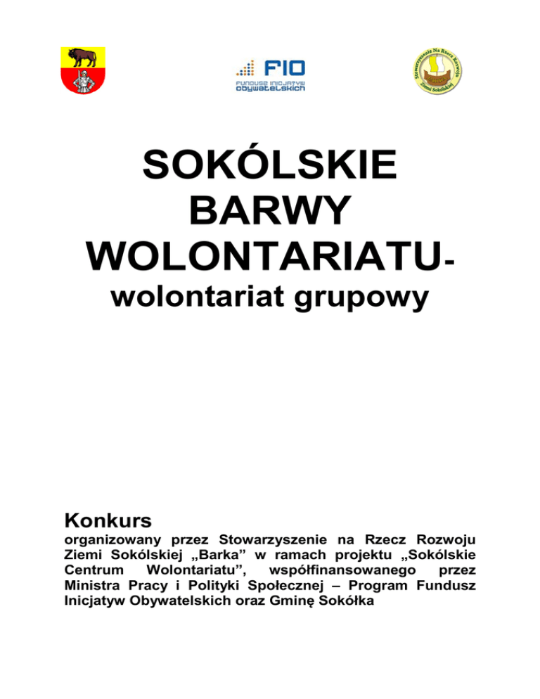 SOKÓLSKIE BARWY WOLONTARIATUwolontariat grupowy Konkurs organizowany przez Stowarzyszenie na Rzecz Rozwoju Ziemi Sokólskiej „Barka” w ramach projektu „Sokólskie Centrum Wolontariatu”, współfinansowanego przez Ministra Pracy i Polityki Społecznej – Program Fundusz Inicjatyw Obywatelskich oraz Gminę Sokółka REGULAMIN KONKURSU „ SOKÓLSKIE BARWY WOLONTARIATU – wolontariat grupowy” ZAŁOŻENIA PROGRAMOWE Wolontariat nigdy nie przemija i zawsze jest czas oraz potrzeba pomocy drugiemu człowiekowi, a także bycia aktywnym obywatelem w swoim środowisku lokalnym. Jesteśmy pewni, że konkurs stworzy możliwość do zaprezentowania ciekawych sylwetek wolontariuszy, wyjątkowych akcji wolontarystycznych, podzielenia się swoimi refleksjami na temat tej formy działalności oraz pozwoli zdobyć podstawową wiedzę o tym, co to znaczy wolontariat, a przede wszystkim przekona, że warto być wolontariuszem. Promocja działań wolontarystycznych będzie służyć utrwalaniu jej znaczenia we współczesnym świecie, przyczyni się do zwiększania społecznych motywacji do działań na rzecz innych, włączania się w proces tworzenia, a tym samym decydowania o otaczającej nas rzeczywistości. Serdecznie zapraszamy wszystkie szkoły i przedszkola naszej gminy do wzięcia udziału w konkursie. Konkurs zakończy Gala „ Sokólskie Barwy Wolontariatu”, podczas której zaprezentowana będzie mobilna wystawa fotograficzna „Wolontariat uchwycony w kadrze”. Odbędą się występy muzyczne lokalnych solistów i zespołów. Spotkanie podsumuje projekt, ale przede wszystkim będzie służyło budowaniu pozytywnego wizerunku wolontariatu i wolontariusza w środowisku. ORGANIZATORZY KONKURSU Organizatorem konkursu jest Stowarzyszenie na Rzecz Rozwoju Ziemi Sokólskiej „ Barka”. ADRESACI KONKURSU Konkurs skierowany jest do Klubów Wolontariusza w przedszkolach i szkołach z siedzibą w gm. Sokółka i obejmujących zasięgiem swego działania co najmniej gminę Sokółka. Uczestnikami mogą być kluby już istniejące lub nowo powstałe. Każda placówka może złożyć jedno zgłoszenie do konkursu. ZASADY UCZESTNICTWA I TERMIN ZGŁASZANIA PROJEKTÓW Udział w konkursie polega na: 1. złożeniu w biurze Organizatora (Sokółka ul. Mickiewicza 2a pok. 08) wypełnionego i podpisanego formularza zgłoszeniowego do konkursu, w wersji papierowej, stanowiącego załącznik do regulaminu konkursu, który można pobrać ze strony internetowej www.barka.internetdsl.pl; 2. opracowaniu i zrealizowaniu projektu, którego celem będzie rozwijanie kompetencji społeczno-obywatelskich dzieci i młodzieży poprzez podejmowanie w ramach Przedszkolnego lub Szkolnego Klubu Wolontariusza działań polegających na pomocy osobom potrzebującym, 3. złożeniu w biurze Organizatora wypełnionego i podpisanego formularza opisu projektu, w wersji papierowej oraz elektronicznej, zapisanego na płycie CD lub DVD, stanowiącego załącznik do regulaminu konkursu, który można pobrać ze strony internetowej www.barka.internetdsl.pl wraz z dołączoną dokumentacją zdjęciową (min. 5 zdjęć) w formie elektronicznej, zapisanej na tym samym nośniku. Każda placówka, która zgłosi udział w konkursie, otrzyma aparat fotograficzny i komplet materiałów plastyczno-dekoracyjnych, które należy wykorzystać do podjętych działań oraz przygotowania dokumentacji zdjęciowej. Po zakończeniu konkursu aparaty fotograficzne zostaną protokolarnie przekazane szkołom i przedszkolom do wykorzystania w dalszej działalności wolontarystycznej. Przesłane zdjęcia zostaną wykorzystane uchwycony w kadrze”. do zorganizowania wystawy „Wolontariat Uczestnik konkursu składając swój podpis na formularzu zgłoszeniowym jednocześnie: 1. wyraża zgodę na udział w konkursie, 2. wyraża zgodę na nieodpłatne korzystanie z przekazanych materiałów przez Organizatora, 3. posiada zgodę wszystkich osób, których wizerunek jest przedstawiony w przekazanych materiałach, na jego nieodpłatne wykorzystanie przez Organizatora zgodnie z Ustawą o prawie autorskim i prawach pokrewnych. Każda z osób, których dane osobowe mają być przetwarzane w związku z przeprowadzeniem konkursu, podpisuje oświadczenie o wyrażeniu zgody na przetwarzanie danych osobowych przez Stowarzyszenie na Rzecz Rozwoju Ziemi Sokólskiej „Barka”. Podanie danych jest dobrowolne, aczkolwiek odmowa ich podania jest równoznaczna z brakiem możliwości udziału projektu w konkursie. Administratorem danych osobowych przetwarzanych w związku z przeprowadzeniem konkursu jest Stowarzyszenie na Rzecz Rozwoju Ziemi Sokólskiej „Barka”, z siedzibą w Sokółce ul. Mickiewicza 2a. Dane osobowe będą przetwarzane wyłącznie w celu przeprowadzenia konkursu. Osoby, których dane będą przetwarzane, mają prawo dostępu do treści swoich danych oraz ich poprawiania. Organizator nie zwraca nadesłanych materiałów. Termin składania formularzy zgłoszeniowych upływa 25 września 2015r. Decyduje data wpłynięcia zgłoszenia do biura Organizatora. KRYTERIA OCENY ZGŁOSZEŃ Ocena zgłoszonych projektów będzie dokonana przez Jury w składzie określonym przez Organizatora. Ocenie będzie podlegać: zaangażowanie, innowacyjność, skuteczność. Promowana będzie współpraca dzieci i młodzieży z nauczycielami i rodzicami. Projekty zostaną ocenione i nagrodzone oddzielnie w każdej grupie wiekowej: przedszkola, szkoły podstawowe, gimnazjalne i ponadgimnazjalne. ROZSTRZYGNIĘCIE KONKURSU Do dnia 18 listopada 2015r. należy złożyć formularz opisu projektu wraz z dokumentacją zdjęciową. Decyduje data wpływu do biura Organizatora. Komisja konkursowa do dnia 30 listopada 2015r. wskaże zwycięzców konkursu oraz przyzna nagrody rzeczowe. Laureaci konkursu oraz wyniki ich pracy zaprezentowane zostaną podczas uroczystej Gali „Sokólskich Barw Wolontariatu” w grudniu 2015r. Dodatkowych informacji udziela Krystyna Stefanowicz pod nr tel