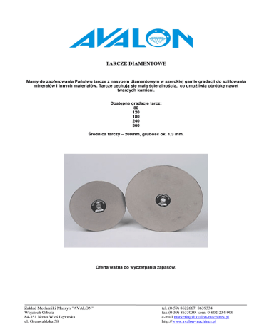 TARCZE DIAMENTOWE Mamy do zaoferowania Państwu tarcze z nasypem diamentowym w szerokiej gamie gradacji do szlifowania minerałów i innych materiałów. Tarcze cechują się małą ścieralnością, co umożliwia obróbkę nawet twardych kamieni. Dostępne gradacje tarcz: 80 120 180 240 360 Średnica tarczy – 200mm, grubość ok. 1,3 mm. Oferta ważna do wyczerpania zapasów. Zakład Mechaniki Maszyn "AVALON" Wojciech Gibuła 84-351 Nowa Wieś Lęborska ul. Grunwaldzka 38 tel. (0-59) 8622667, 8639334 fax (0-59) 8633039, kom. 0-602-234-909 e-mail [email protected] http://www.avalon-machines.pl