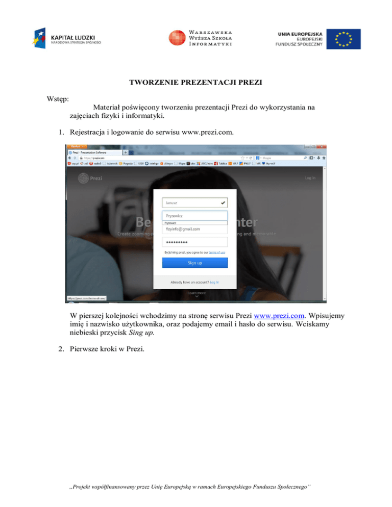 TWORZENIE PREZENTACJI PREZI Wstęp: Materiał poświęcony tworzeniu prezentacji Prezi do wykorzystania na zajęciach fizyki i informatyki. 1. Rejestracja i logowanie do serwisu www.prezi.com. W pierszej kolejności wchodzimy na stronę serwisu Prezi www.prezi.com. Wpisujemy imię i nazwisko użytkownika, oraz podajemy email i hasło do serwisu. Wciskamy niebieski przycisk Sing up. 2. Pierwsze kroki w Prezi. „Projekt współfinansowany przez Unię Europejską w ramach Europejskiego Funduszu Społecznego” Po zalogowaniu się (rejestracji), naszym oczom ukazuje się ekran Your prezis. Jest on oczywiście pusty. Z prawej strony znajdziemy kolejne menu Lern & Support w którym znajdziemy film edukacyjny, opisujący tworzenie prezentacji. Obejrzyjmy ten film. Po obejrzeniu filmu wracamy do menu Your prezis i wciskamy położone po prawej stronie menu niebieskie pole New prezi. 3. Pierwsza prezentacja. Otwiera się okno z templatkami Prezi (szablonami). Wybieramy interesujący nas szablon i wciskamy niebieskie pole Use template. „Projekt współfinansowany przez Unię Europejską w ramach Europejskiego Funduszu Społecznego” Jest to ekran główny prezentacji. Do nawigacji służą przyciski myszy oraz kółko myszy. Poćwiczmy aby zobaczyć efekt ich działania. Następnie w lewym górnym narożniku kliknijmy niebieskie pole Present i sprawdźmy działanie przycisków i kółka myszy. Na koniec wybieramy klawisz Esc na klawiaturze. 4. Opcje prezentacji. Edit – pozwala na edycję prezentacji, Share – udostępnia dokument np. do sprawdzenia przez nauczyciela, Zegar – ustawienie czasu prezentacji. Wróćmy do edycji wciskając przycisk Edit. 5. Edytcja elementów prezentacji. „Projekt współfinansowany przez Unię Europejską w ramach Europejskiego Funduszu Społecznego” Klikając na ramkę, ramka przybliży się ułatwiając edycję. Korzystając z przycisku Edit Path, możemy ustawić kolejność wyświetlania slajdów. Rozwijając trzy górne menu, za pomocą Insert możemy wstawić obrazek, muzykę i inne elementy, zaś z Frames & Arrows, kolejne slajdy do prezentacji. Tworząc prezentację, od czasu do czasu wciskajmy przycisk zapisz (dyskietka). Na konie wciśnijmy przycisk Exit. Wracamy do strony głównej Prezi. 6. Zarządzanie prezentacjami. Klikając menu Your prezis i All prezis zobaczymy wszystkie stworzone przez nas prezentacje. Klikając dwukrotnie na prezentacji, możemy uruchomić naszą prezentację i rozpocząć pokaz. Otwierając narzędzie wskazane trzecią strzałką, udostępnimy prezentację znajomym albo do sprawdzenia przez nauczyciela. „Projekt współfinansowany przez Unię Europejską w ramach Europejskiego Funduszu Społecznego” Zakończenie: Mam nadzieję, że korzystając z tego materiału, będziecie mogli sprawnie uruchomić serwis Prezi w którym można będzie umieszczać treści z fizyki. Autorzy: Janusz Pryzowicz Emilia Szmigielska „Projekt współfinansowany przez Unię Europejską w ramach Europejskiego Funduszu Społecznego”