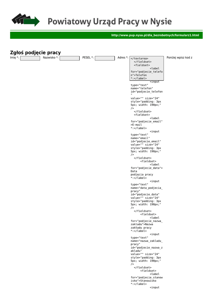 http://www.pup.nysa.pl/dla_bezrobotnych/formularz1.html Zgłoś podjęcie pracy Imię *: Nazwisko *: PESEL *: Adres *: </textarea> </fieldset> <fieldset> <label for="podjecie_telefo n">Telefon *:</label> <input type="text" name="telefon" id="podjecie_telefon " value="" size="24" style="padding: 3px 5px; width: 190px;" /> </fieldset> <fieldset> <label for="podjecie_email" >E-mail *:</label> <input type="text" name="email" id="podjecie_email" value="" size="24" style="padding: 3px 5px; width: 190px;" /> </fieldset> <fieldset> <label for="podjecie_data"> Data podjęcia pracy *:</label> <input type="text" name="data_podjecia_ pracy" id="podjecie_data" value="" size="24" style="padding: 3px 5px; width: 190px;" /> </fieldset> <fieldset> <label for="podjecie_nazwa_ zakladu">Nazwa zakładu pracy *:</label> <input type="text" name="nazwa_zakladu_ pracy" id="podjecie_nazwa_z akladu" value="" size="24" style="padding: 3px 5px; width: 190px;" /> </fieldset> <fieldset> <label for="podjecie_stanow isko">Stanowisko *:</label> <input Poniżej wpisz kod z type="text" name="stanowisko" id="podjecie_stanowi sko" value="" size="24" style="padding: 3px 5px; width: 190px;" /> </fieldset> <fieldset> <label for="podjecie_adres" >Adres korespondecyjny **:</label> <textarea name="adres_korespon dencyjny" id="podjecie_adres" class="form_input" style="height:100px; "> obrazka *: Wyślij Wyczyść * - pola wymagane, dane muszą być zgodne z podanymi w czasie rejestracji ** - proszę wpisać adres na który ma być wysłana decyzja. Jeśli jest taki sam jak adres zamieszkania, to proszę pozostawić puste pole Powiatowy Urząd Pracy w Nysie na podstawie zgłoszenia prześle decyzję o utracie statusu bezrobotnego na wskazany adres podany w czasie rejestracji. W przypadku nieotrzymania decyzji w przeciągu 30 dni skontaktuj się z nami pod numerem 774.489.918 Urząd zastrzega sobie możliwość telefonicznej weryfikacji danych.