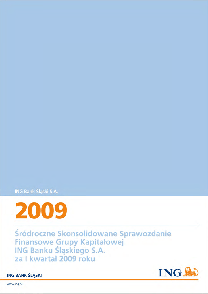 Śródroczne skonsolidowane sprawozdanie finansowe Grupy Kapitałowej ING Banku Śląskiego S.A. za I kwartał 2009 roku Spis treści I. Skonsolidowane sprawozdanie finansowe……………………………………………. 1. Skonsolidowany rachunek zysków i strat……………………………………….......... 2. Skonsolidowane sprawozdanie z całkowitych dochodów…………………............... 3. Skonsolidowane sprawozdanie z sytuacji finansowej.............................................. 3. Zestawienie zmian w skonsolidowanym kapitale własnym………………………….. 4. Skonsolidowany rachunek przepływów pienięŜnych……..………………………….. II. NajwaŜniejsze osiągnięcia Grupy Kapitałowej ING Banku Śląskiego S.A. w I kwartale 2009 r.….……………………………………………………………………… III. Wyniki finansowe…………………………………………………………………………… IV. Rozwój biznesu ……………………………………………………………………………... 1. Bankowość Detaliczna…………………………………………………………………… 2. Bankowość Korporacyjna……………………………………………………………….. 3. Elektroniczne kanały dystrybucji………………………………………………………... 4. Wskazanie czynników, które mogą mieć wpływ na wyniki finansowe w kolejnych kwartałach………………………………………………………………………………… V. Informacje uzupełniające…………………...……………………………………………… 1. Informacje o Banku i Grupie Kapitałowej …………………………………………....... 2. Zgodność z Międzynarodowymi Standardami Sprawozdawczości Finansowej…… 3. Wartości szacunkowe……………………...…………………………………………… 4. Porównywalność danych finansowych………………………………………………… 5. Dane uzupełniające do skonsolidowanego rachunku zysków i strat i skonsolidowanego sprawozdania z sytuacji finansowej ……………………………….. 6. Jakość portfela kredytowego…………………………………………………………… 7. Pozycje pozabilansowe………………………………………………………………… 8. Emisje, wykup i spłaty dłuŜnych i kapitałowych papierów wartościowych………… 9. Wypłacone dywidendy………………………………………………………………….... 10. Nabycie lub zbycie pozycji rzeczowych aktywów trwałych………….……………… 11. Rozliczenia z tytułu spraw spornych …………………………………………………. 12. Sezonowość lub cykliczność działalności……………………….…………………… 13. Istotne zdarzenia po zakończeniu okresu ……………………………………………. 14. Transakcje z jednostkami powiązanymi………………………………………………. 15. Segmentacja osiągniętych przychodów i wyników finansowych Grupy…………… 16. Wybrane dane finansowe ze sprawozdania finansowego………………………....... VI. Jednostkowe sprawozdanie finansowe…………………………………………………. 1 1 2 3 4 5 6 9 13 13 18 20 21 21 21 25 26 30 32 37 37 38 38 38 38 39 39 39 42 47 48 Śródroczne skonsolidowane sprawozdanie finansowe Grupy Kapitałowej ING Banku Śląskiego S.A. za I kwartał 2009 roku I. Skonsolidowane sprawozdanie finansowe SKONSOLIDOWANY RACHUNEK ZYSKÓW I STRAT (w tys. zł) Numer noty I kwartał 2009 I kwartał 2008 okres od 01.01.2009 do 31.03.2009 okres od 01.01.2008 do 31.03.2008 Przychody z tytułu odsetek 1 859 302 730 004 Koszty odsetek 1 -549 766 -467 058 1 309 536 262 946 Przychody z tytułu prowizji 2 225 994 229 671 Koszty prowizji 2 -22 100 -23 004 2 203 894 206 667 -4 834 222 41 042 93 533 Wynik z tytułu odsetek Wynik z tytułu prowizji Wynik na inwestycyjnych aktywach finansowych Wynik na instrumentach finansowych wycenianych przez rachunek zysków i strat oraz rewaluacja 3 Wynik na pozostałej działalności podstawowej Wynik na działalności podstawowej Koszty działania banku 4 Wynik na pozostałych przychodach i kosztach operacyjnych 7 951 6 496 557 589 569 864 -361 659 -364 422 -1 037 -2 085 Odpisy na utratę wartości aktywów finansowych i rezerwy na zobowiazania pozabilansowe 5 -102 079 -699 Udział w zyskach netto jednostek stowarzyszonych wycenianych metodą praw własności 6 10 100 11 616 214 274 Zysk (strata) brutto 102 914 Podatek dochodowy -22 119 -40 588 Zysk (strata) netto 80 795 173 686 80 821 173 683 -26 3 13 010 000 13 010 000 80 821 173 683 6,21 13,35 - przypadający na akcjonariuszy jednostki dominującej - przypadający na udziały mniejszości Średnia waŜona liczba akcji zwykłych Zysk (strata) netto przypadający na akcjonariuszy jednostki dominujacej Zysk (strata) na jedną akcję zwykłą (w zł) 1 Śródroczne skonsolidowane sprawozdanie finansowe Grupy Kapitałowej ING Banku Śląskiego S.A. za I kwartał 2009 roku SKONSOLIDOWANE SPRAWOZDANIE Z CAŁKOWITYCH DOCHODÓW Numer noty Zysk (strata) netto Zyski/straty z rewaluacji aktywów finansowych dostępnych do sprzedaŜy odniesione na kapitał własny Przeniesienie na wynik finansowy w wyniku sprzedaŜy aktywów finansowych z portfela dostępnych do sprzedaŜy Korekta wyceny papierów reklasyfikowanych z portfela dostępnych do sprzedaŜy do portfela kredytów i naleŜności Zbycie środków trwałych Efektywna część powiązania zabezpieczającego w rachunkowości zabezpieczeń przepływów pienięŜnych Przywrócenie kapitału zapasowego w związku ze wstrzymaniem likwidacji spółki zaleŜnej Inne całkowite dochody netto Całkowity dochód za okres sprawozdawczy (w tys. zł) I kwartał 2009 I kwartał 2008 okres od 01.01.